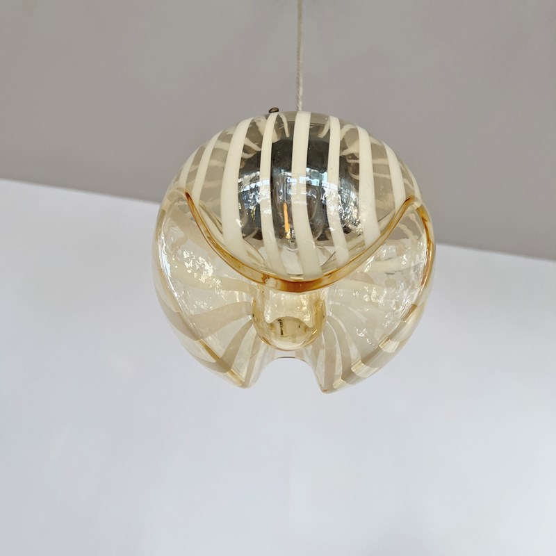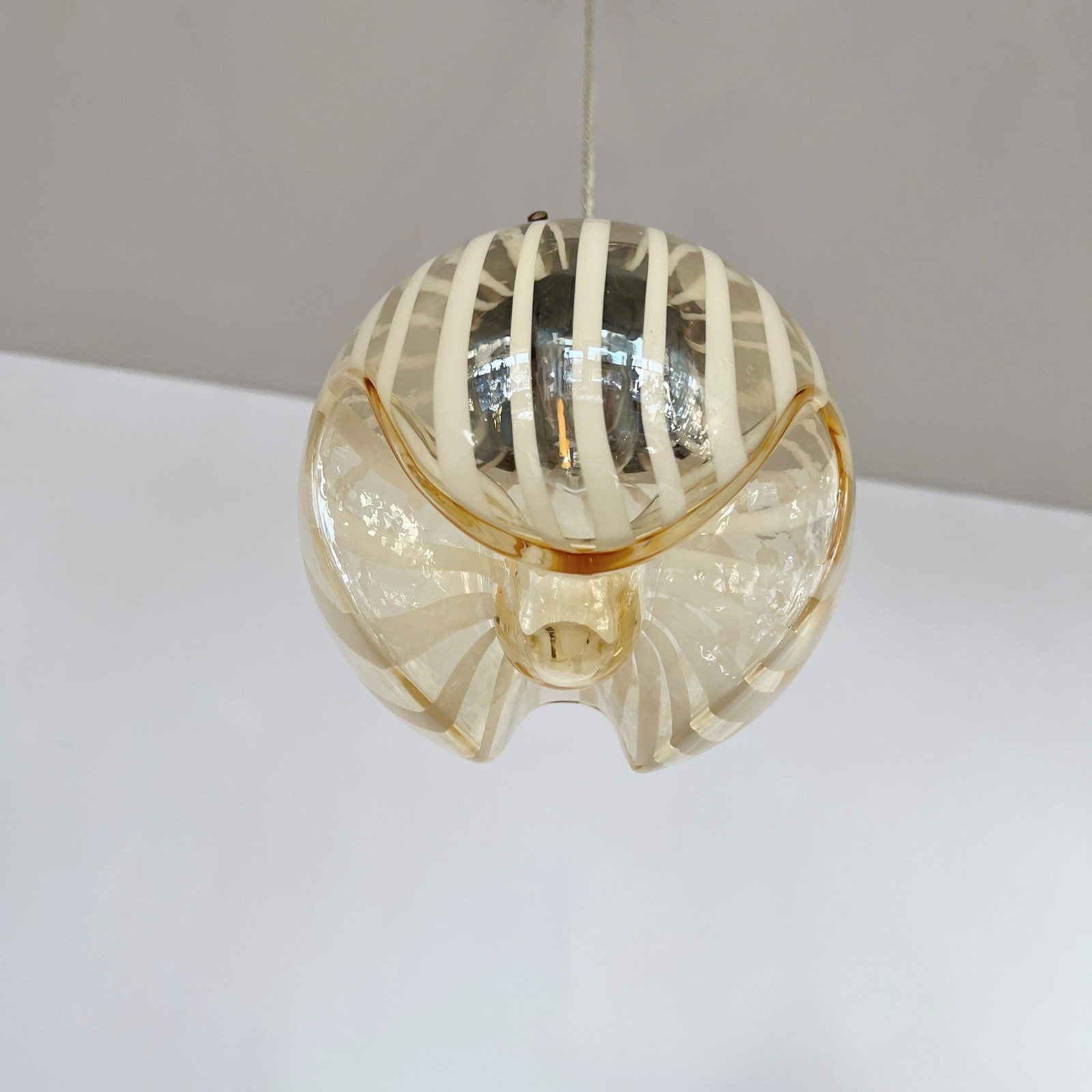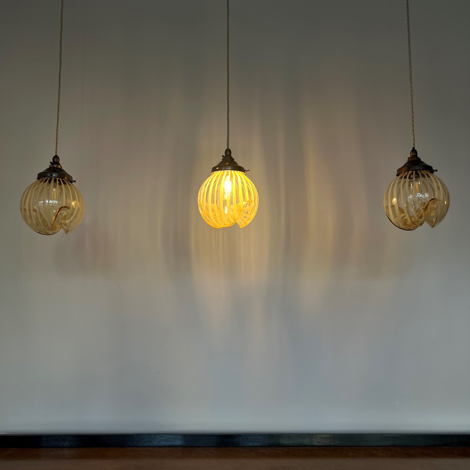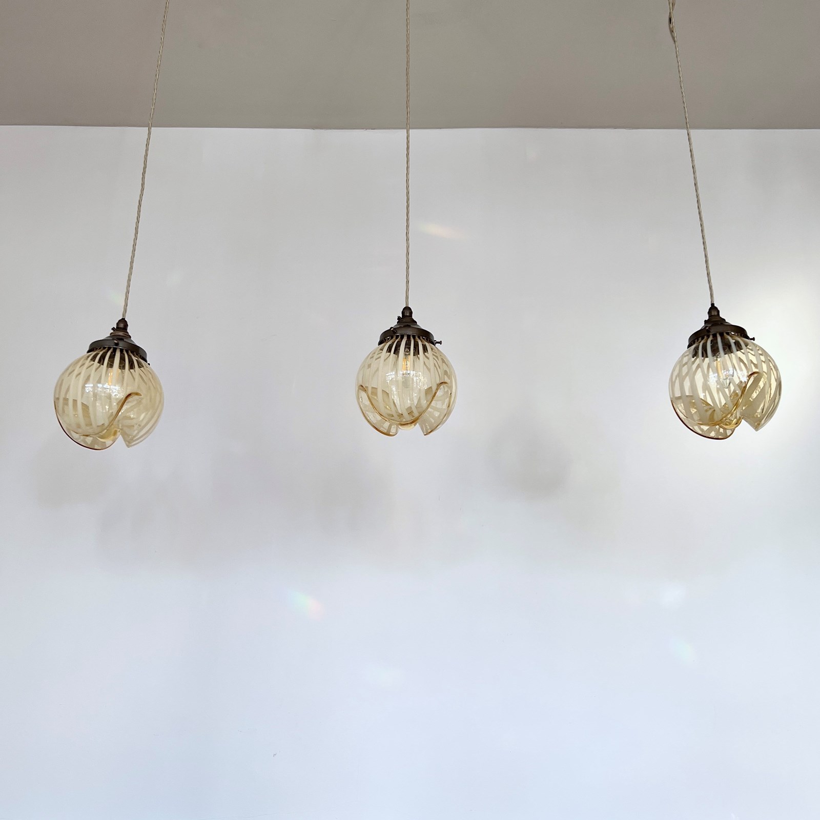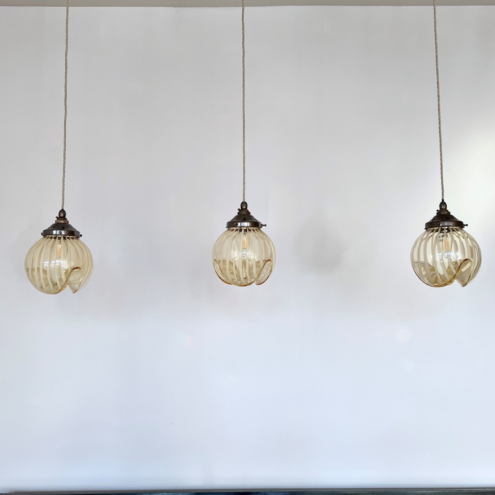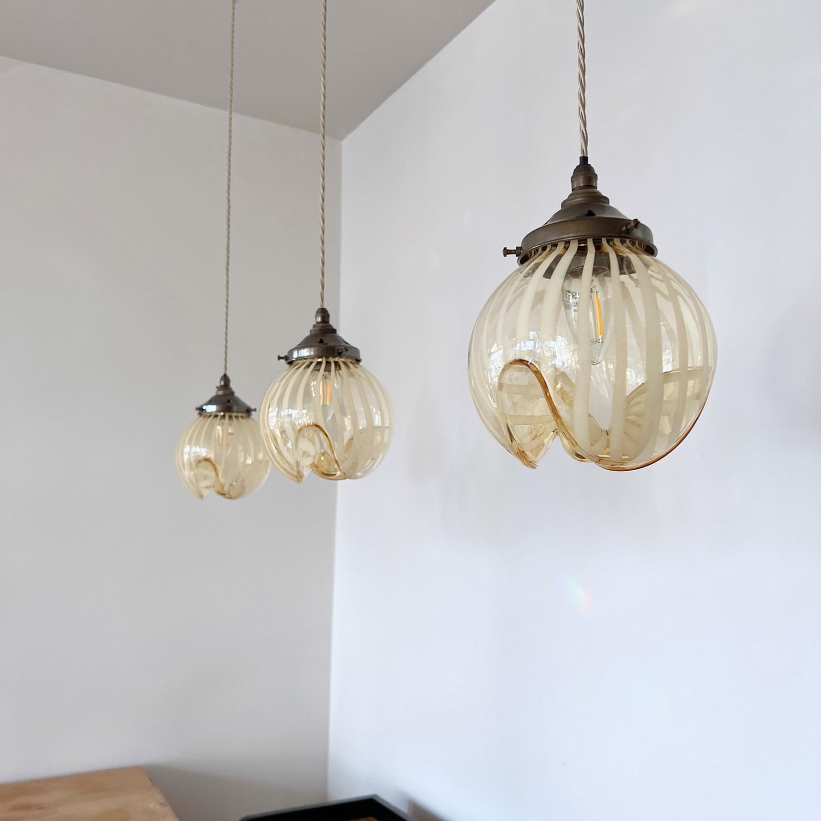 Beautiful Murano enclosed glass shades with striped amber glass detail. Each rewired with an antique brass fitting and beige braided cable. Each shade requires one B22 lamp. The coloured braided flex can be changed to your preference and a matching ceiling fitting is supplied.