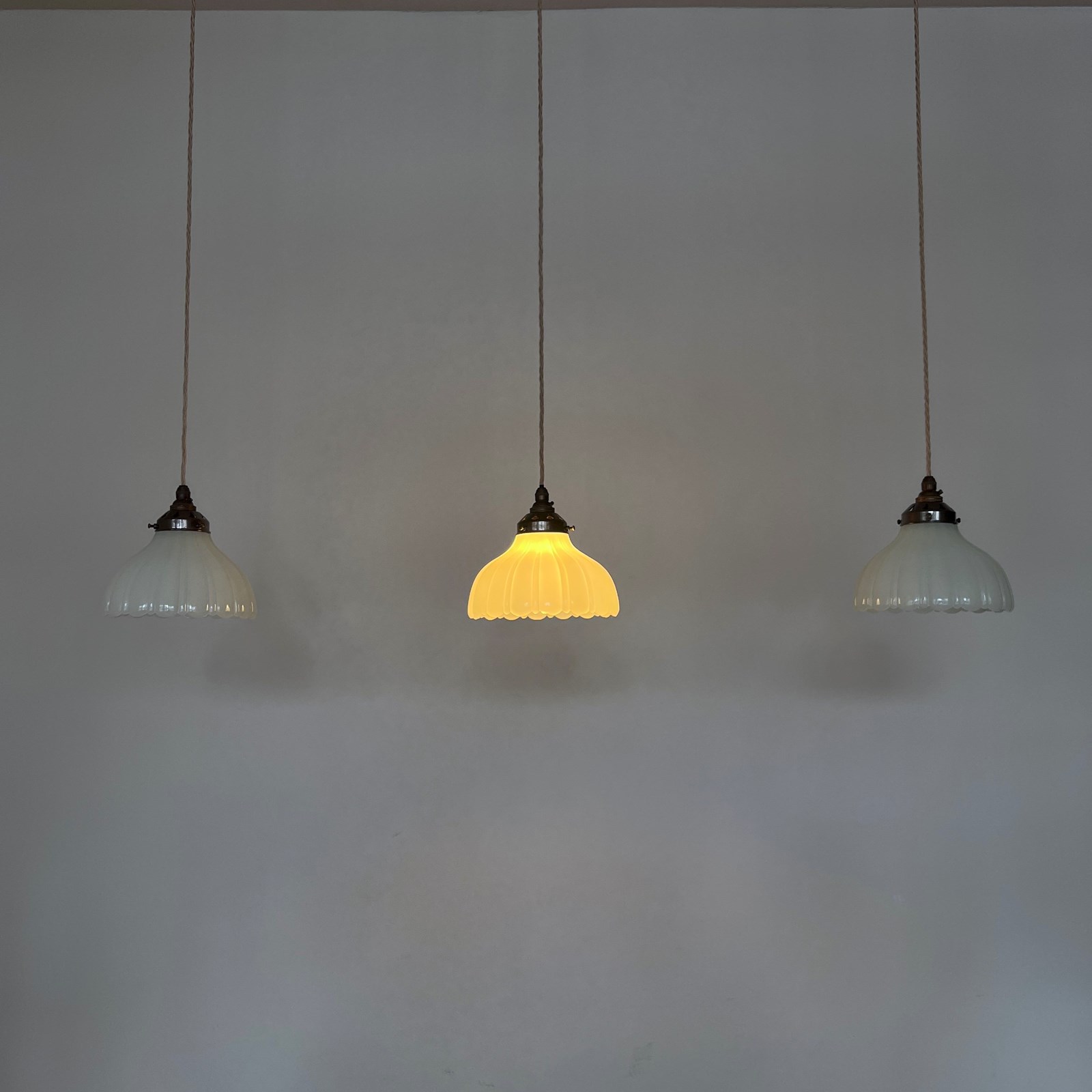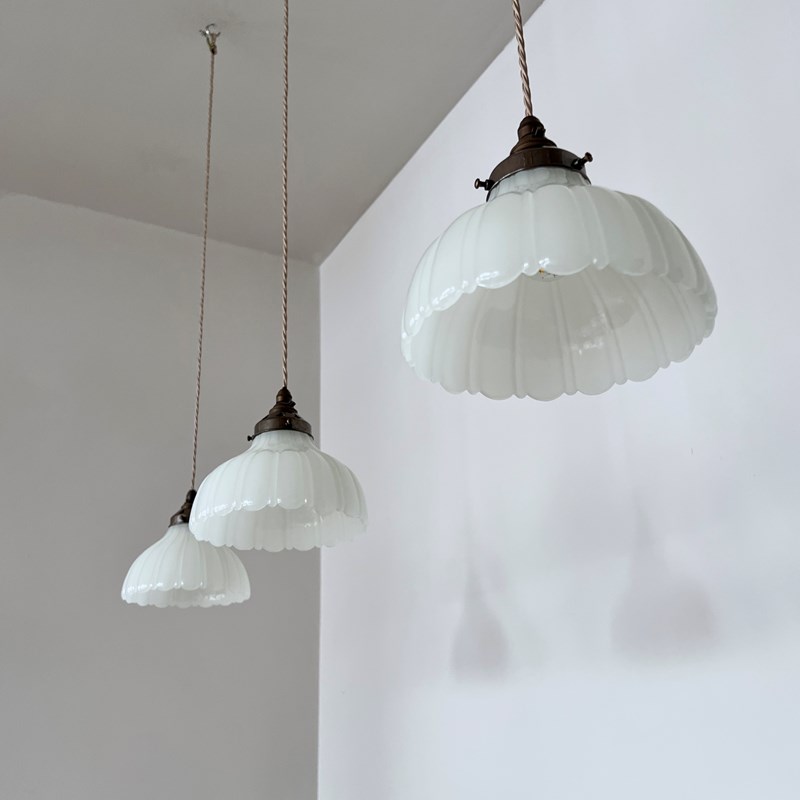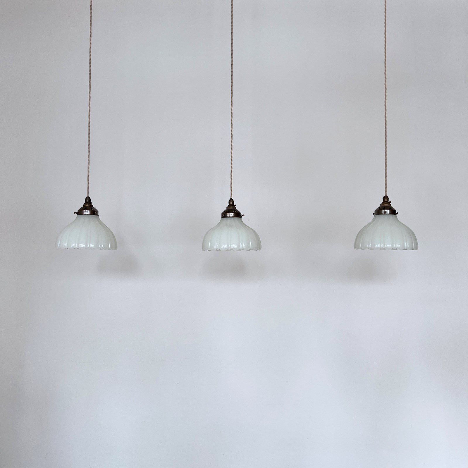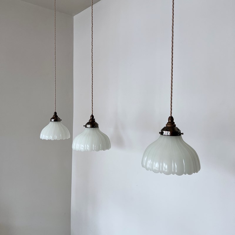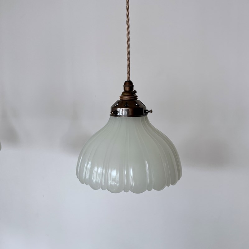 Three Moonstone Jefferson glass shades. Each rewired with an antique brass finish fitting and pigeon braided flex. Each shade requires one B22 lamp, these are not included but can be supplied. The coloured flex can be changed to your preference and a matching ceiling fitting is supplied.