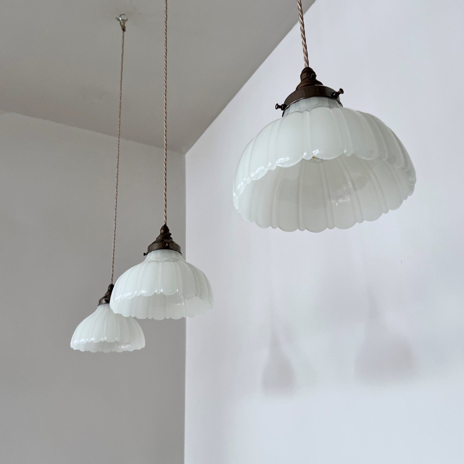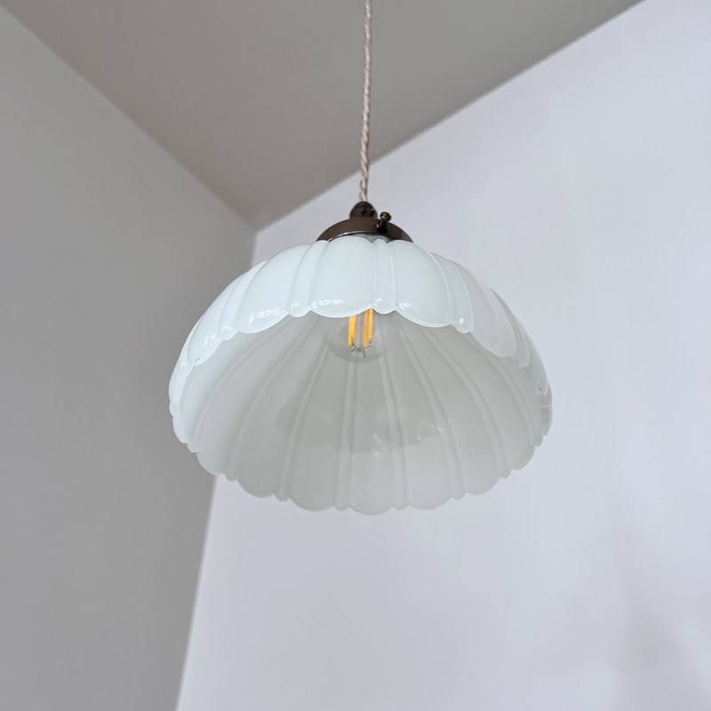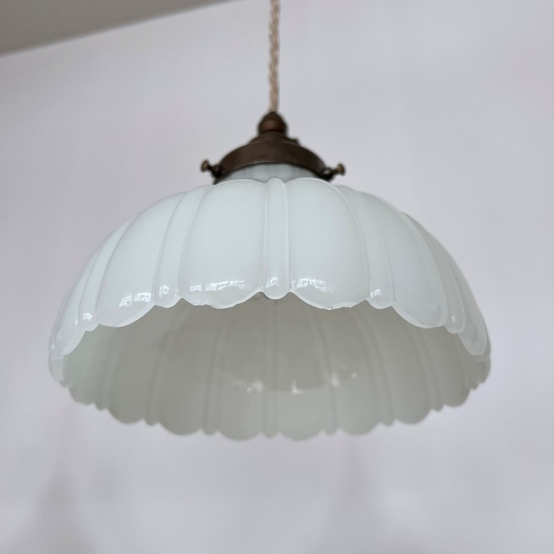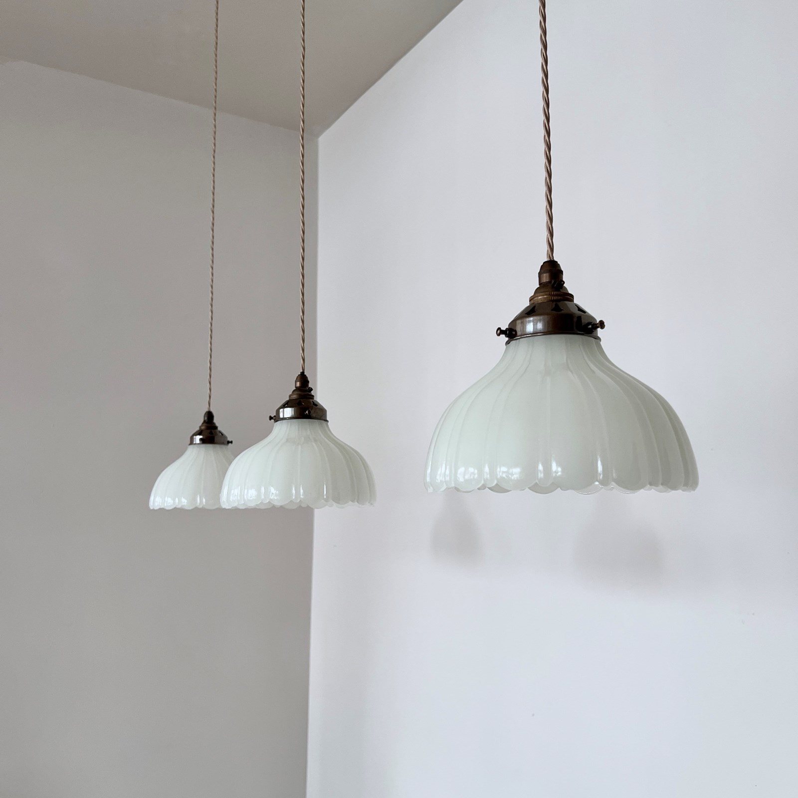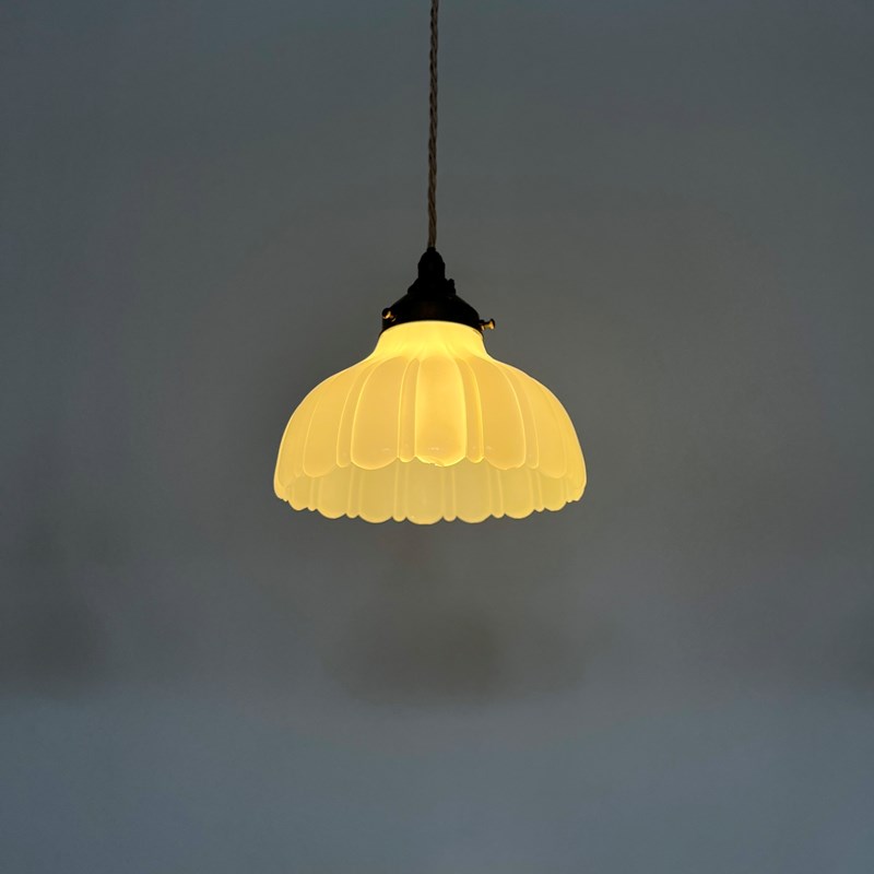 Three Moonstone Jefferson glass shades. Each rewired with an antique brass finish fitting and pigeon braided flex. Each shade requires one B22 lamp, these are not included but can be supplied. The coloured flex can be changed to your preference and a matching ceiling fitting is supplied.