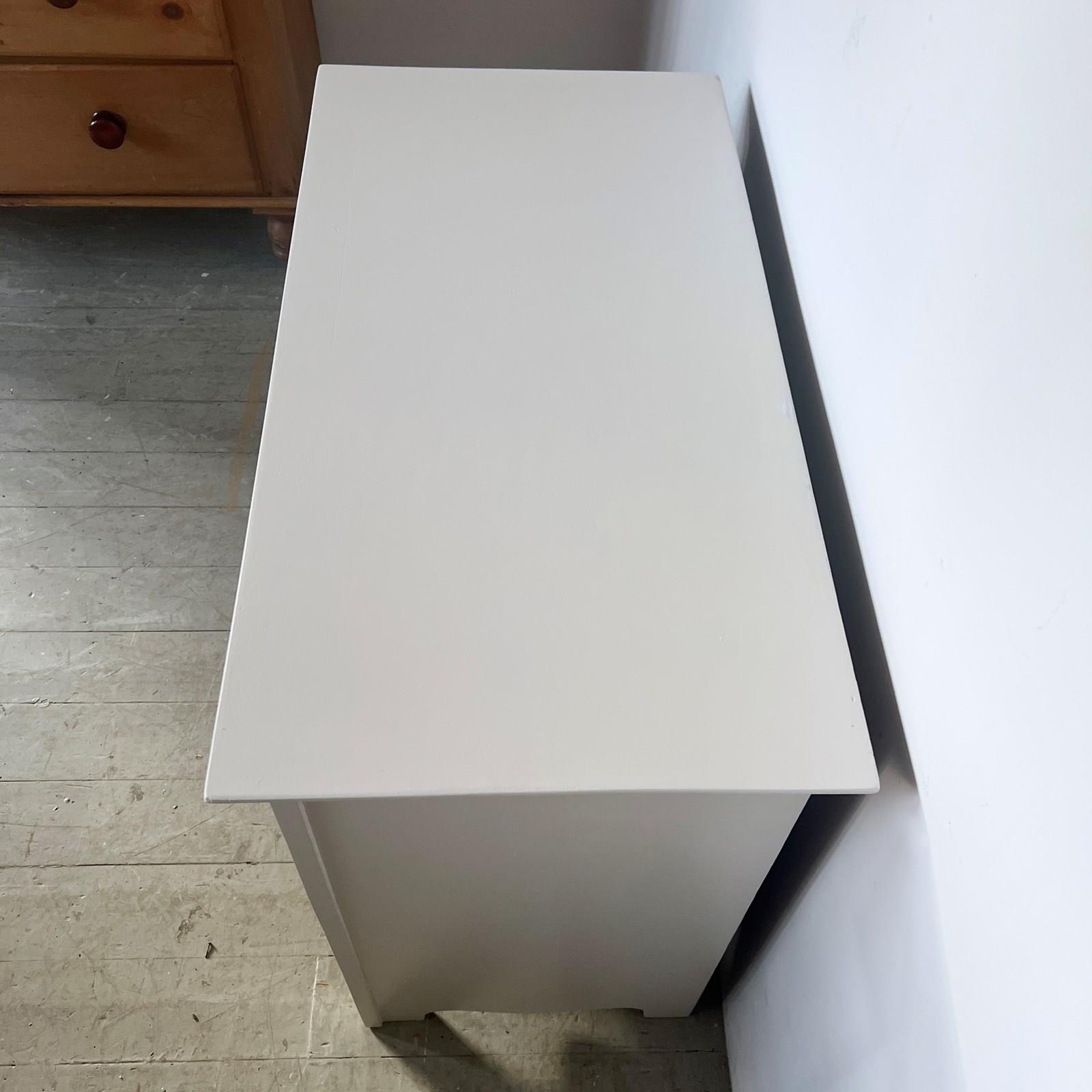 Small wooden chest of drawers newly painted in Little Greene Eggshell in Rolling Fog Light. The drawers have bee previously lined with paper. This has been left and removed in places. Please see photos. Not all the brass handles match. The top two do not match the rest.