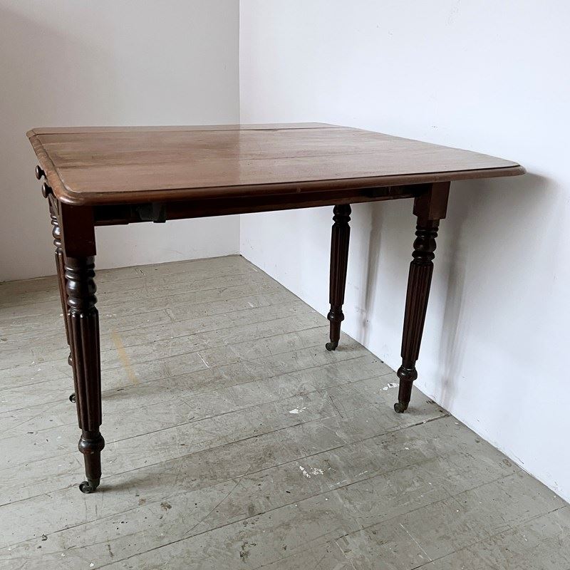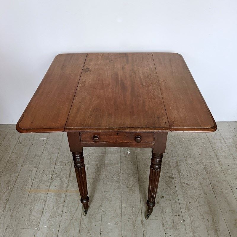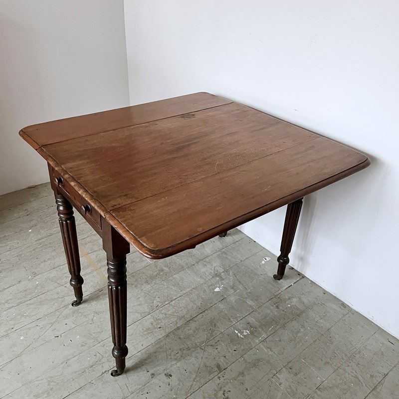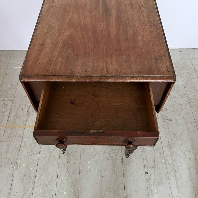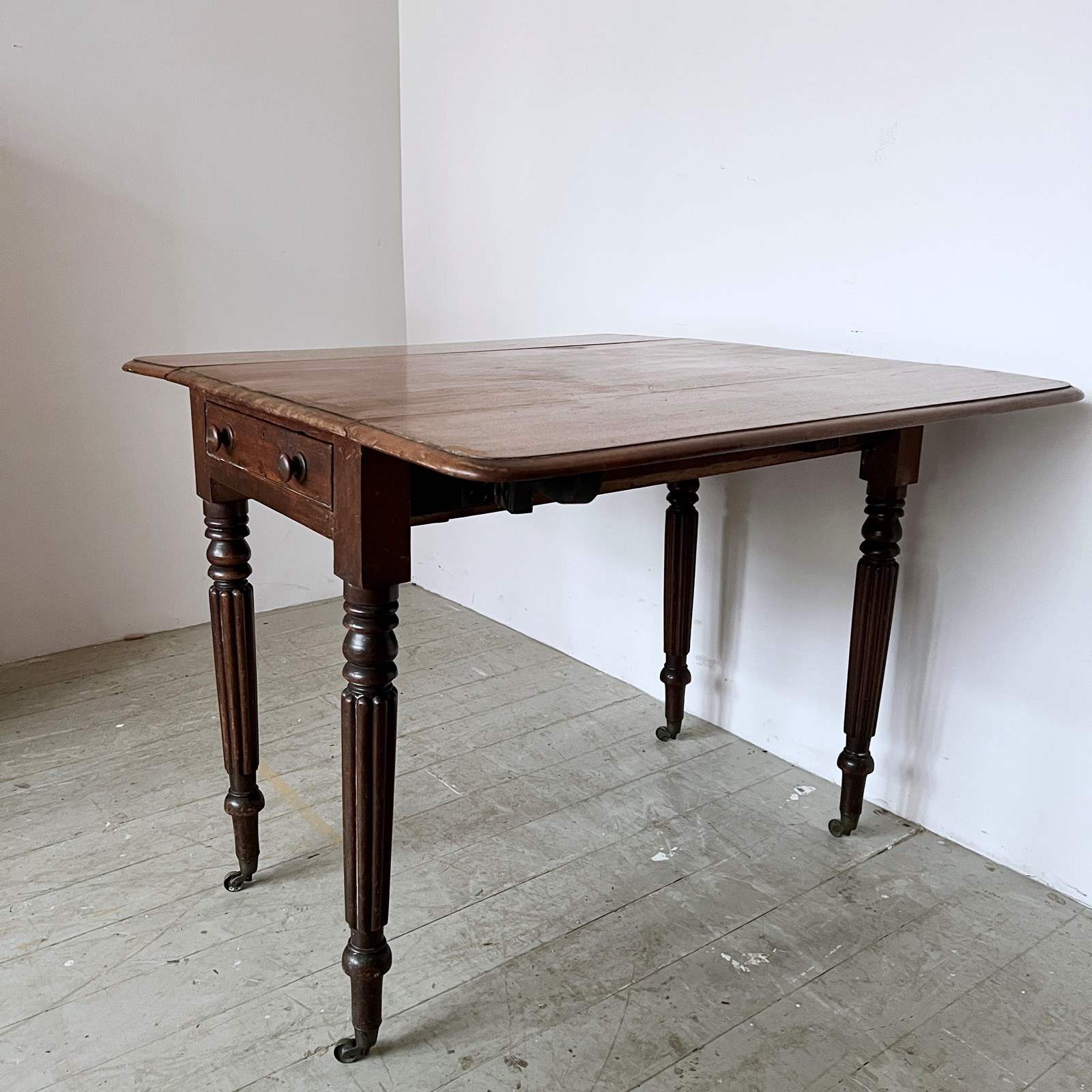 Early 20th century drop leaf table in good vintage condition. With stylised legs and supports finished with castors. The piece features one working drawer and one false drawer for decoration.