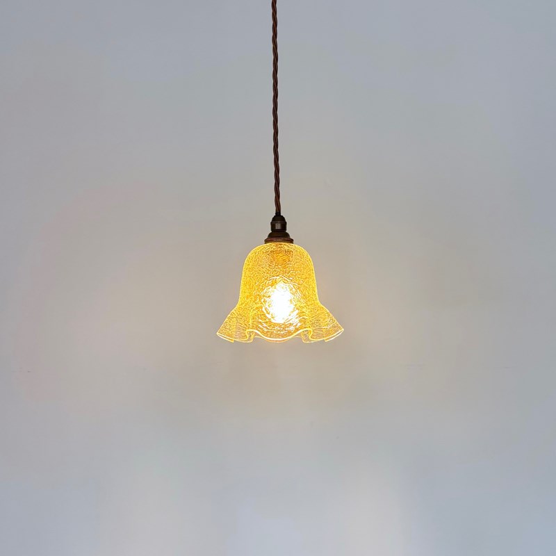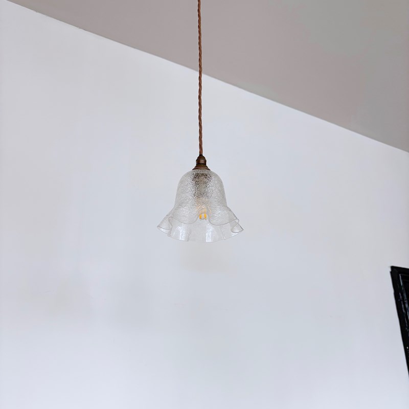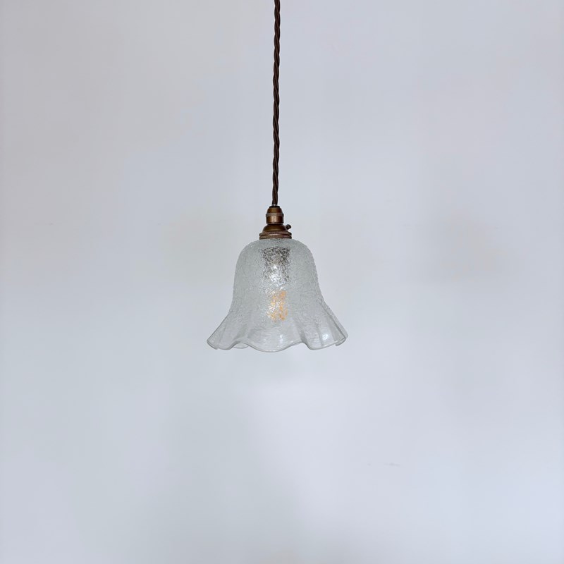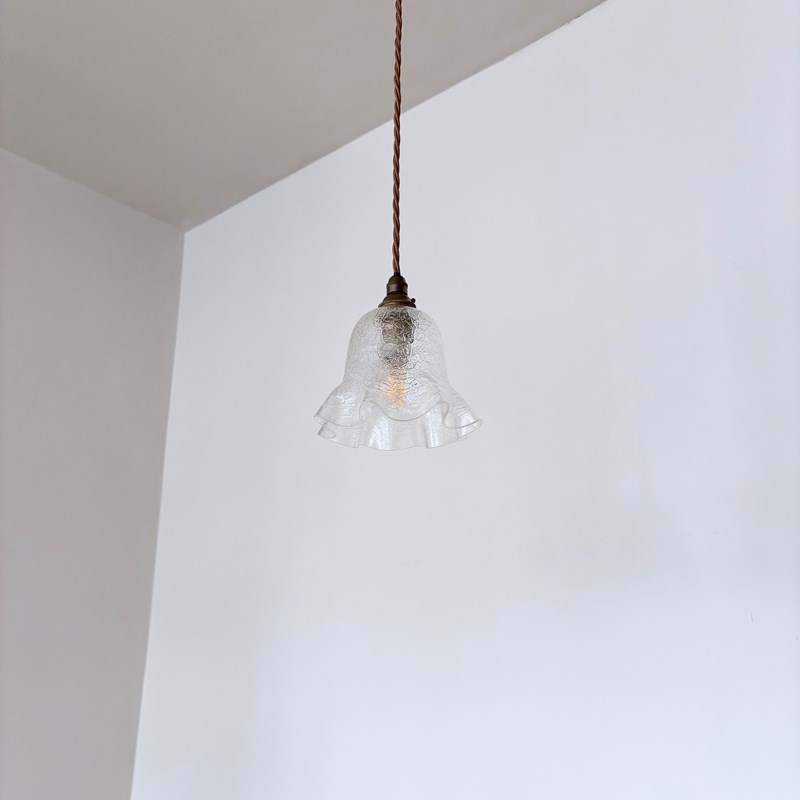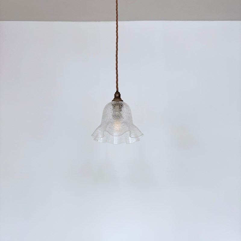 Clear fluted crackle glass shade. Rewired with an antique brass finish fitting and dark brown braided flex. This shade requires one B22 lamp this is not included but can be supplied. The coloured flex can be changed to your preference and a matching ceiling fitting is supplied.