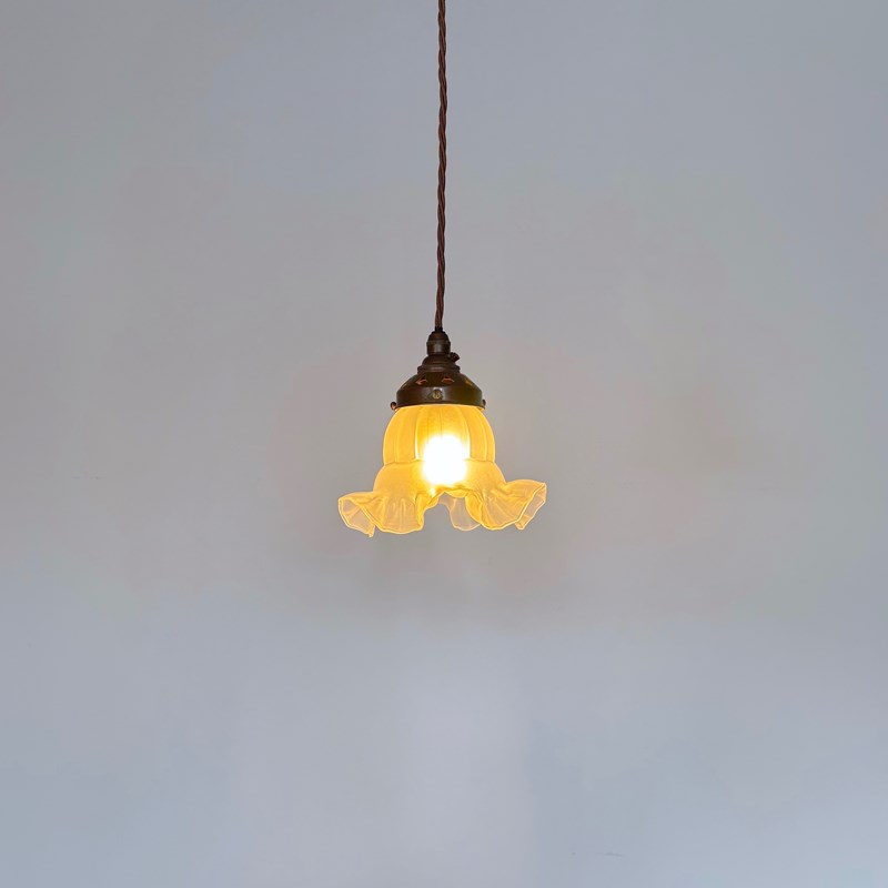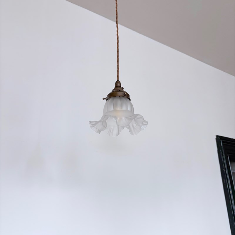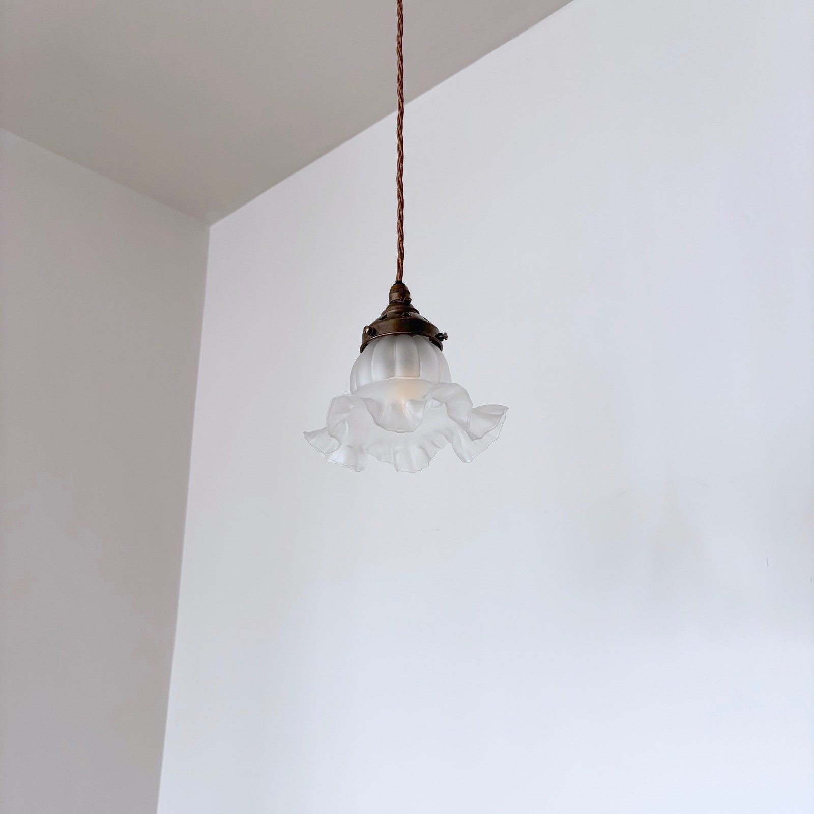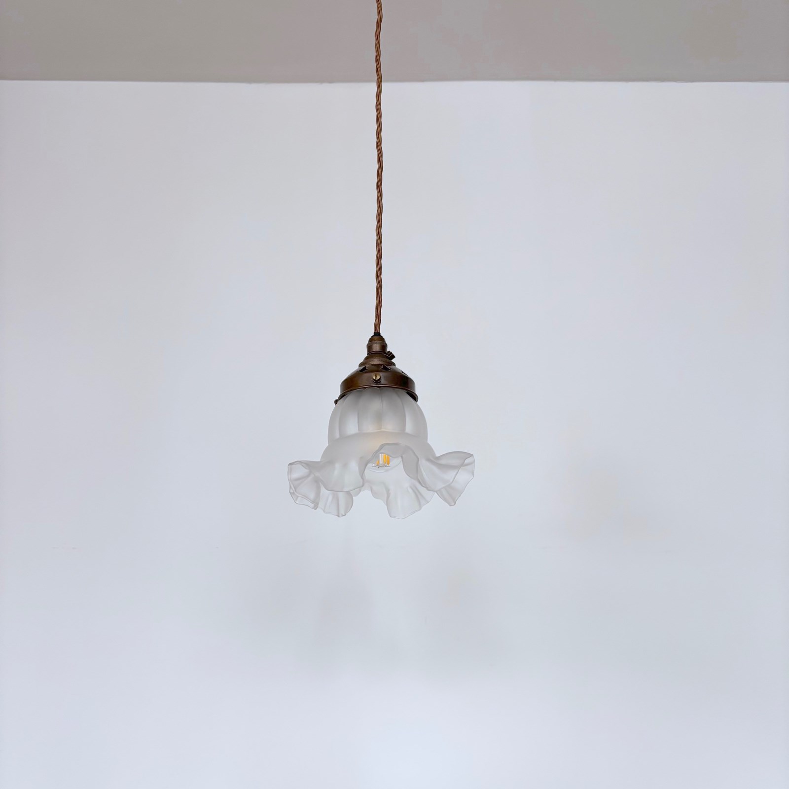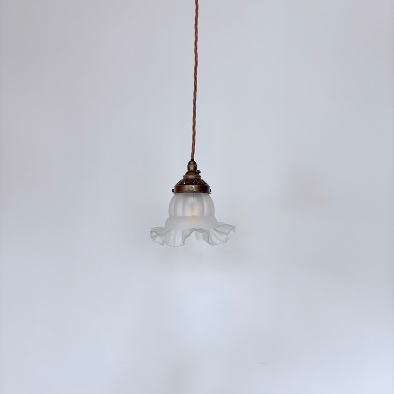 Frosted frilled glass shade. Rewired with an antique brass finish fitting and light brown braided flex. This shade requires one B22 lamp this is not included but can be supplied. The coloured flex can be changed to your preference and a matching ceiling fitting is supplied.