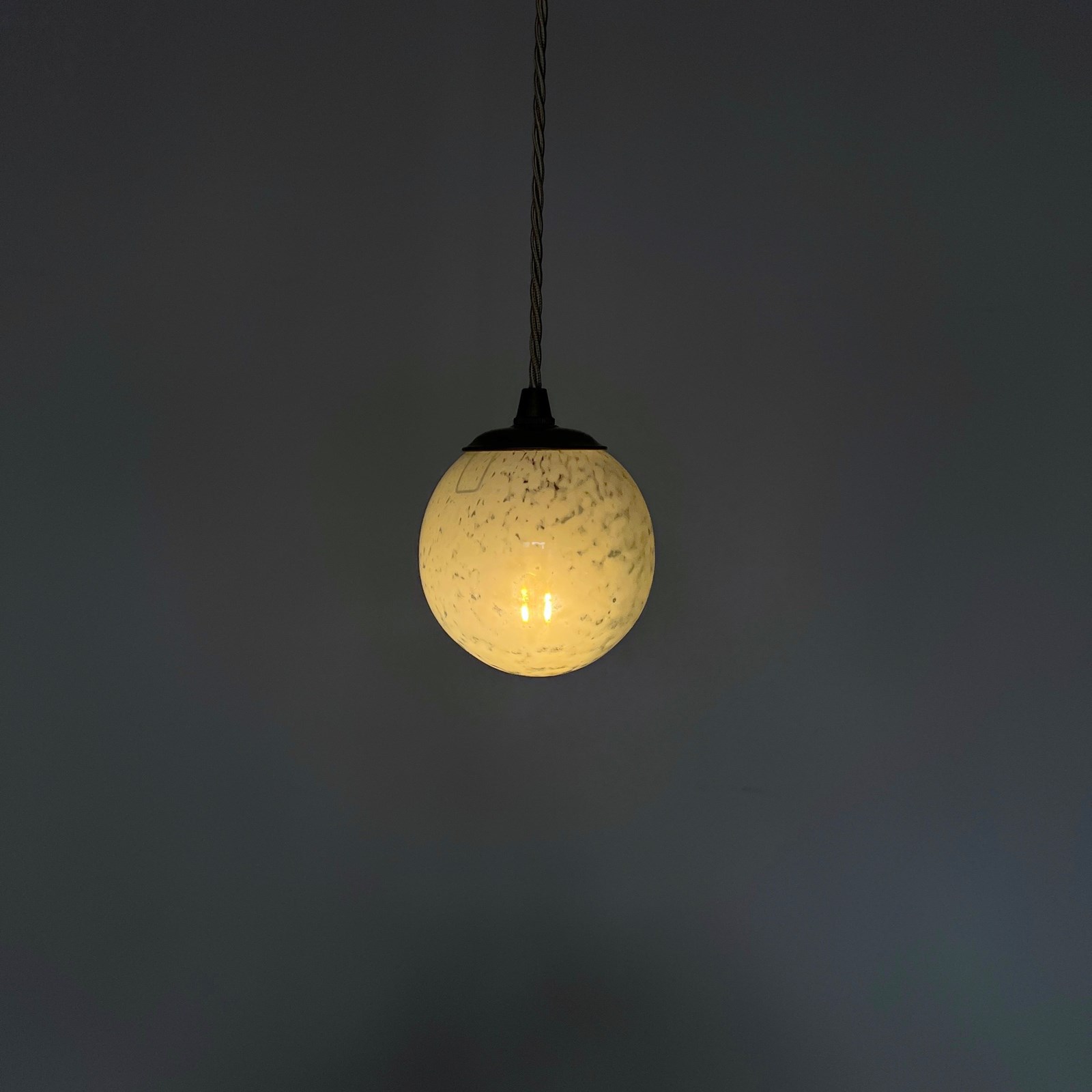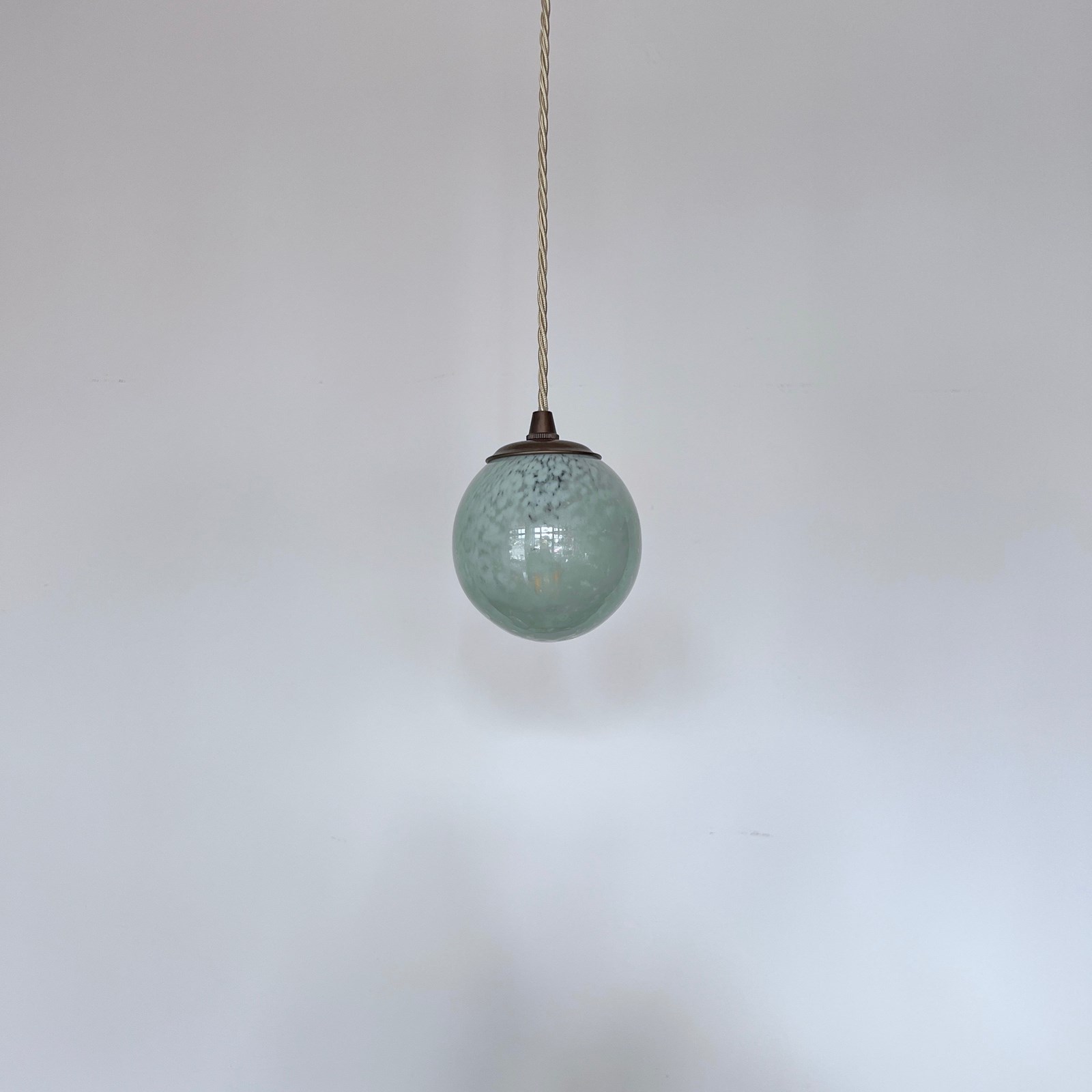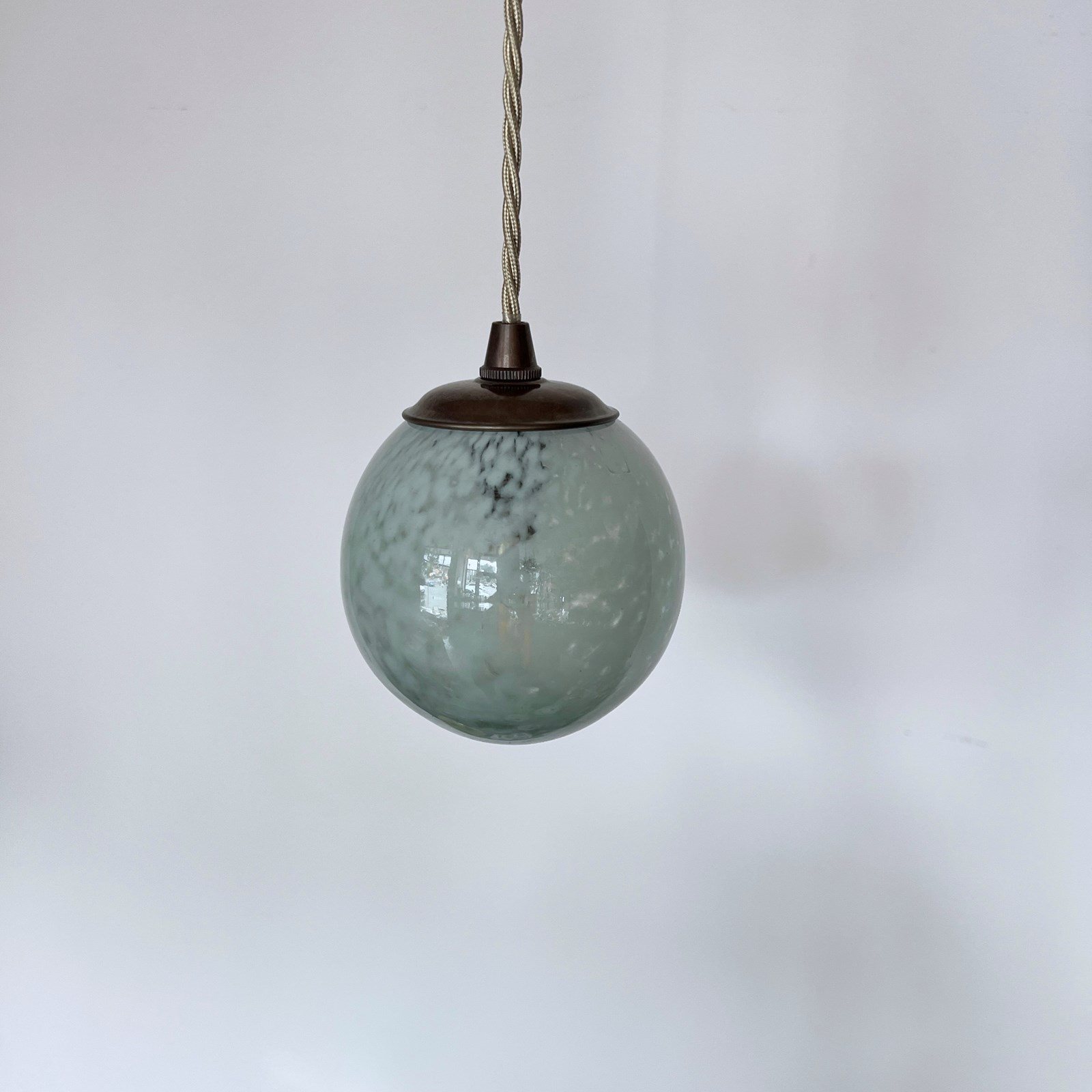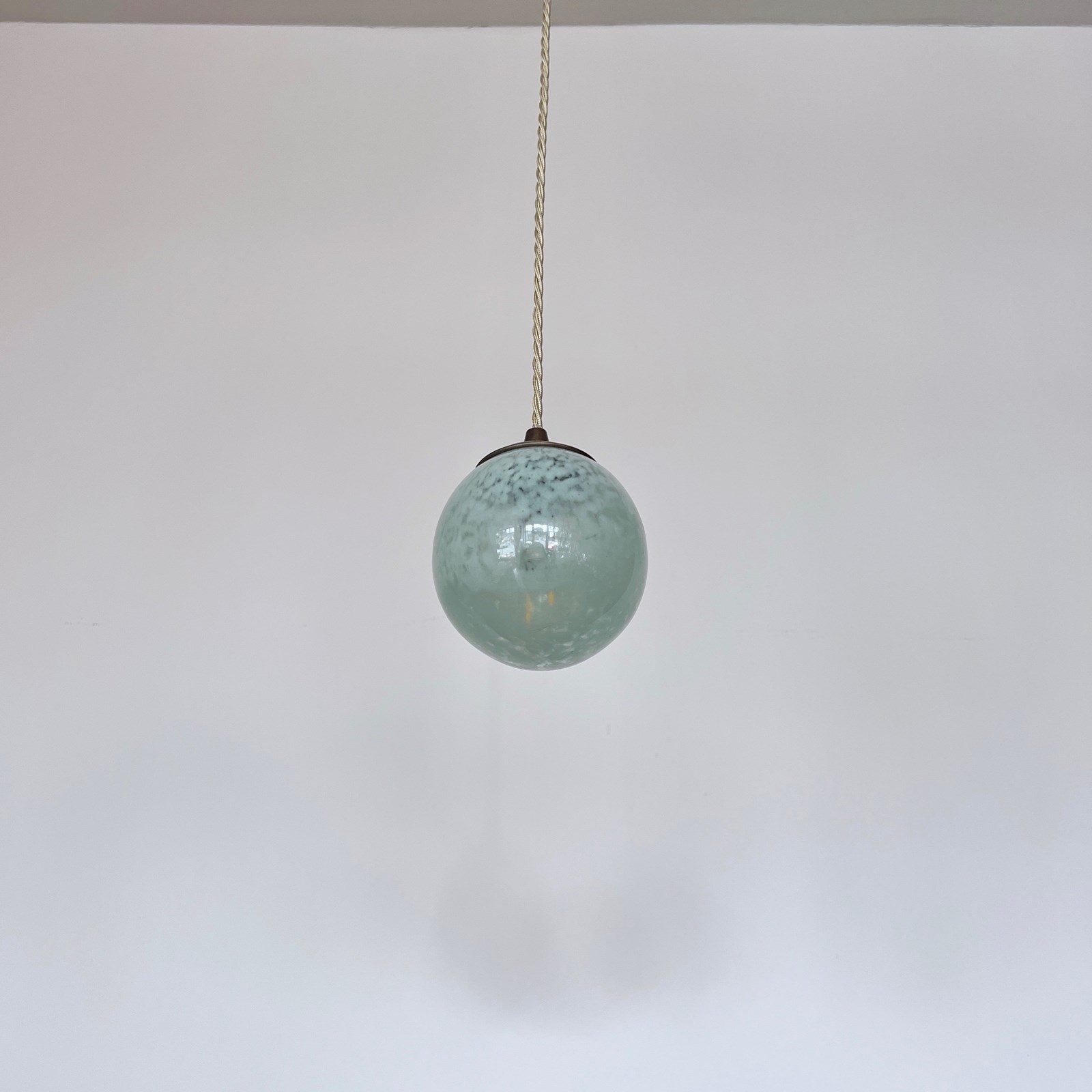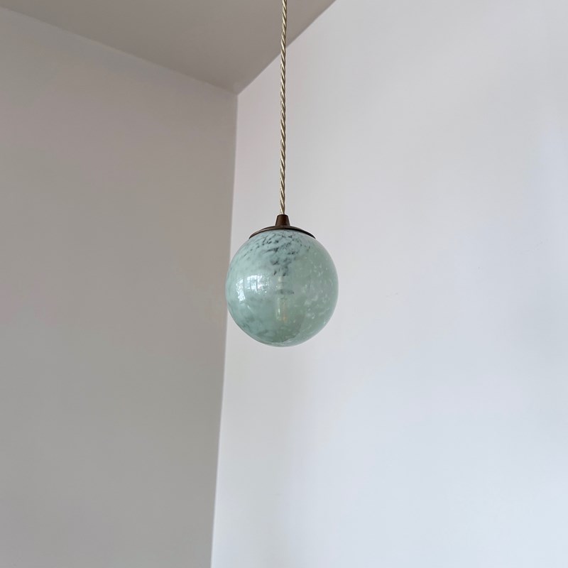 Moulded mottled green glass globe shade pendant. Rewired with an antique brass finish fitting and beige braided flex. This shade requires one B15 pygmy lamp this is not included but can be supplied. The coloured flex can be changed to your preference and a matching ceiling fitting is supplied.