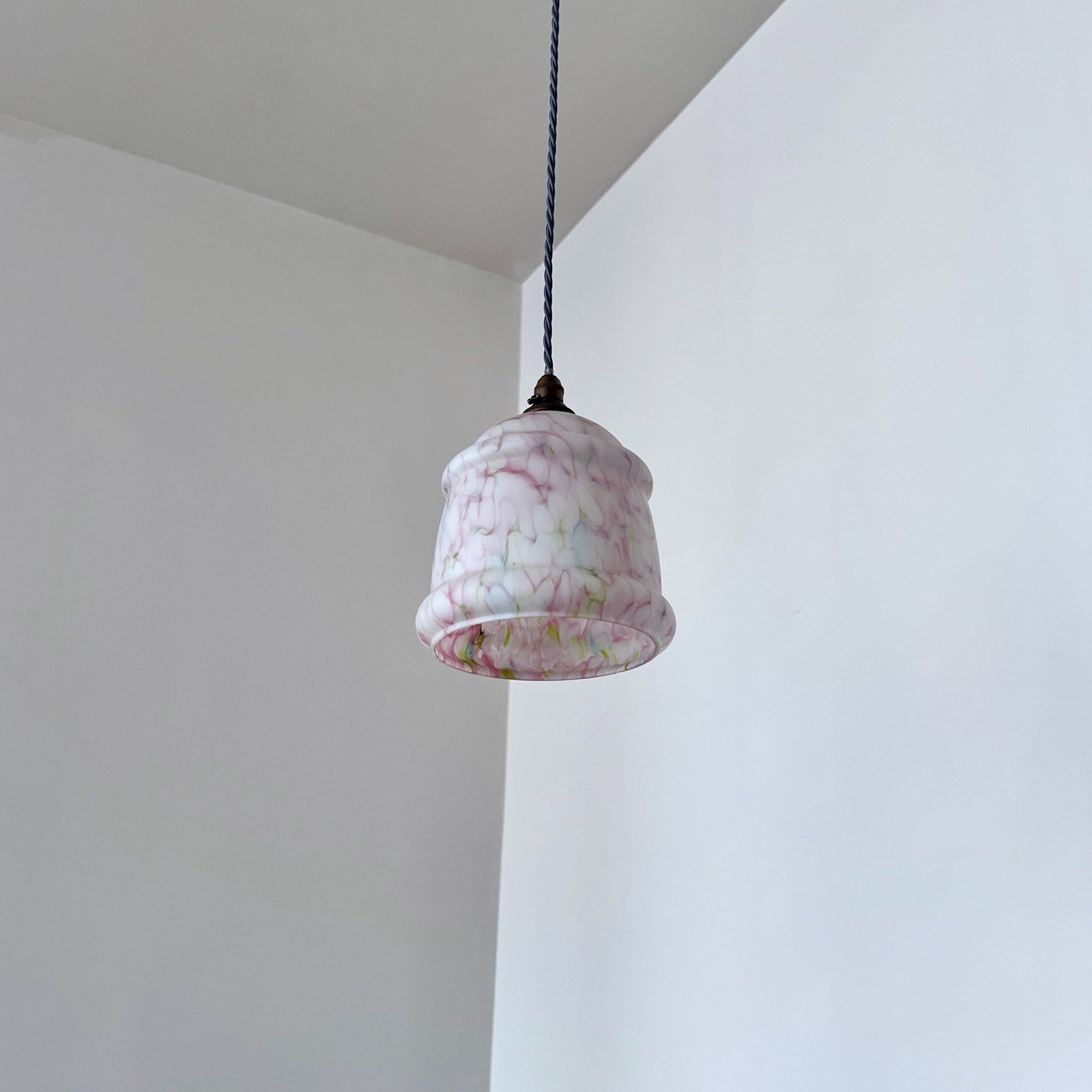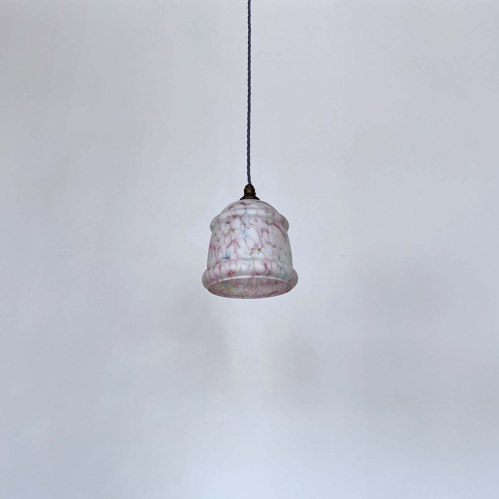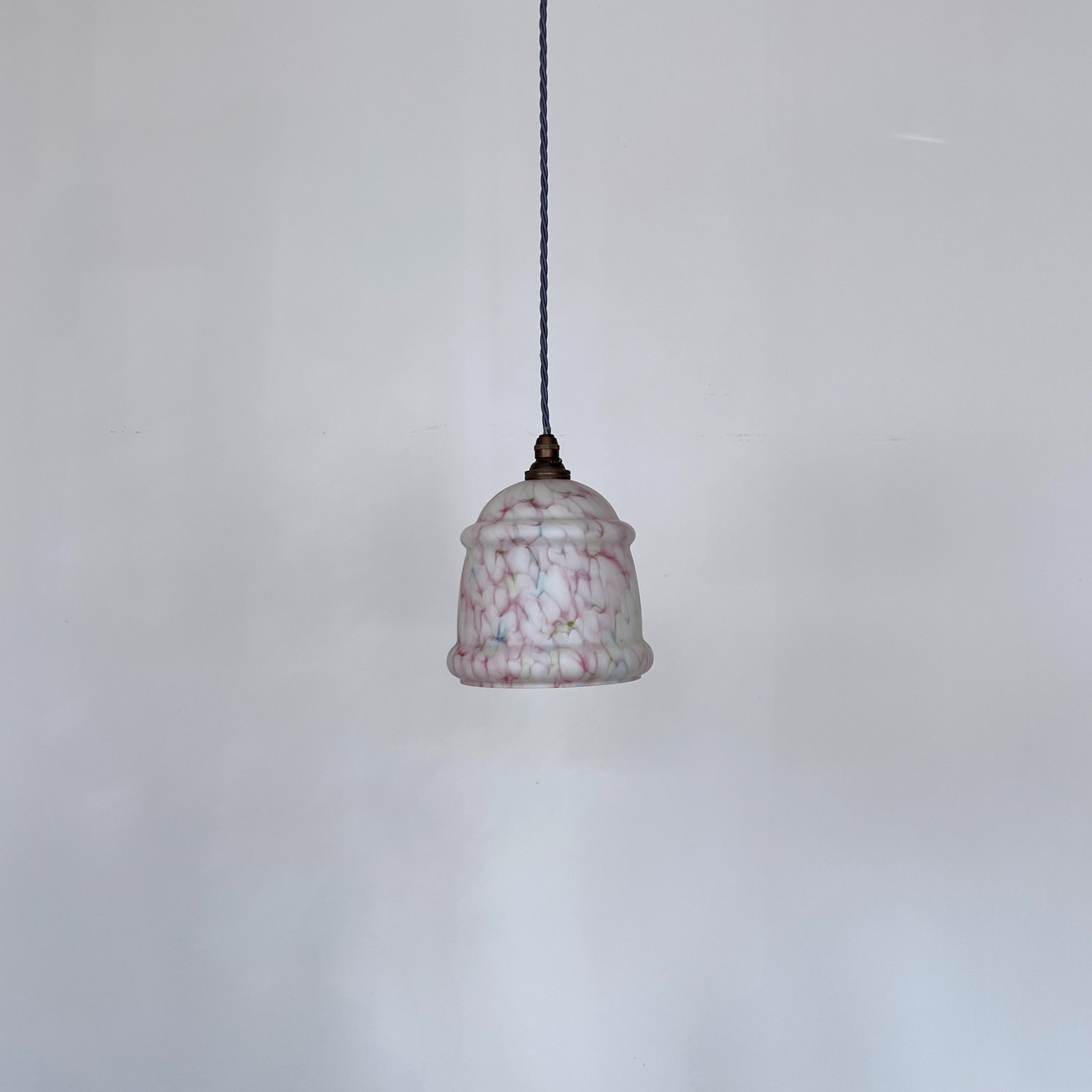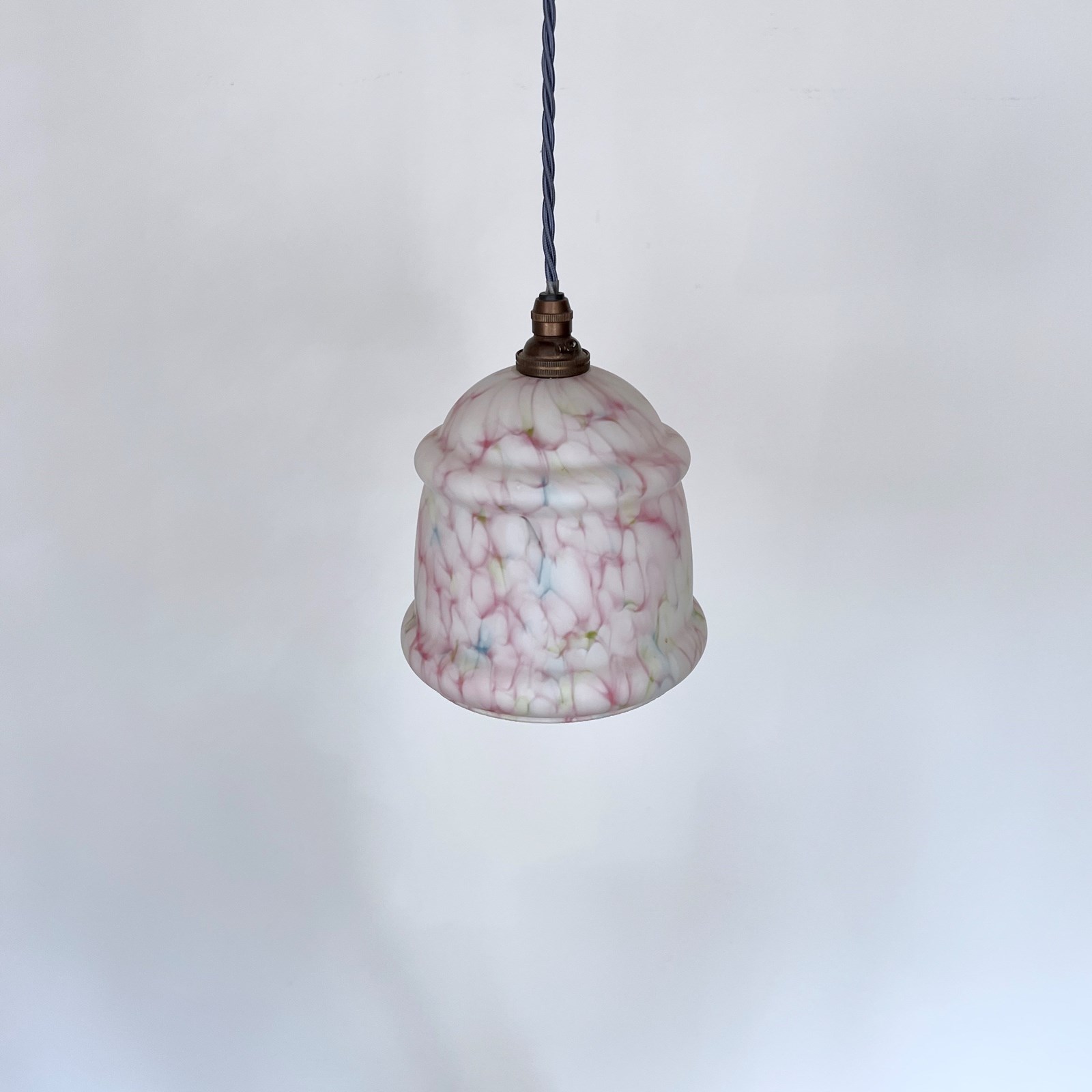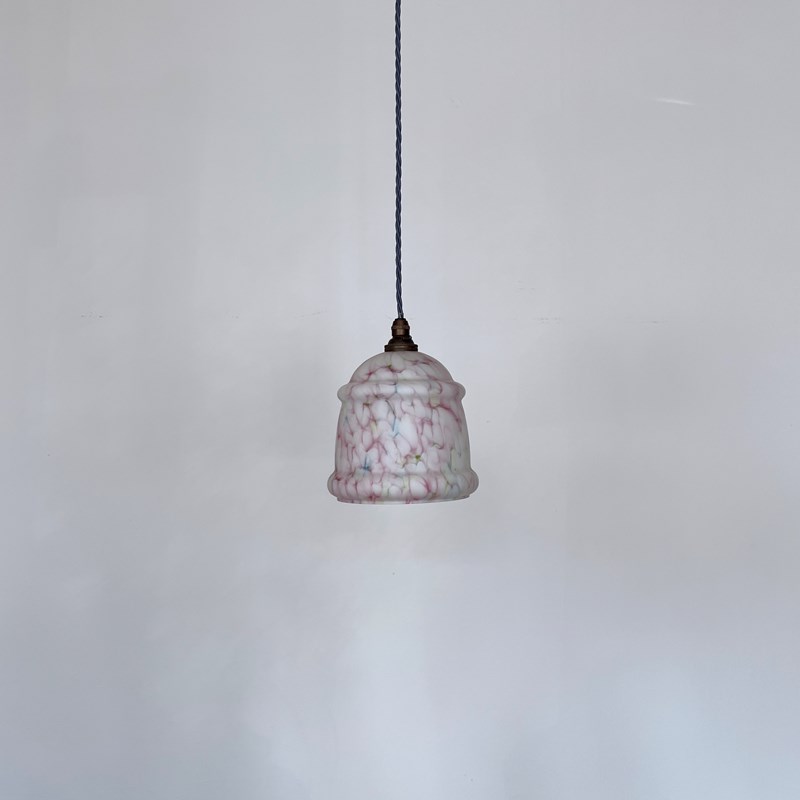 Mottled pink glass shade with green and blue details. Finished with an antique brass finish fitting and lead blue braided cable. The coloured braided flex can be changed to your preference and a matching ceiling fitting is supplied. The shade requires one b22 bulb. This is not included but can be supplied.