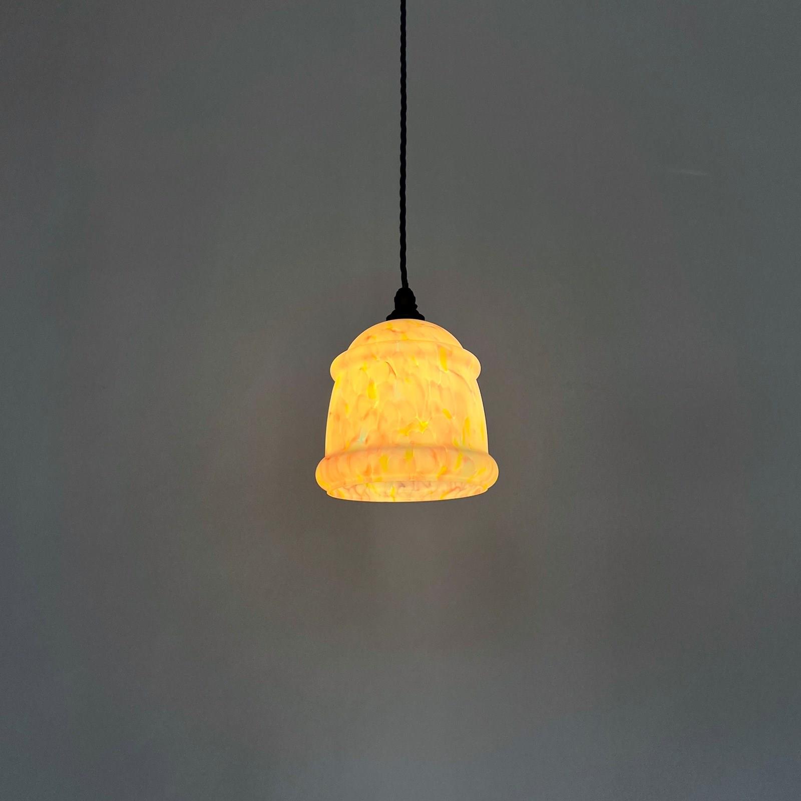 This shade has been fully rewired here, in Stockport, near Manchester by our small team of experts and is now ready to be installed. We recommend that this is installed by an electrician into a joist or a supporting noggin. To clean dust the flex and brass components regularly with a soft cloth. The glass shade can then be wiped with a glass wipe or a cloth that has been sprayed with glass cleaner. A final wipe with a paper towel will give a polished finish.