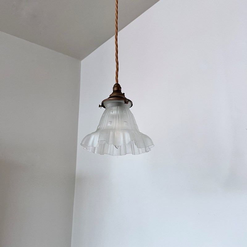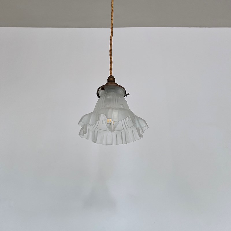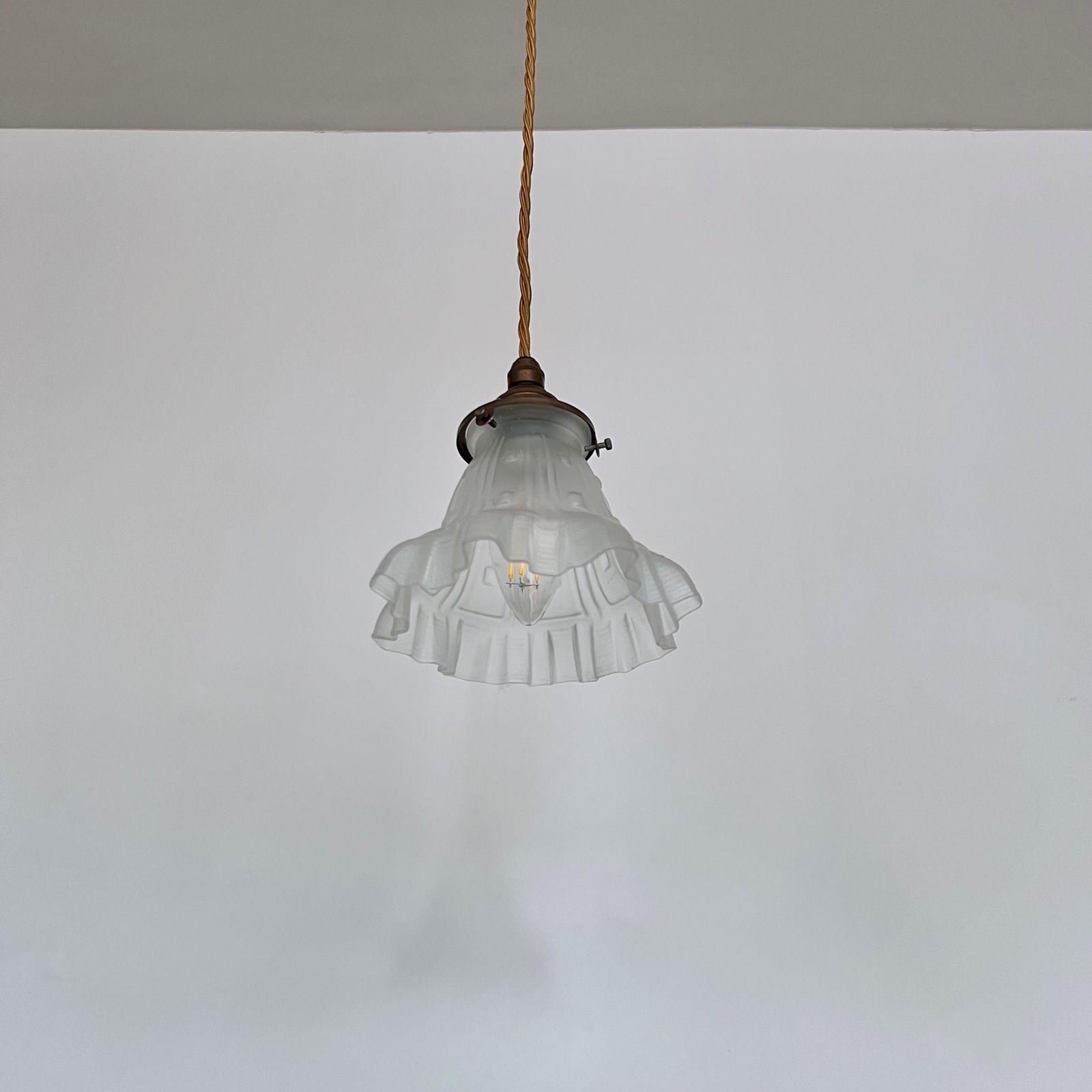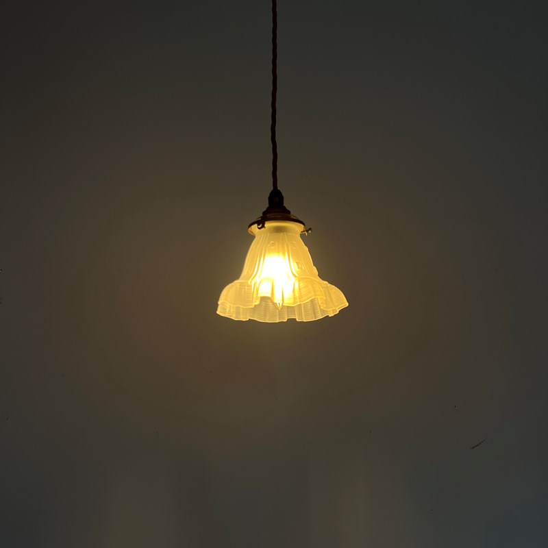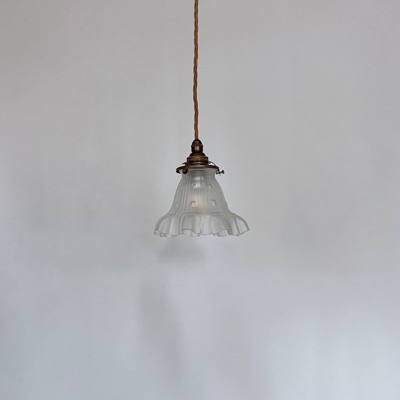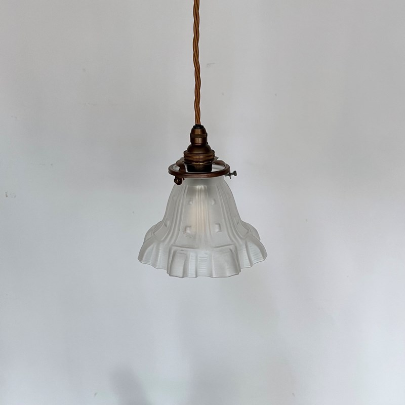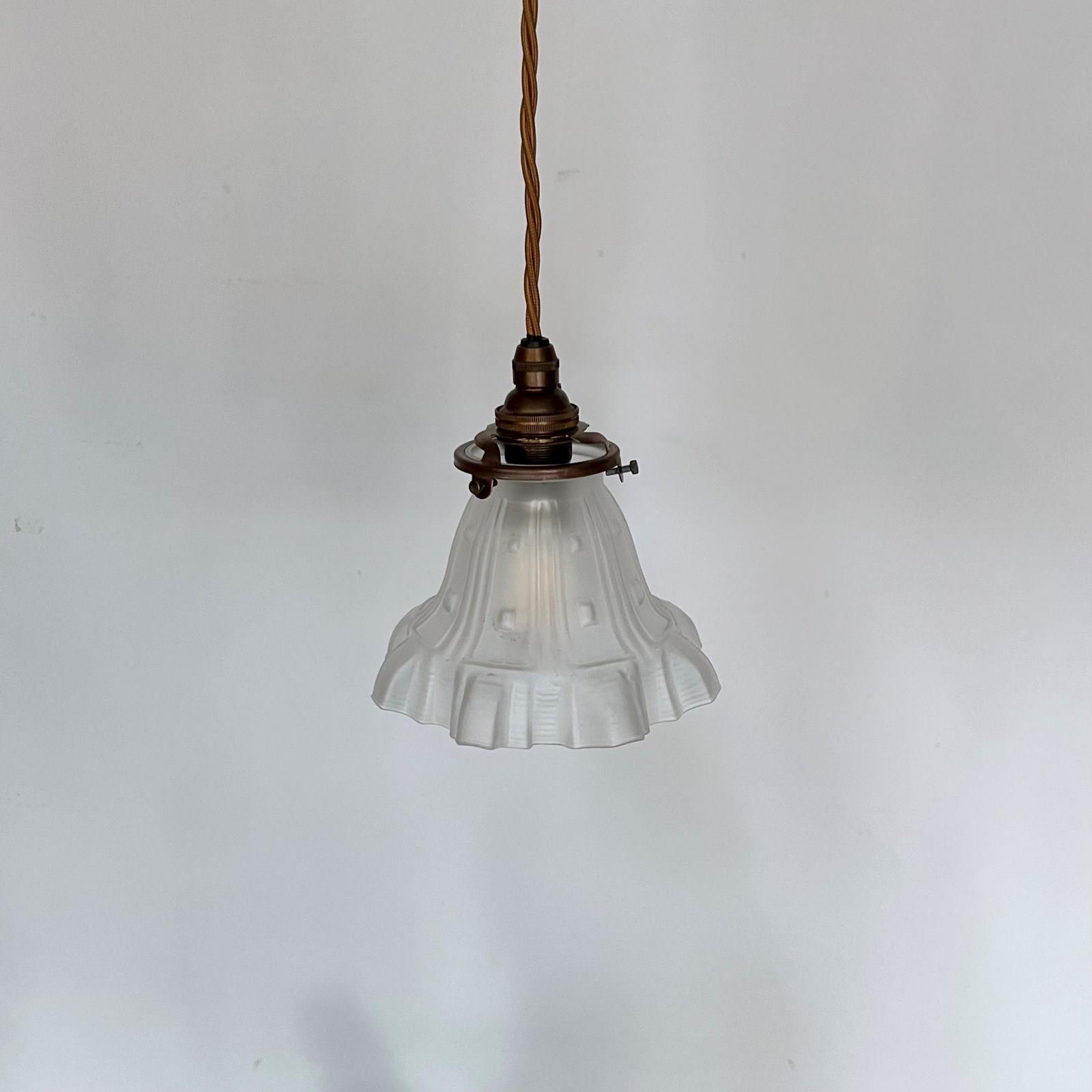 Small frosted glass shade. Rewired with an antique brass finish fitting and light brown braided flex. The shade requires one B22 lamp, this is not included. The coloured flex can be changed to your preference and a matching ceiling fitting is supplied.