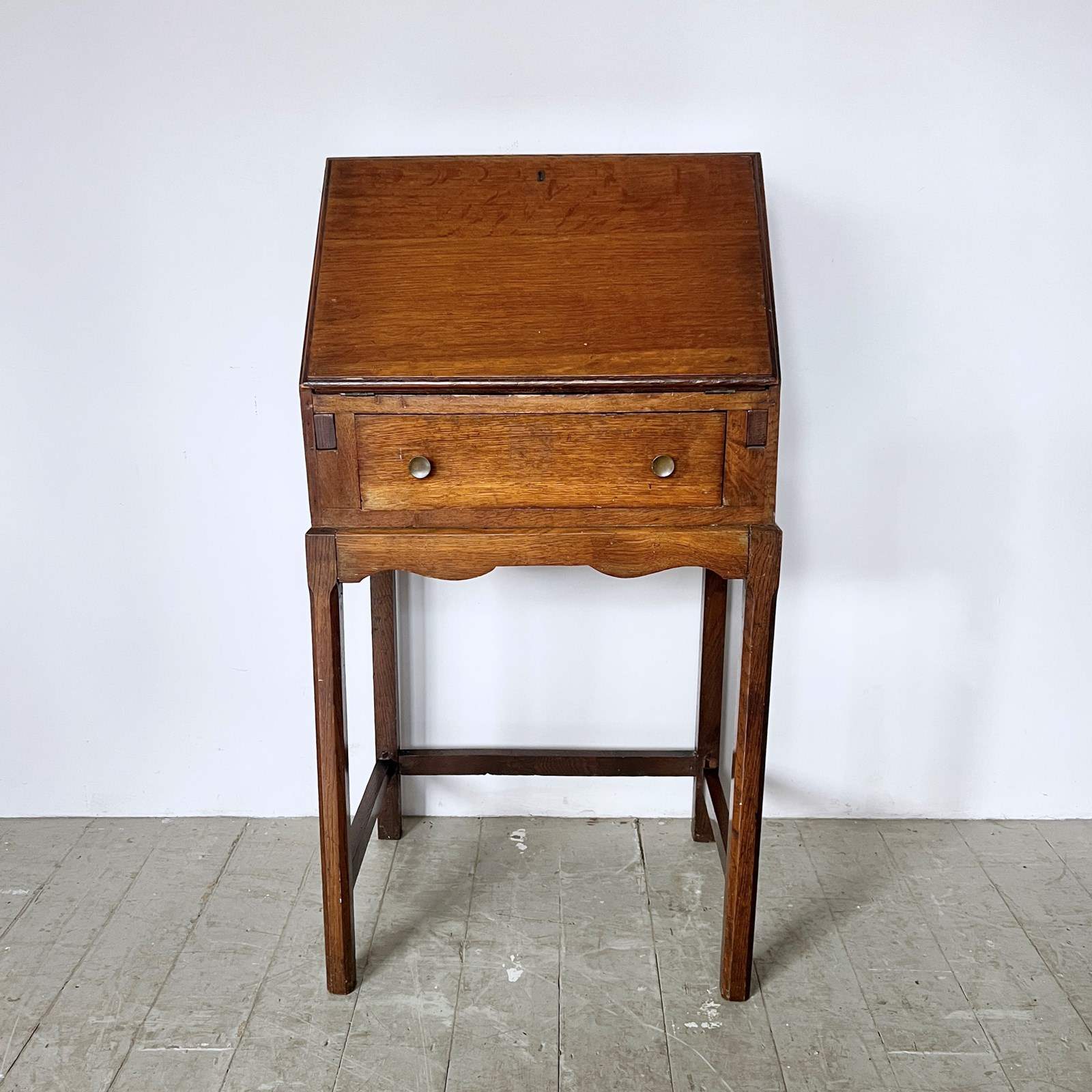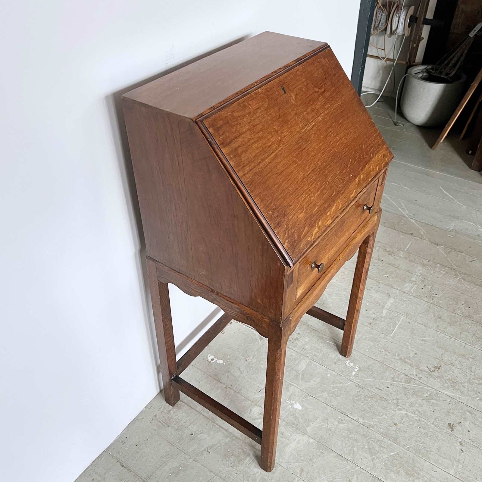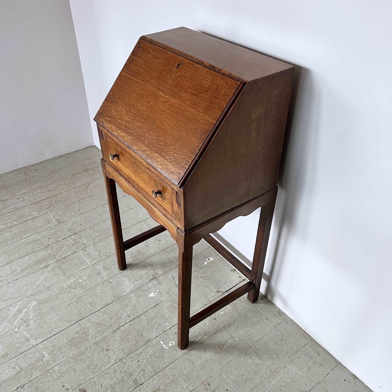 Small oak bureau with lower drawer and drop down writing desk.