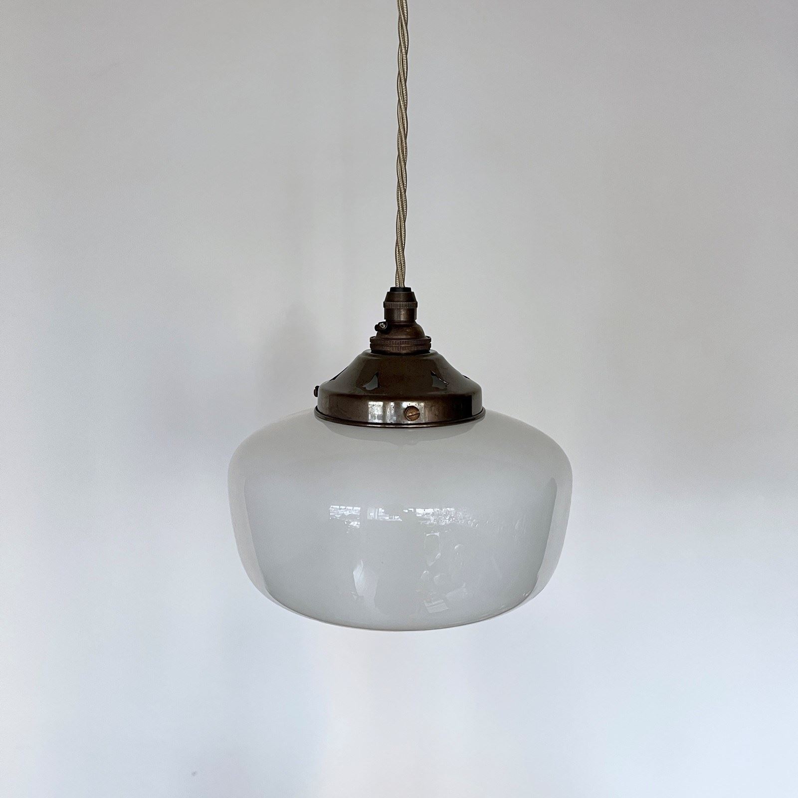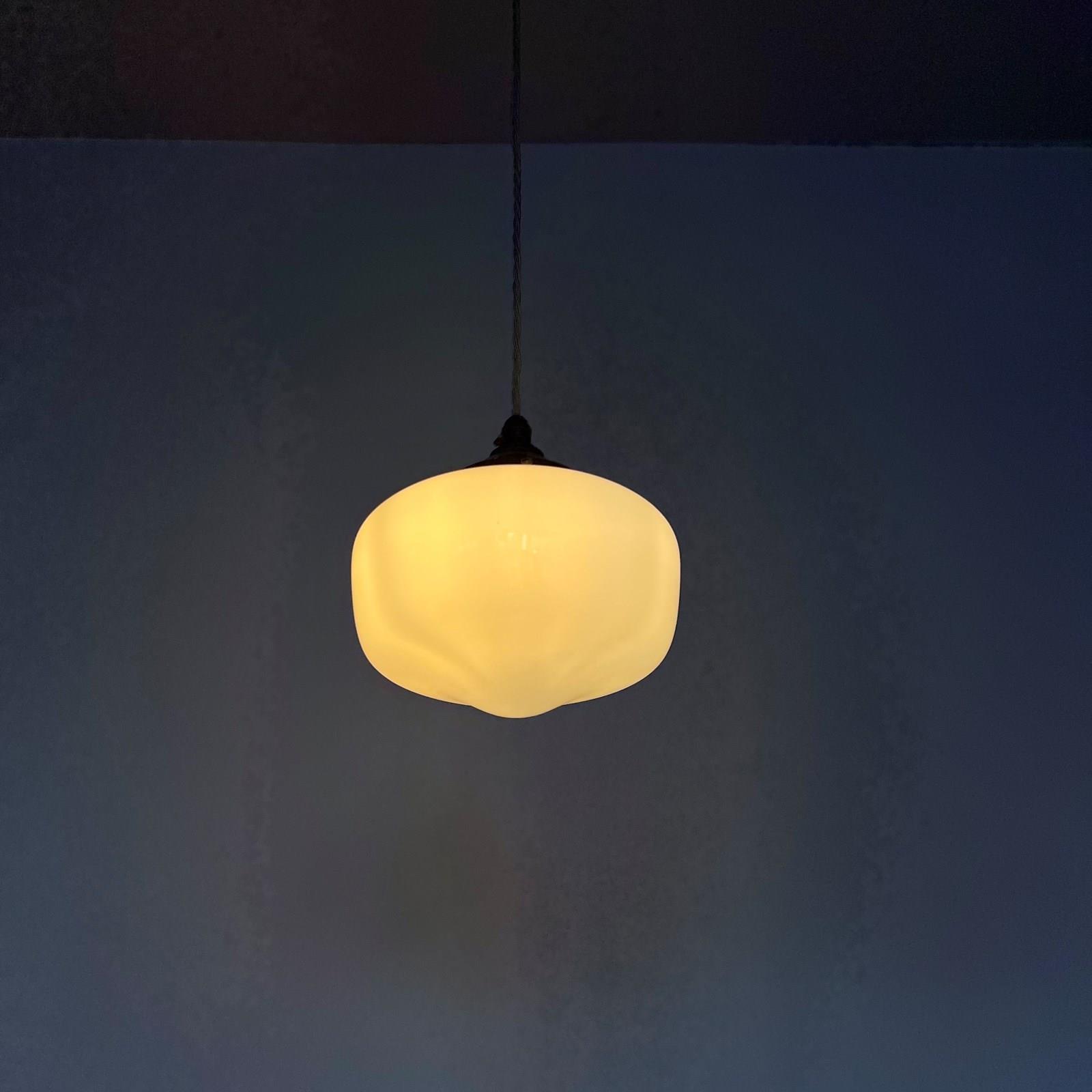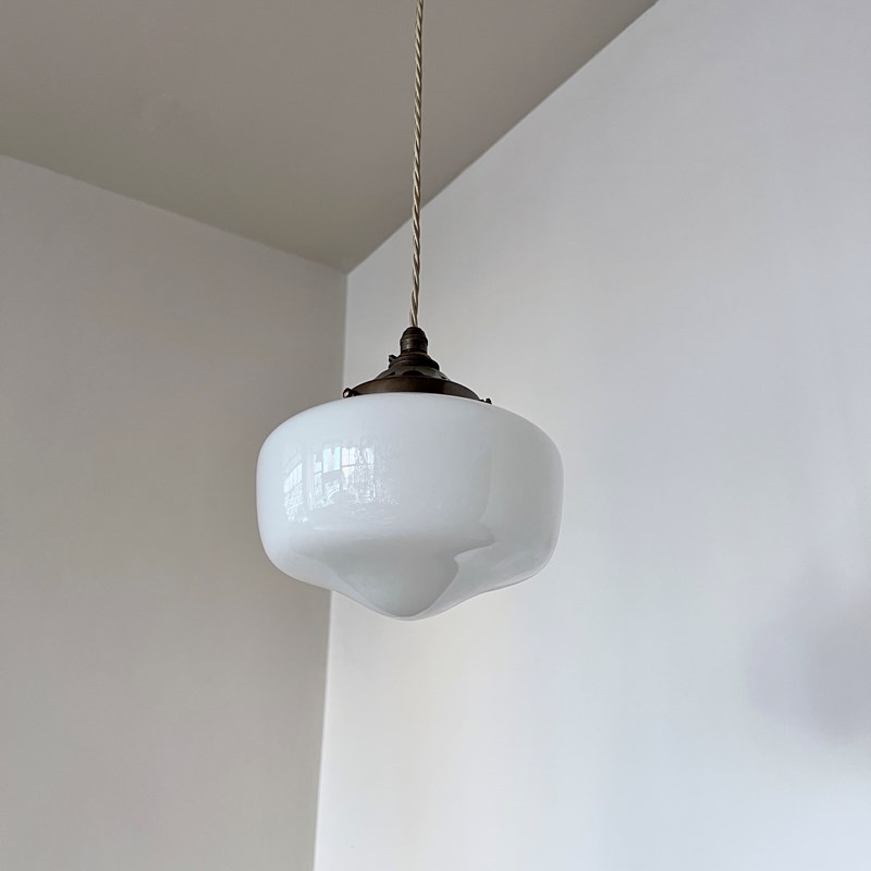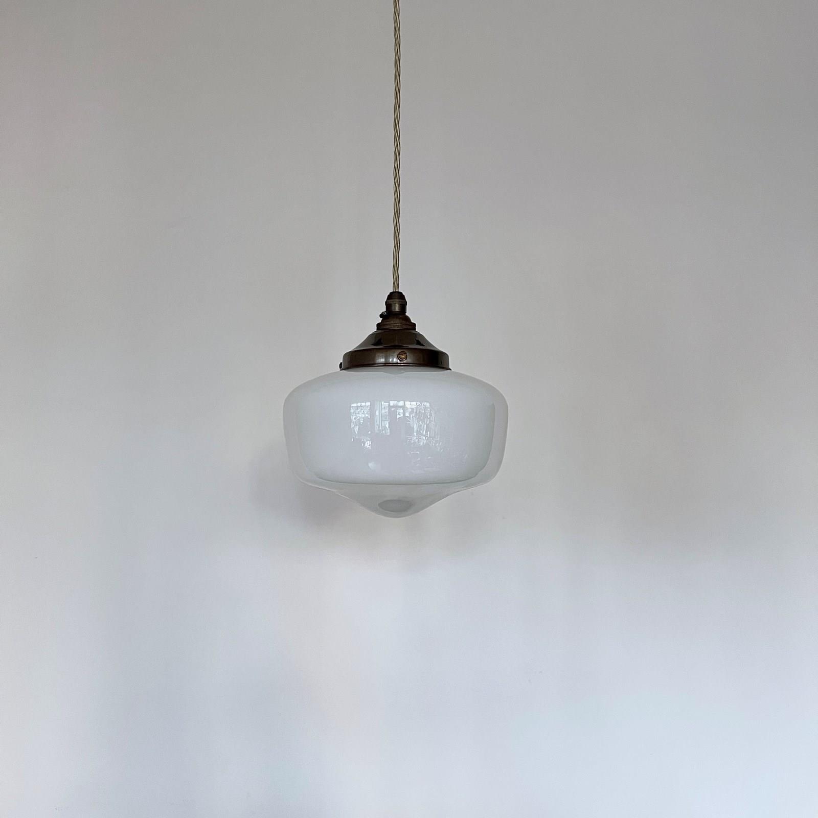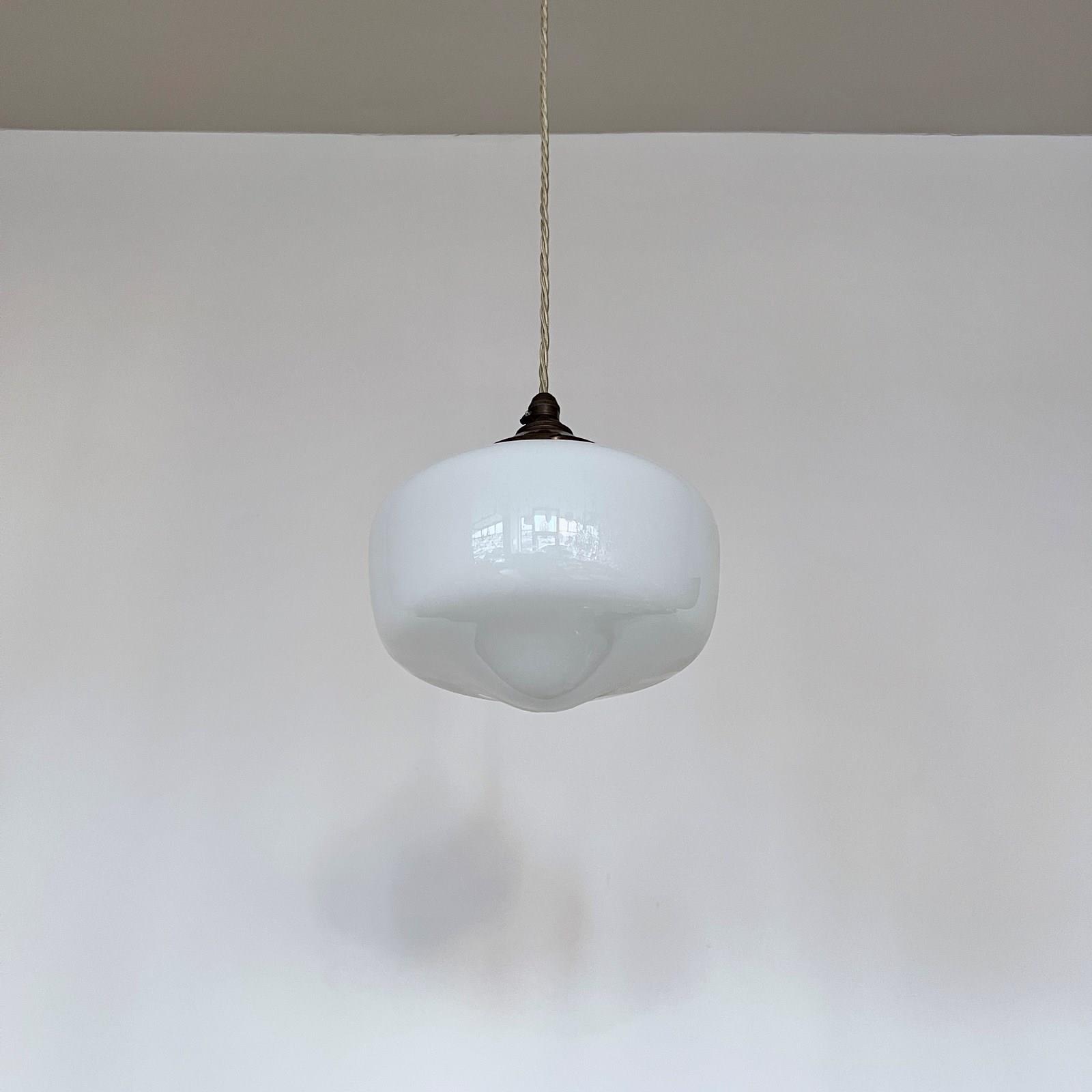 Moulded enclosed milk glass shade. Rewired with an antique brass finish fitting and beige braided flex. This shade requires one B22 lamp this is not included but can be supplied. The coloured flex can be changed to your preference and a matching ceiling fitting is supplied.