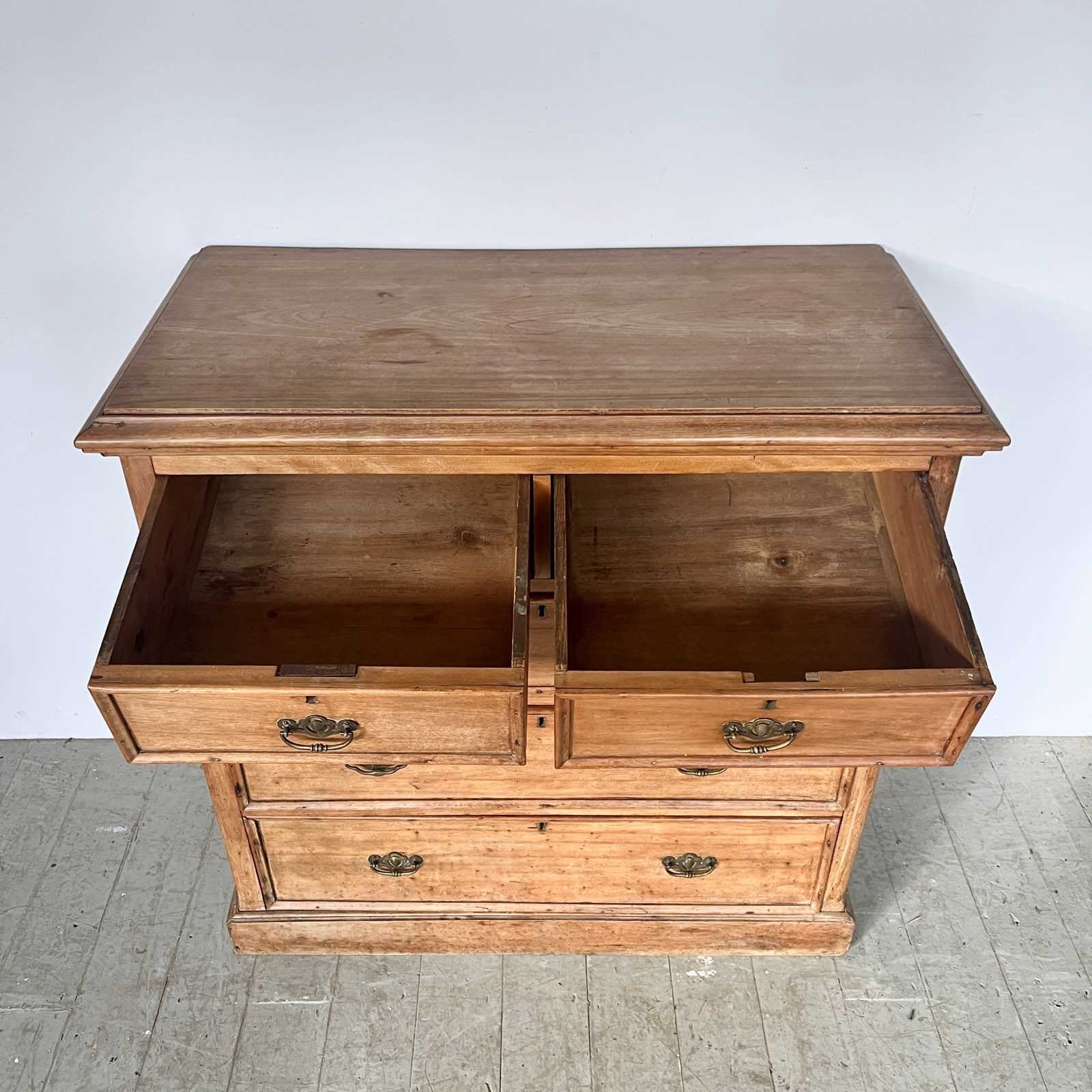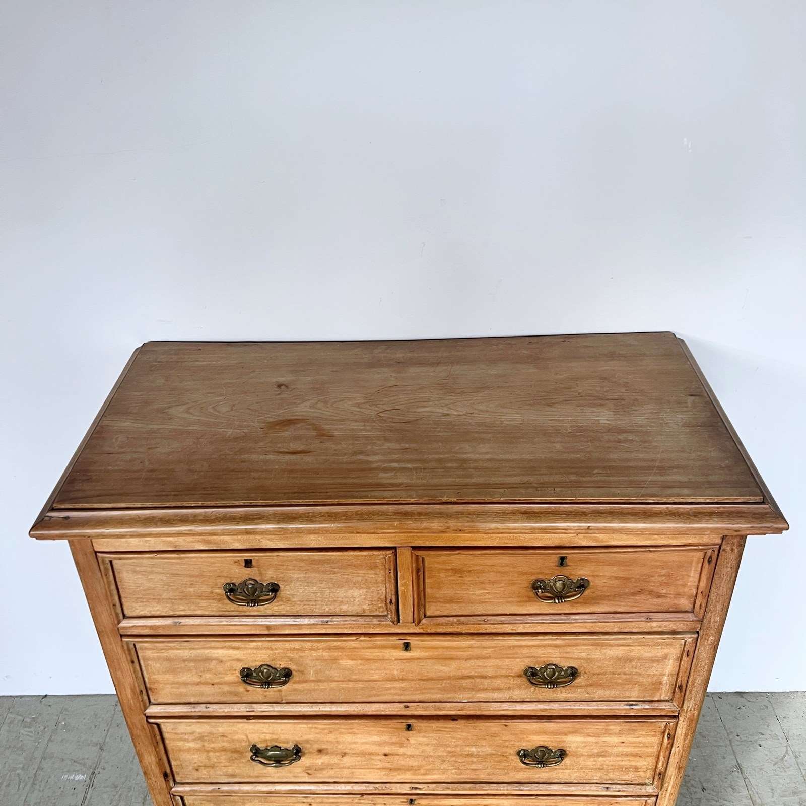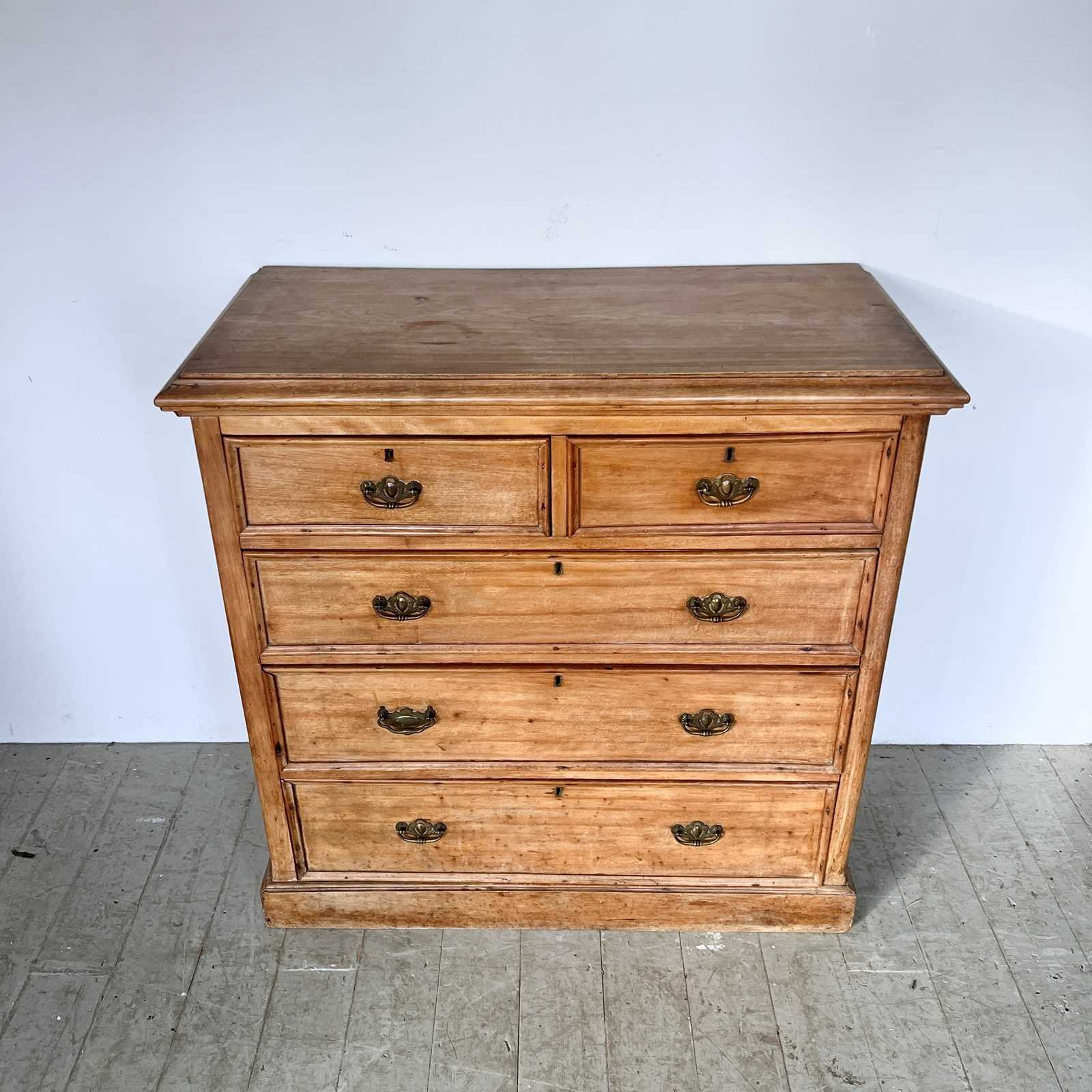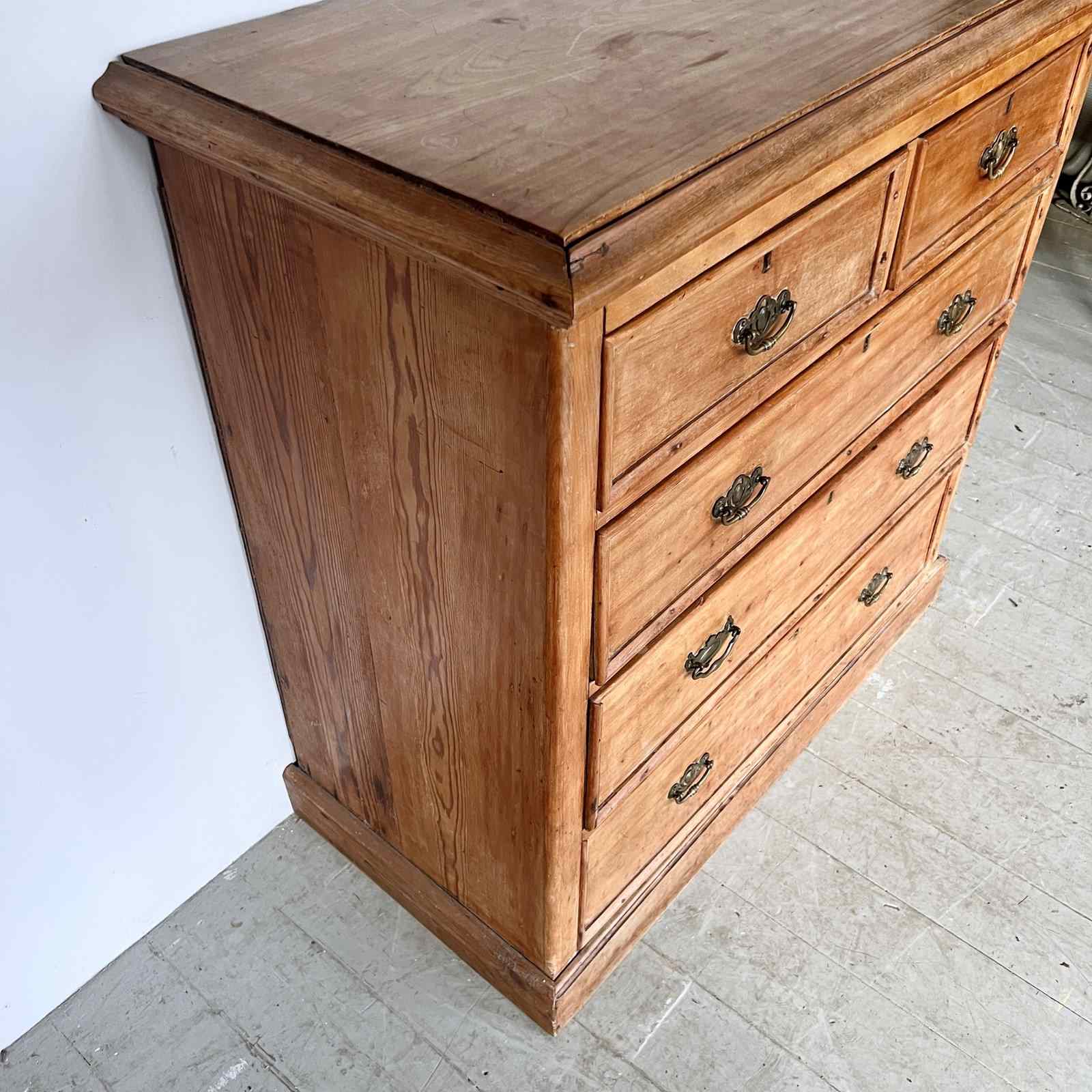 Solid wood pine chest of drawers with brass handle pulls. Two short drawers over three long. In used vintage condition. Please see photos. One of the handles has been replaced and does not match.