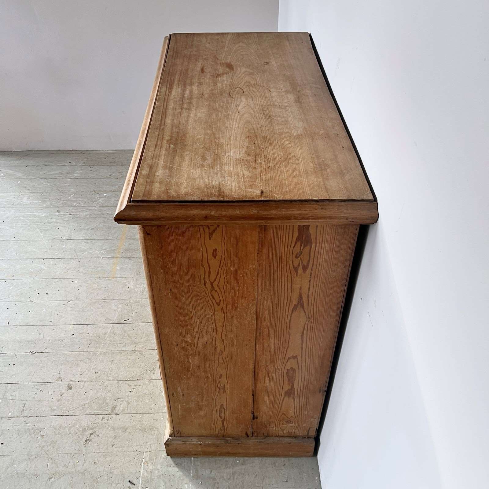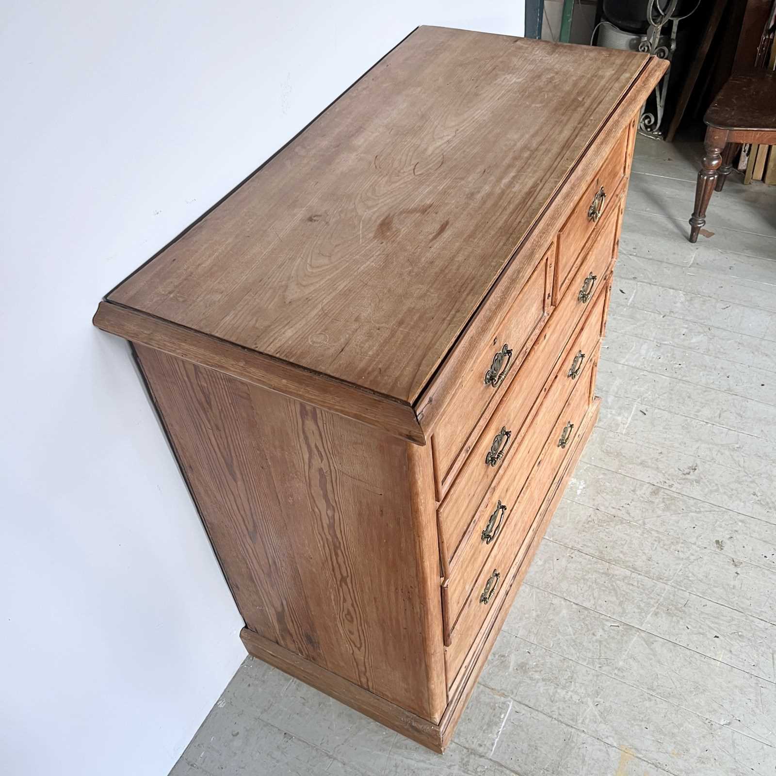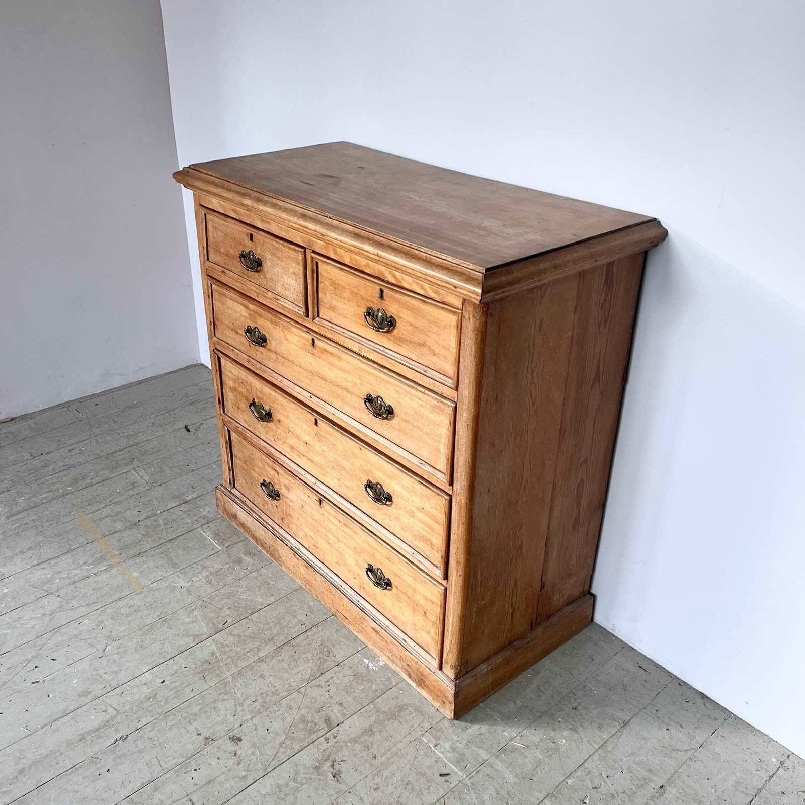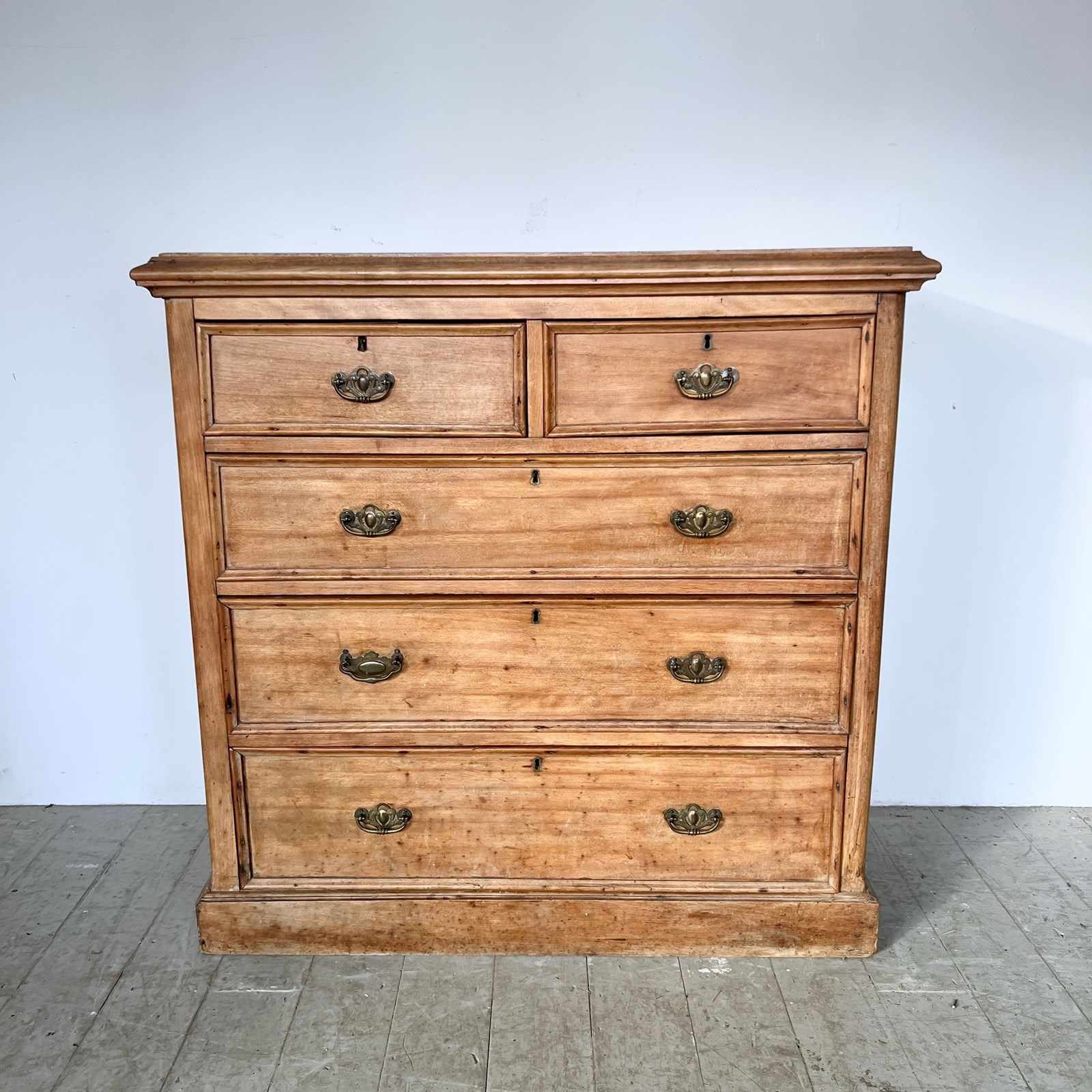 Solid wood pine chest of drawers with brass handle pulls. Two short drawers over three long. In used vintage condition. Please see photos. One of the handles has been replaced and does not match.