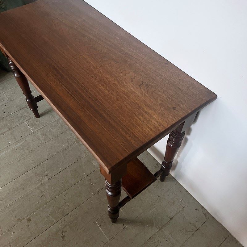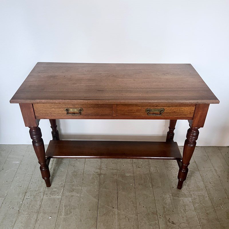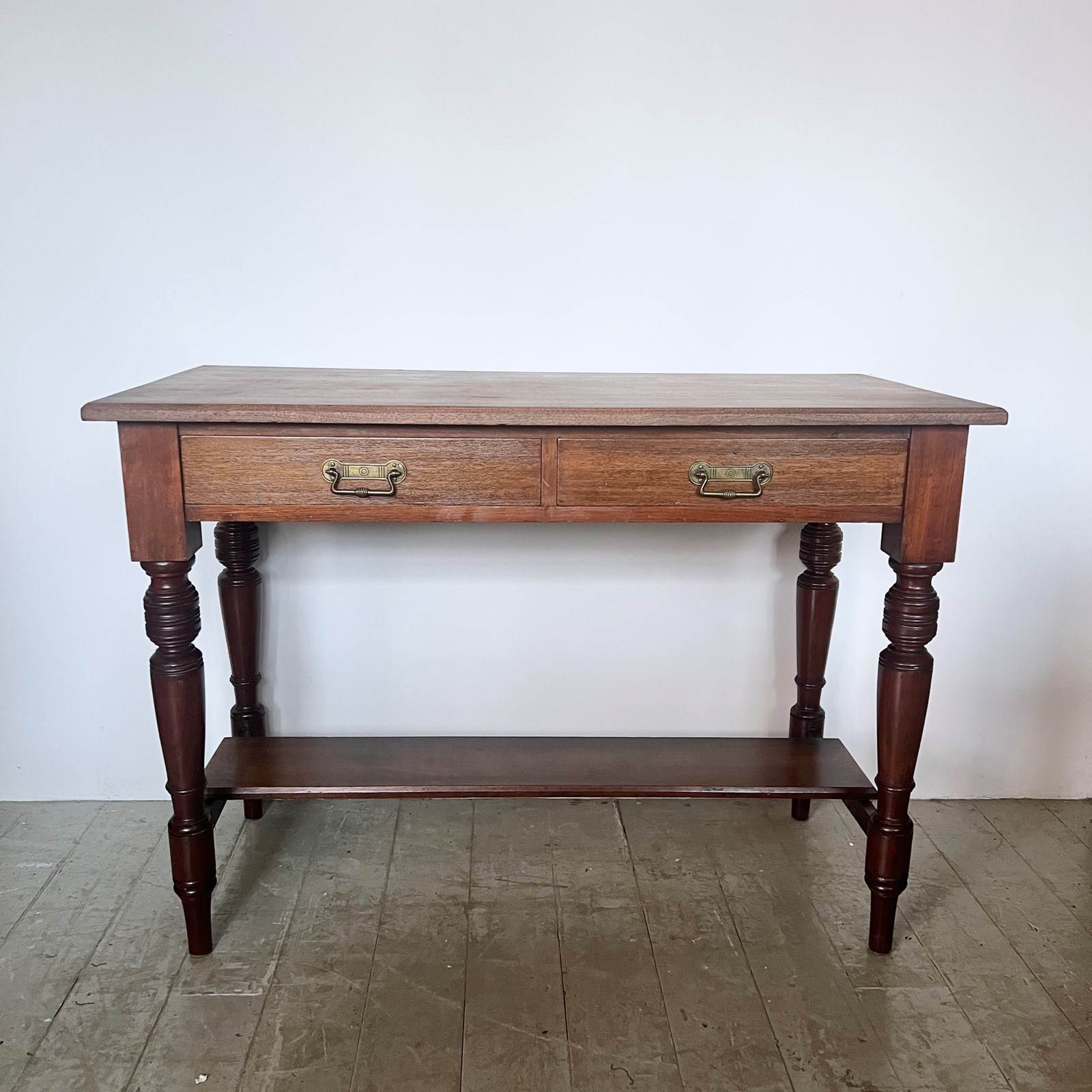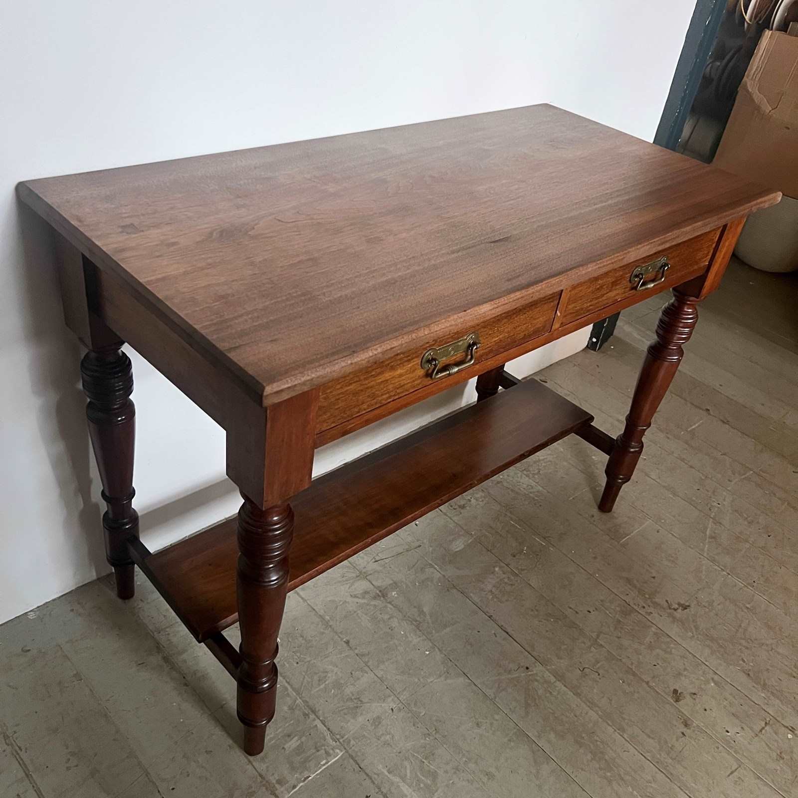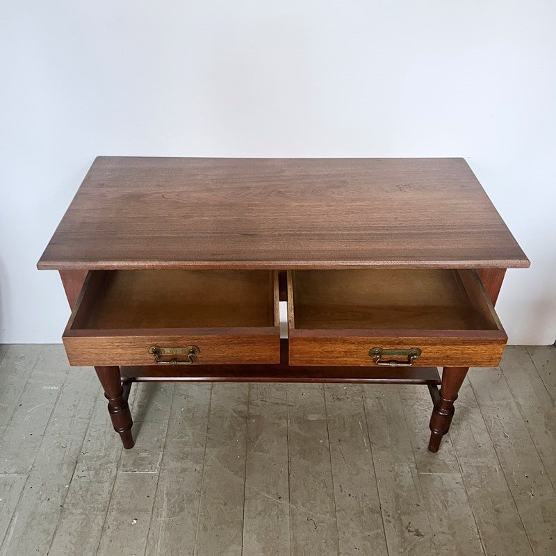 Solid wood console table with two drawers with original brass handles. The top has been refinished.