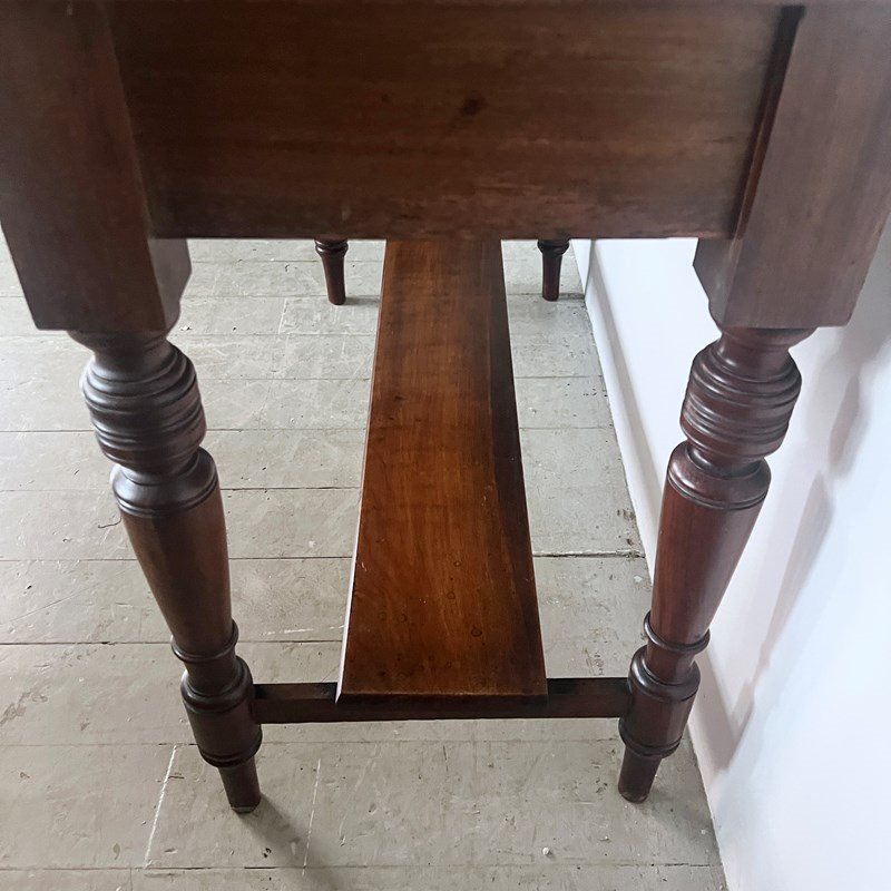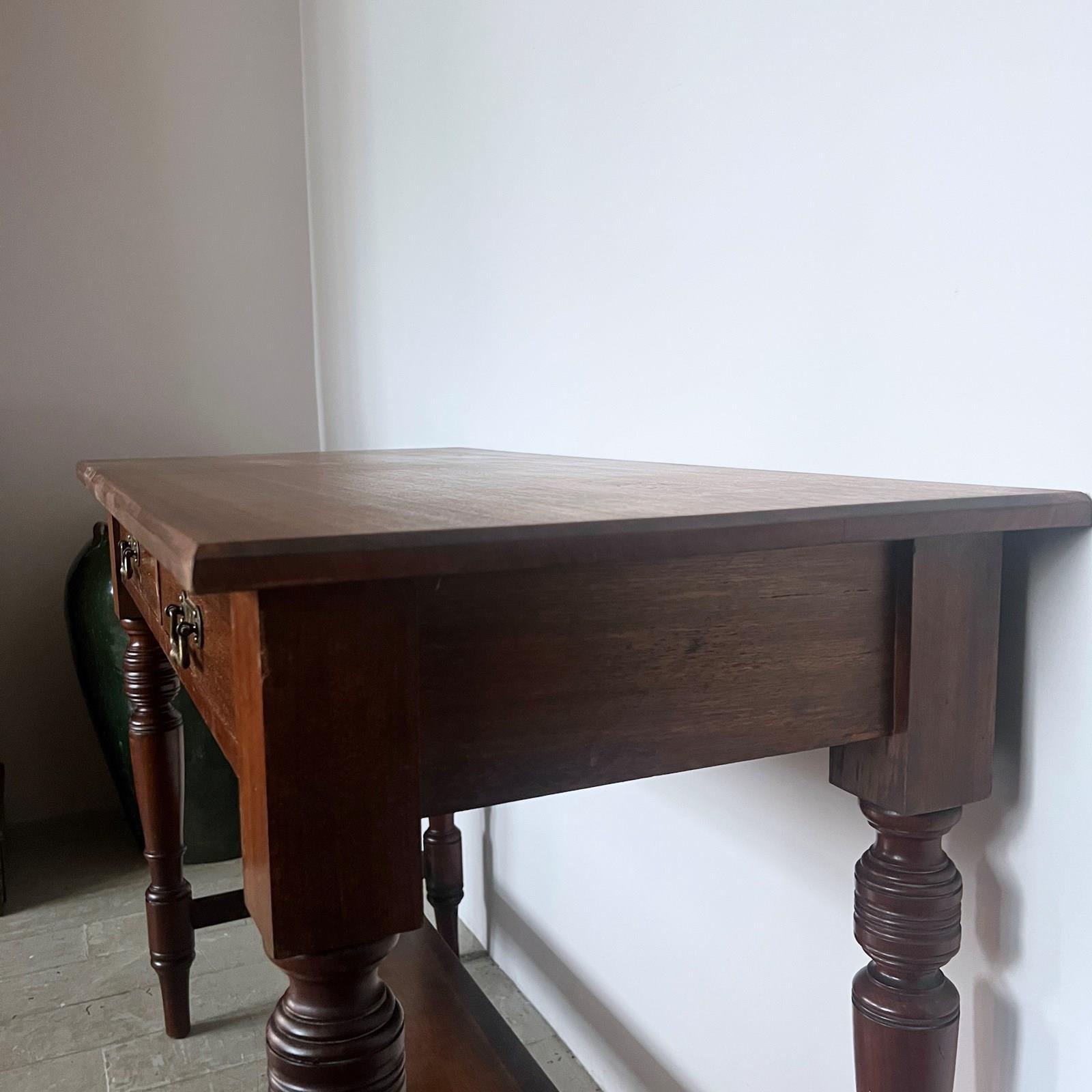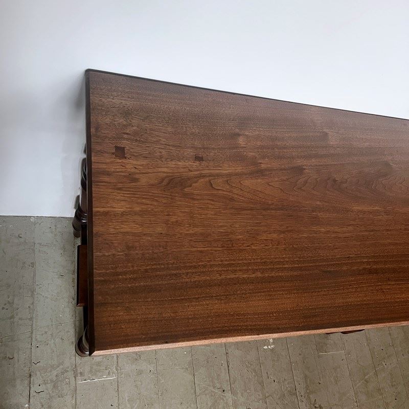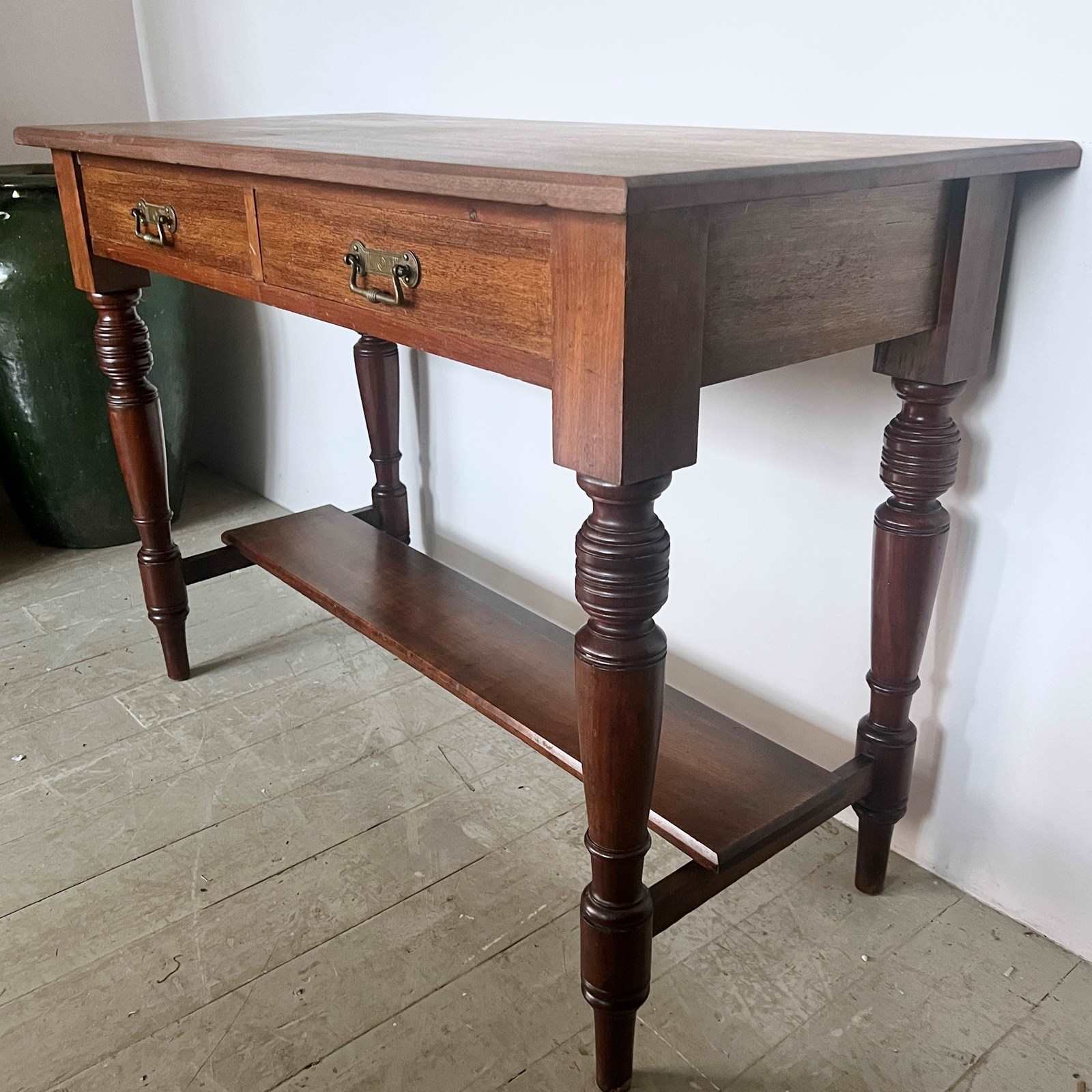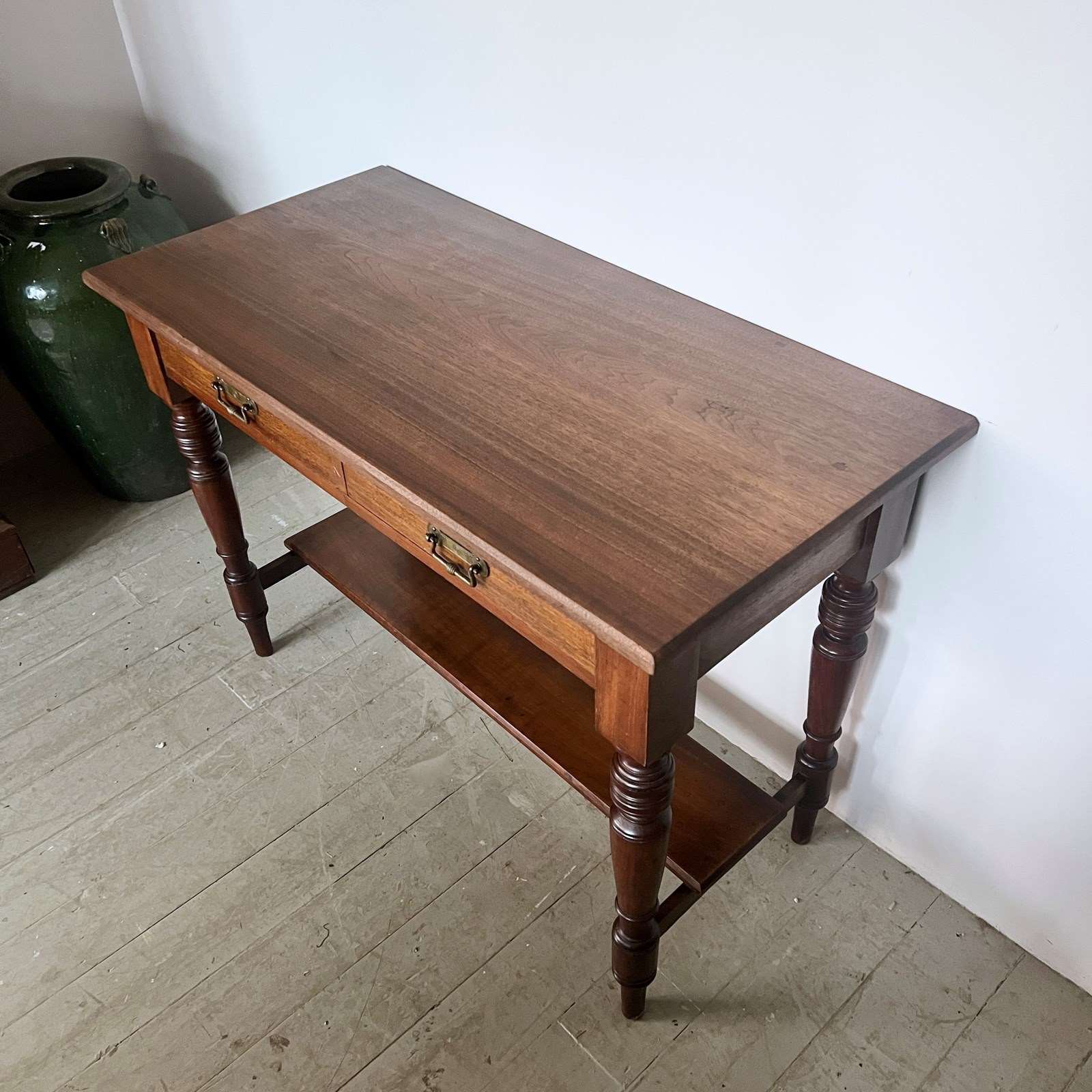 Solid wood console table with two drawers with original brass handles. The top has been refinished.