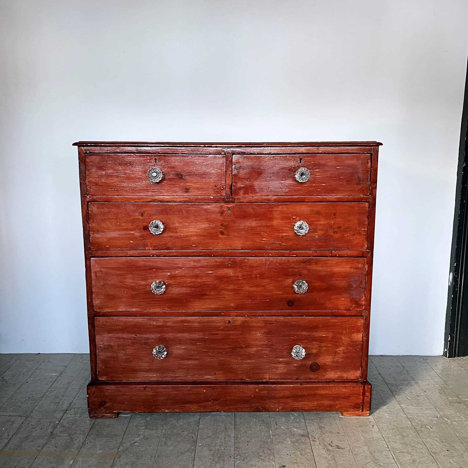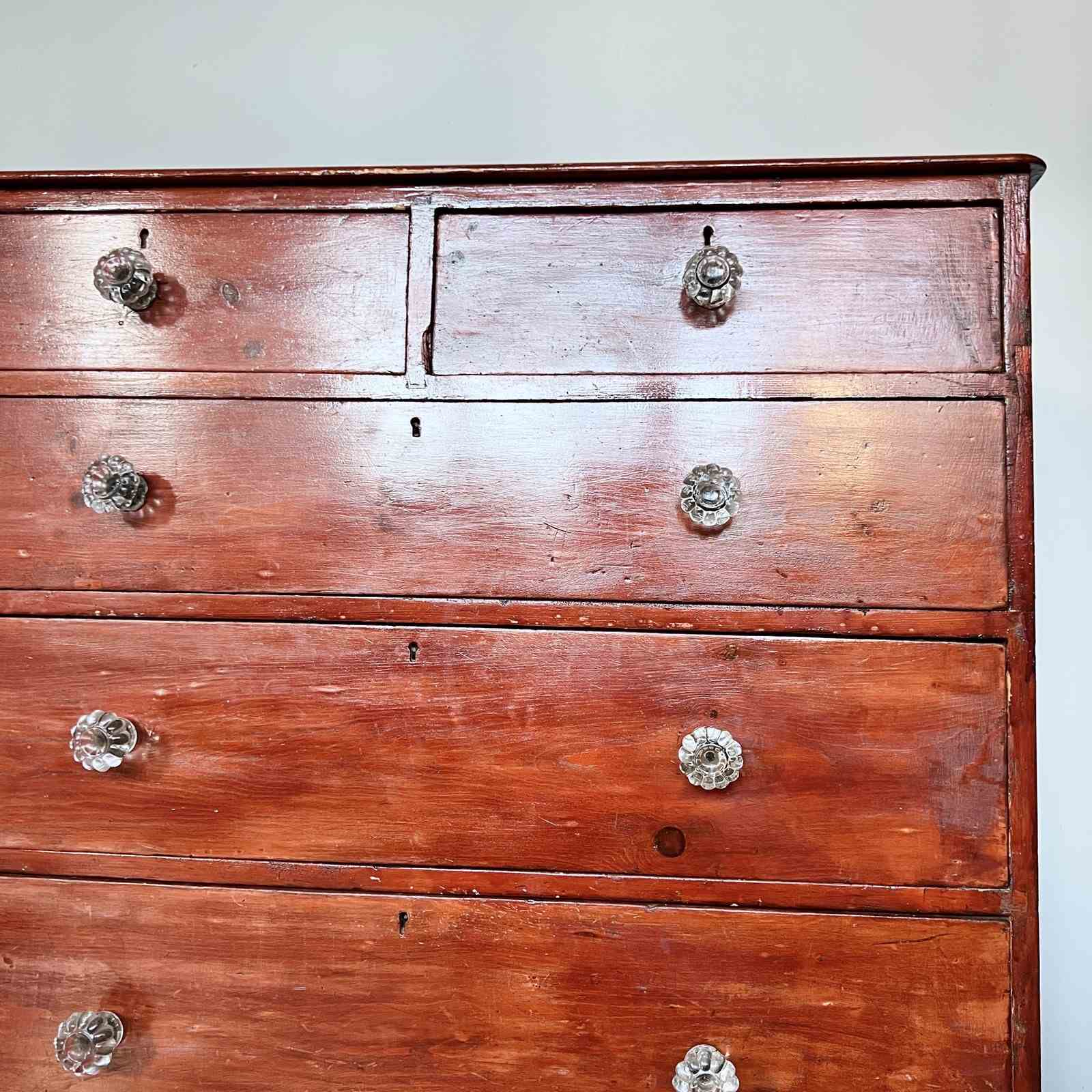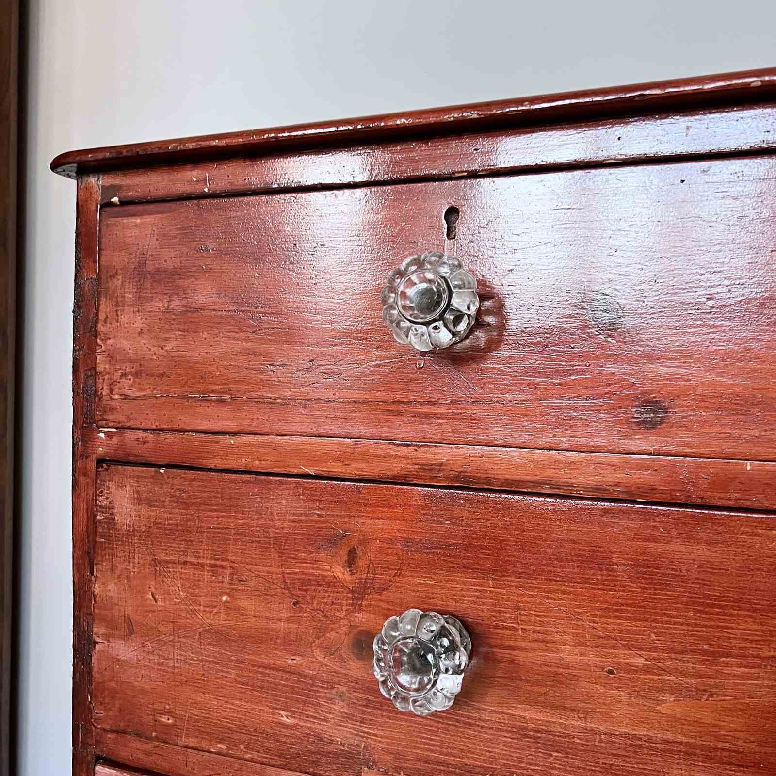 Victorian pine chest of drawers with original glass handles. The piece has been previously stained with a high gloss red stain. The handles have some damage to them. Please see photos.