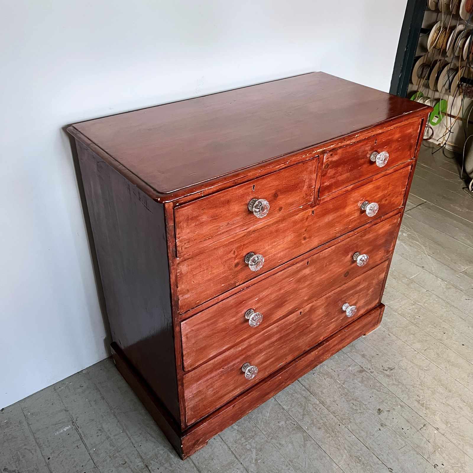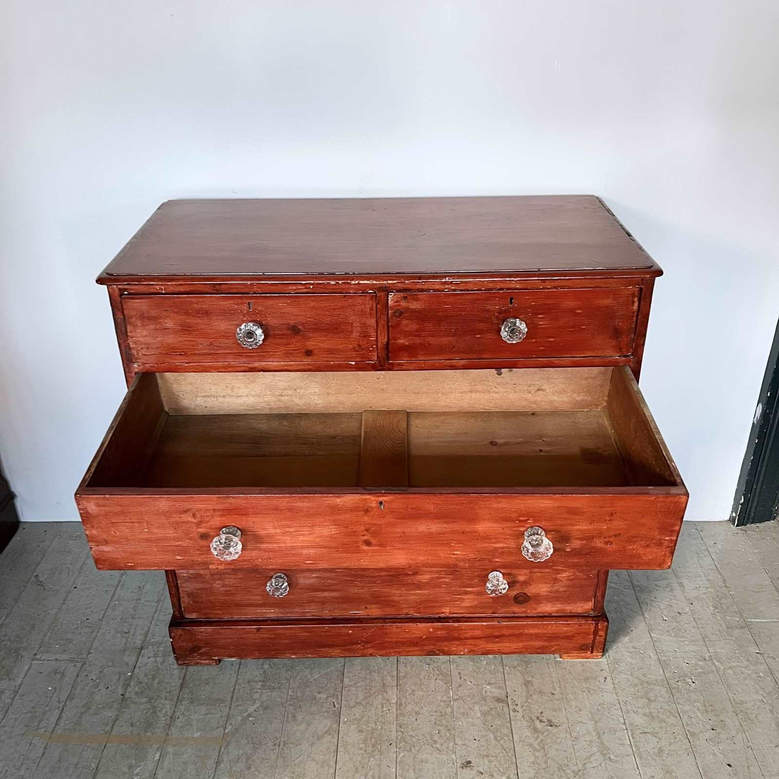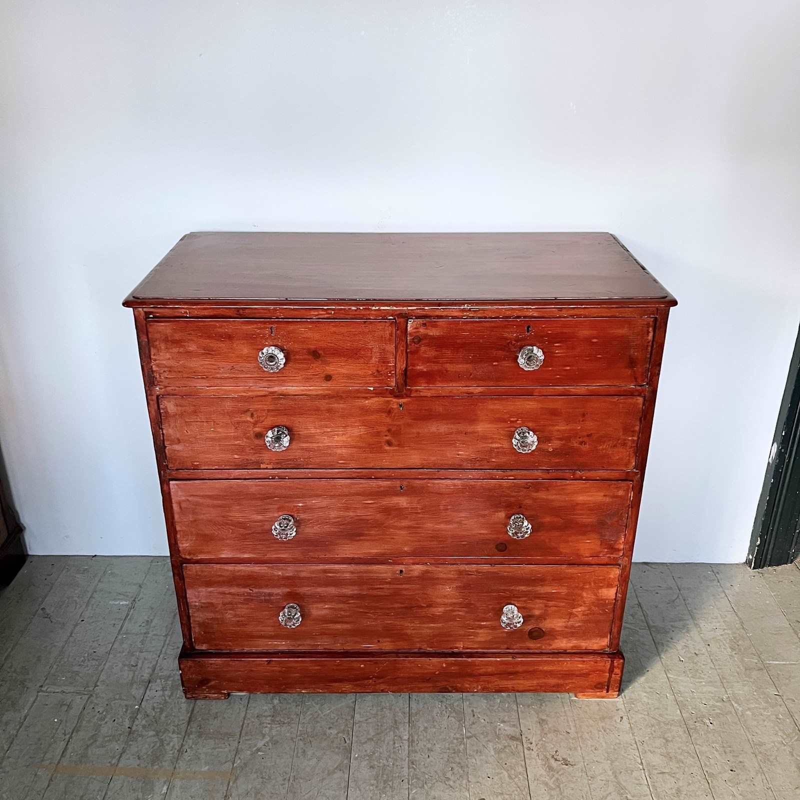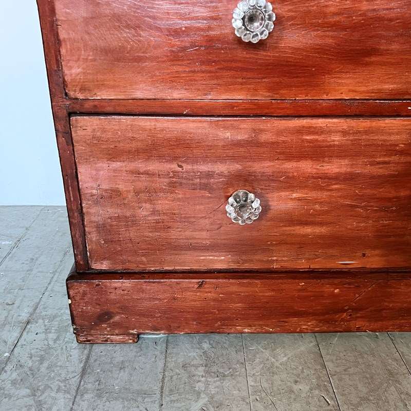 Victorian pine chest of drawers with original glass handles. The piece has been previously stained with a high gloss red stain. The handles have some damage to them. Please see photos.