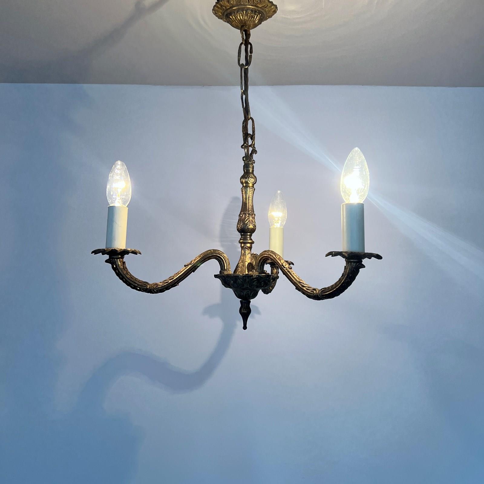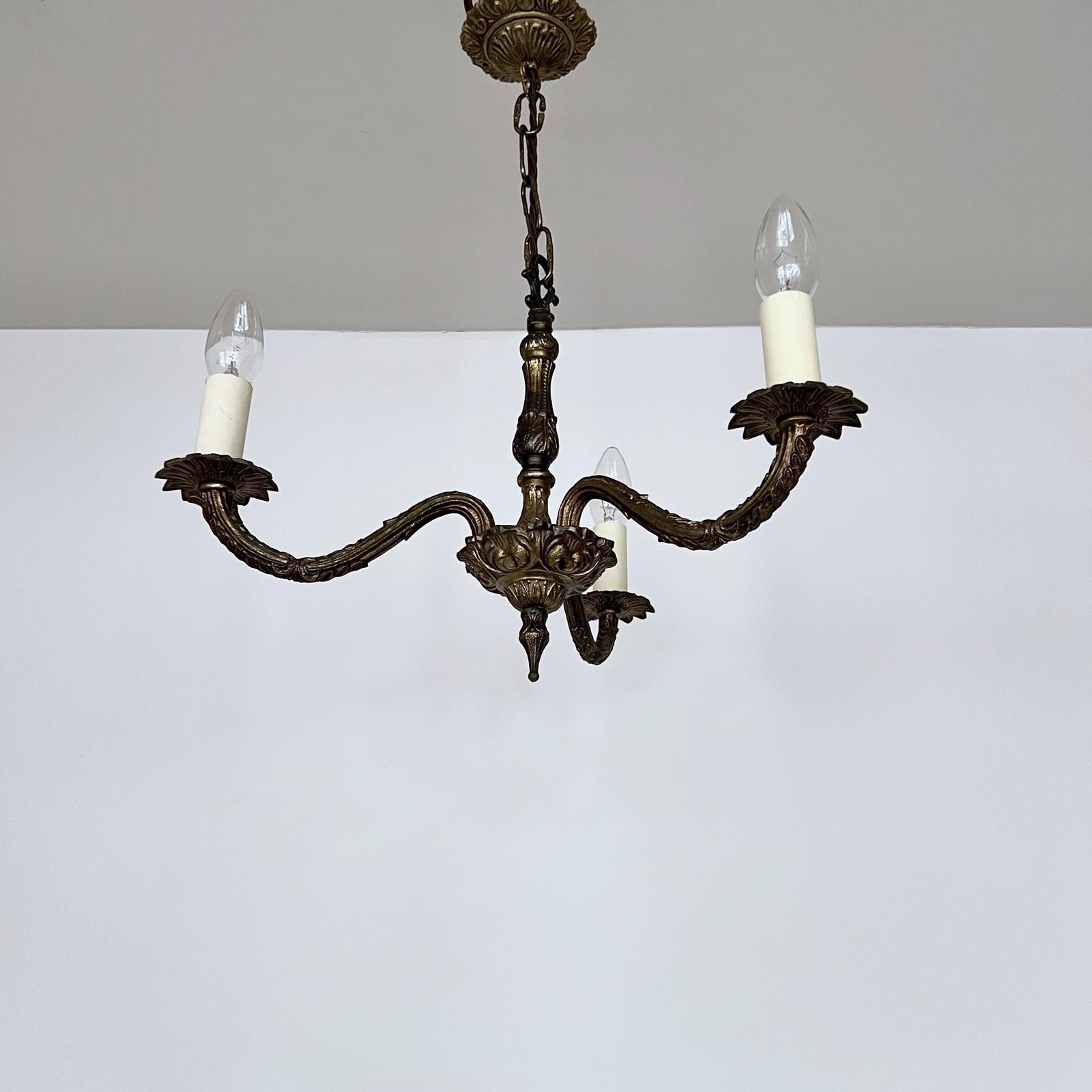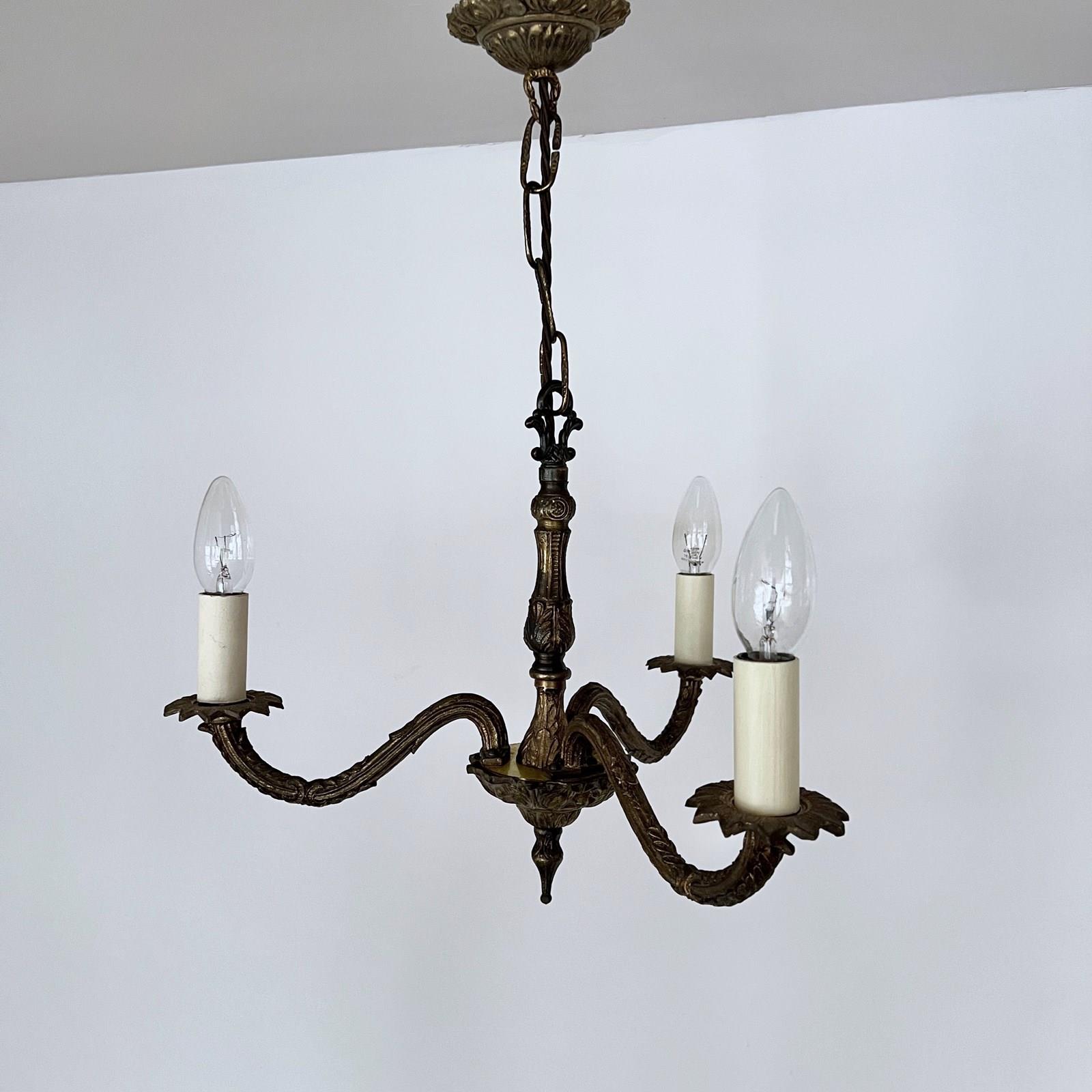 Ornate cast brass chandelier three brass decorative arms. The chandelier comes supplied with braided flex, chain and a ceiling rose. Chandelier requires SES lamps, these are not included but can be supplied.