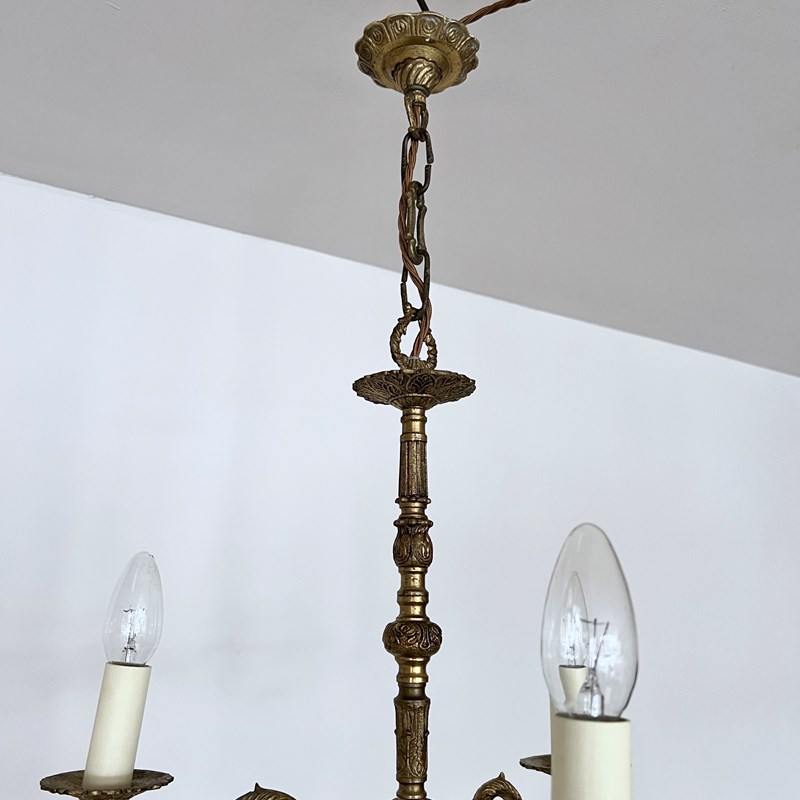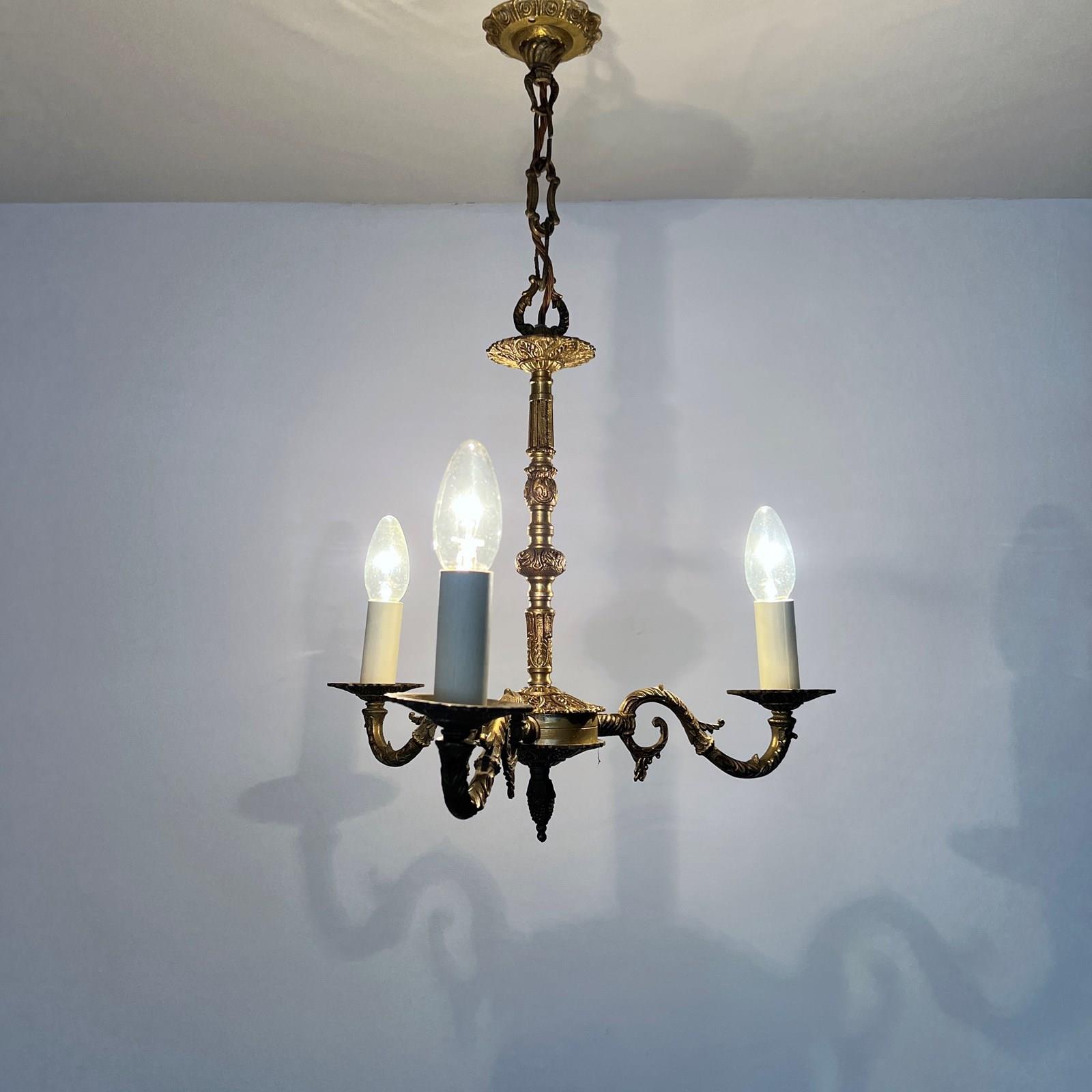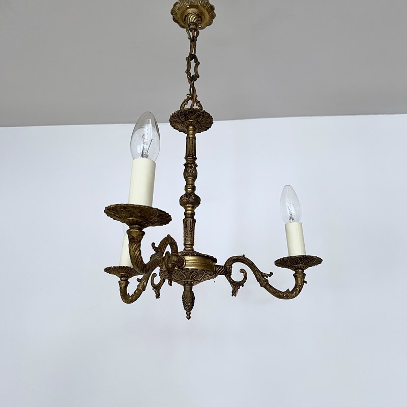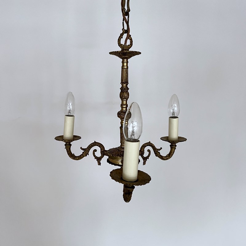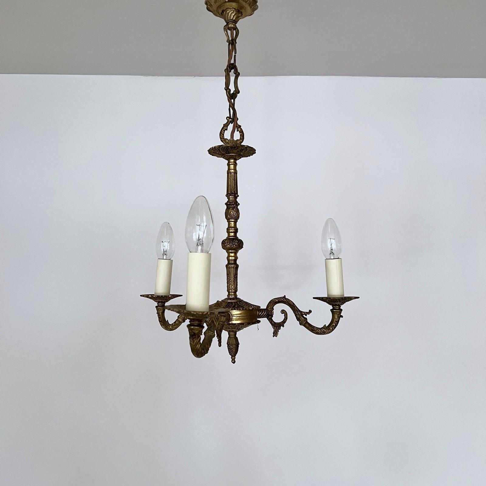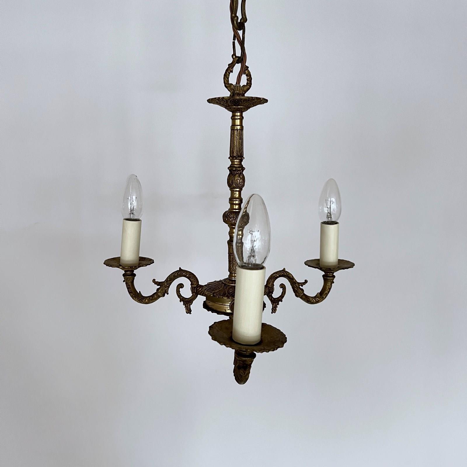 Ornate cast brass chandelier three brass decorative arms. The chandelier comes supplied with braided flex, chain and a ceiling rose. Chandelier requires SES lamps, these are not included but can be supplied.