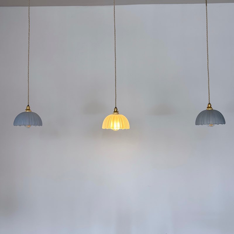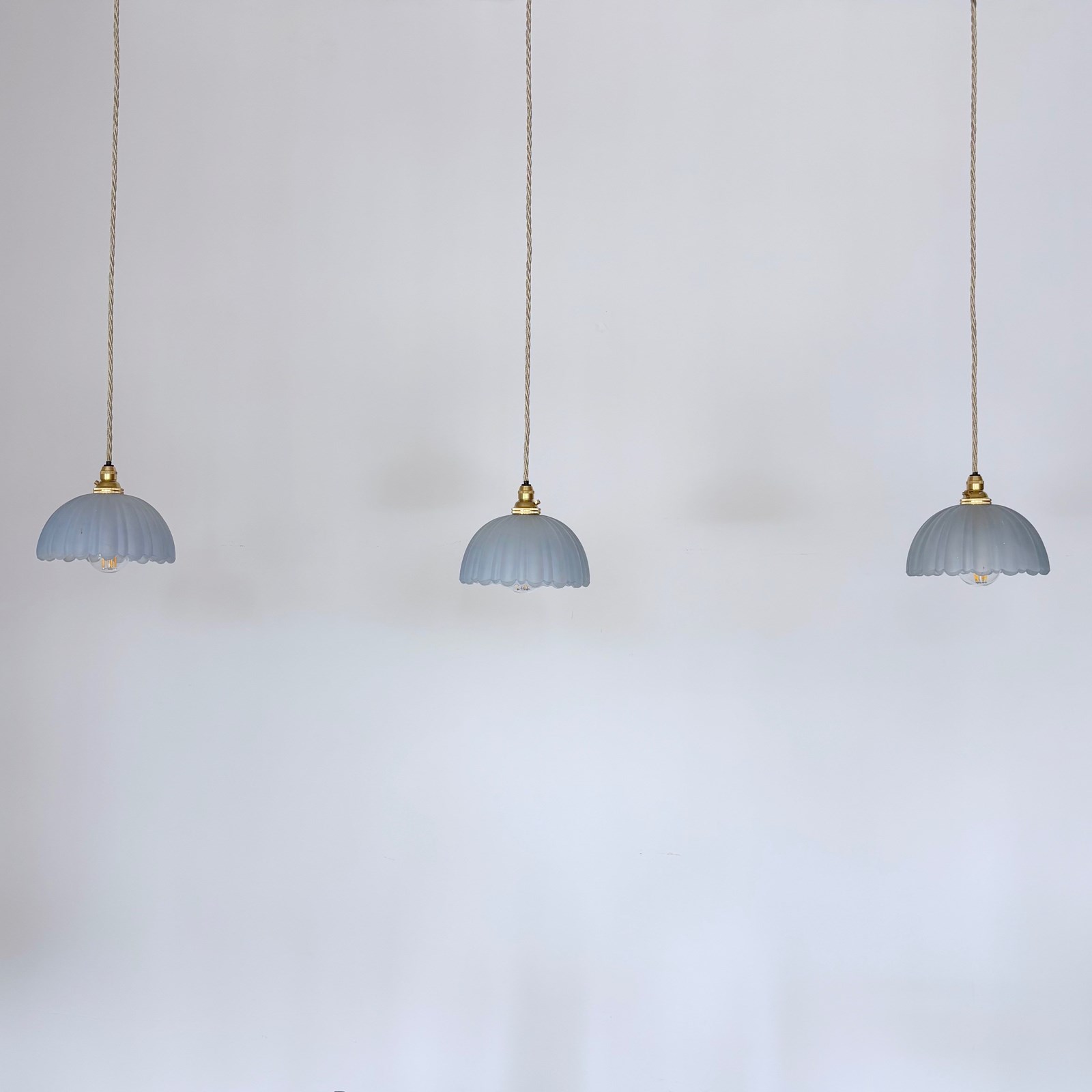 Set of three blue domed glass shades, each rewired with a polished brass lamp holder and beige braided flex. Each shade requires one B22 lamp. The coloured braided flex can be changed to your preference and a matching ceiling fitting is supplied.