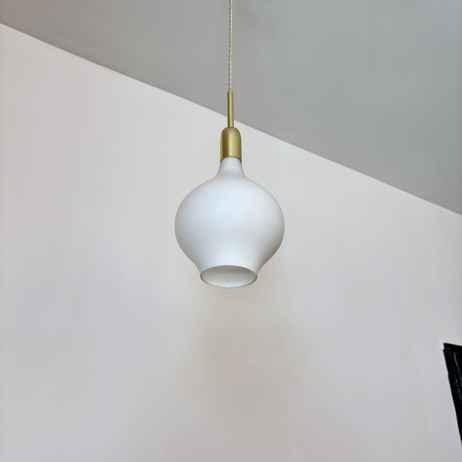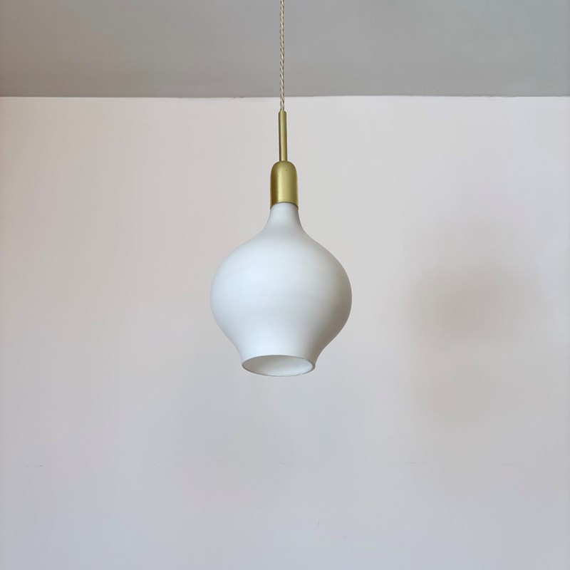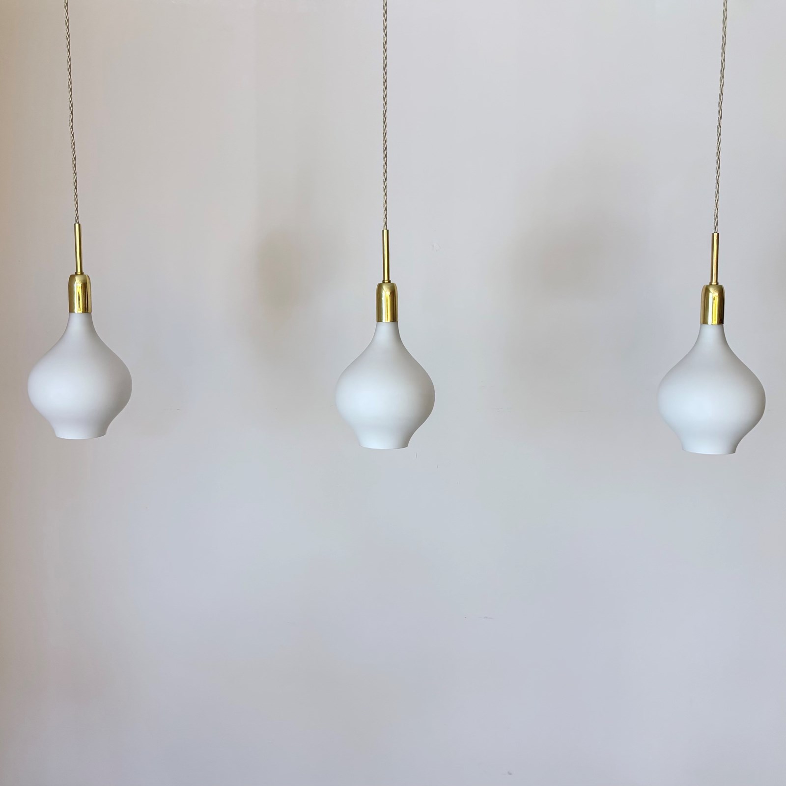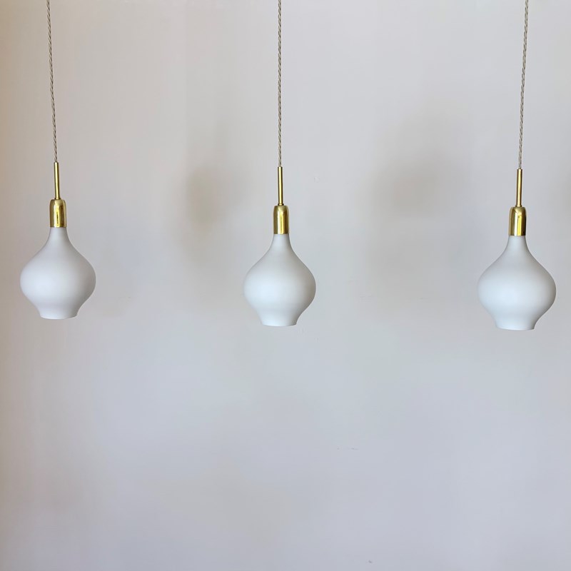 Set of three mid century shaped white glass shades, each rewired with a new brass fitting and beige braided flex. Each shade requires one B22 lamp. The coloured braided flex can be changed to your preference and a matching ceiling fitting is supplied.