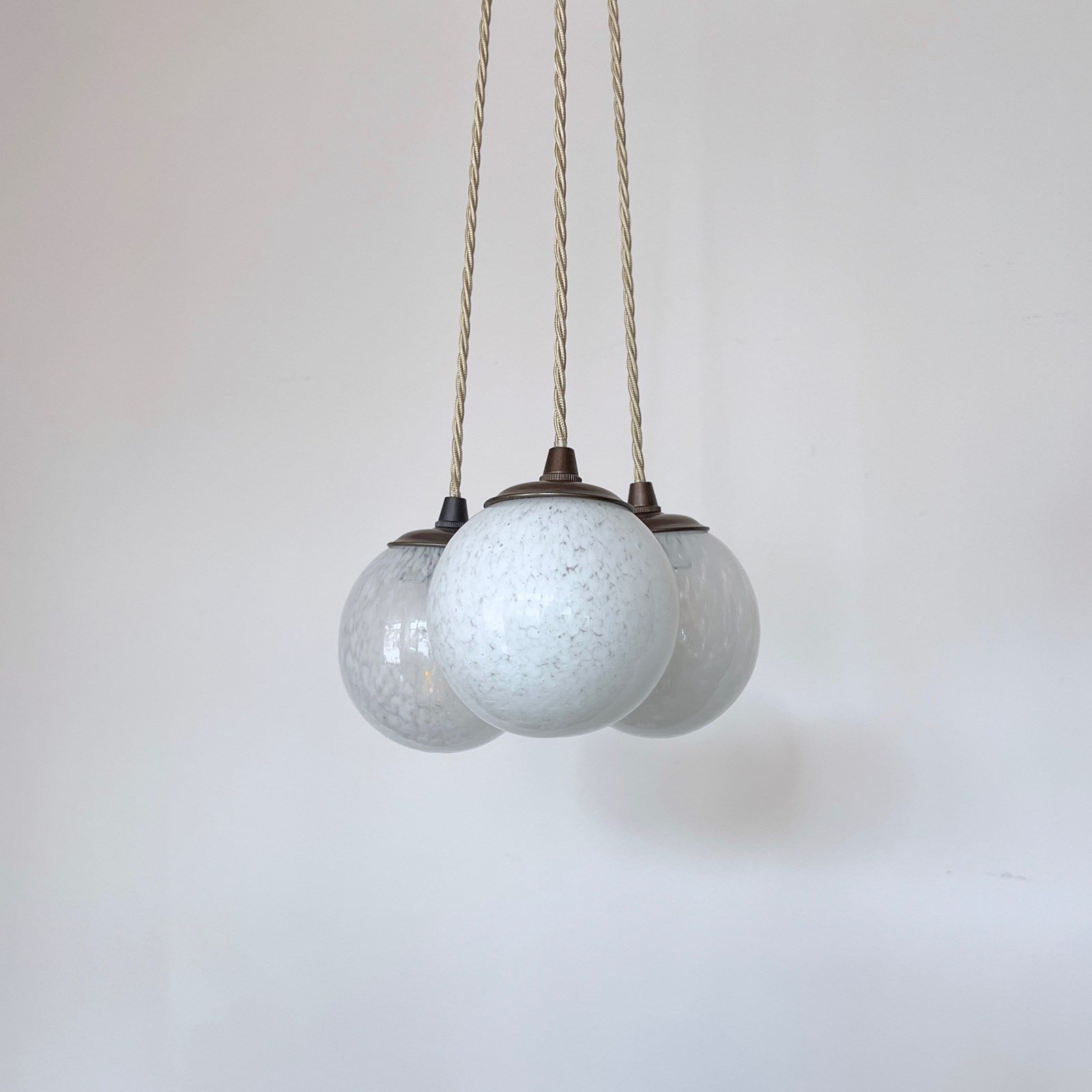 Three moulded mottled white glass globe shade pendants. Rewired with an antique brass finish fitting and beige braided flex. Each shade is slightly different and each requires one B15 pygmy lamp these is not included but can be supplied. The coloured flex can be changed to your preference and a matching ceiling fitting is supplied.