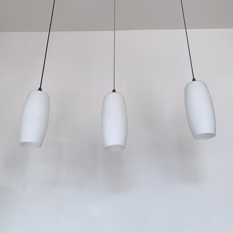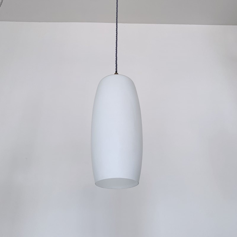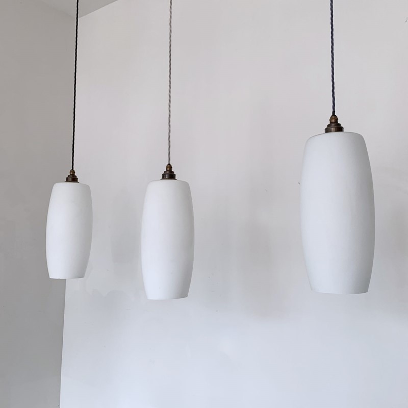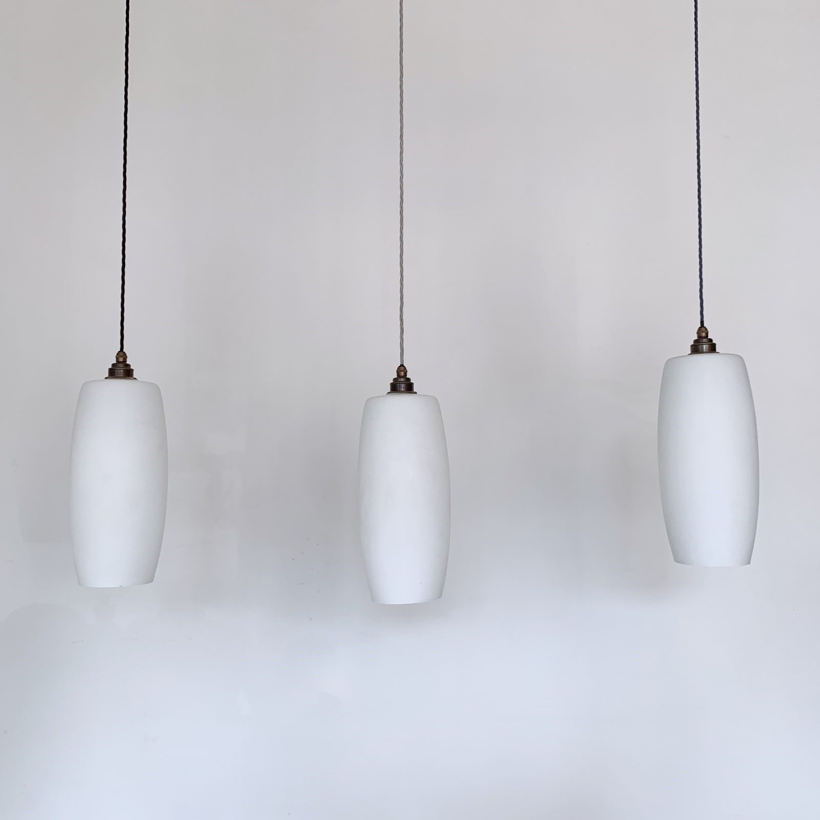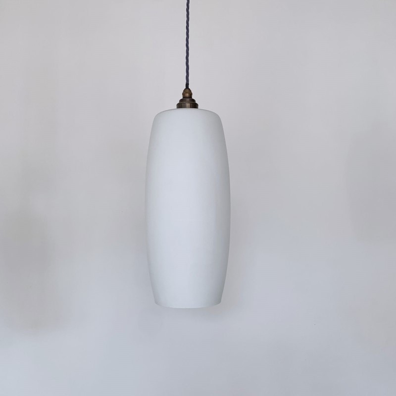 Tubular matte white glass shades. Rewired with an antique brass fitting and braided flex. Each shade requires one E27 lamp. The coloured flex can be changed to your preference and a matching ceiling fitting is supplied. These shades have been fully rewired here, in Stockport, near Manchester by our small team of experts and are now ready to be installed. We recommend that this is installed by an electrician into a joist or a supporting noggin. To clean dust the brass components and flex regularly with a soft cloth. The glass shade can then be wiped with a glass wipe or a cloth that has been sprayed with glass cleaner. A final wipe with a paper towel will give a polished finish.