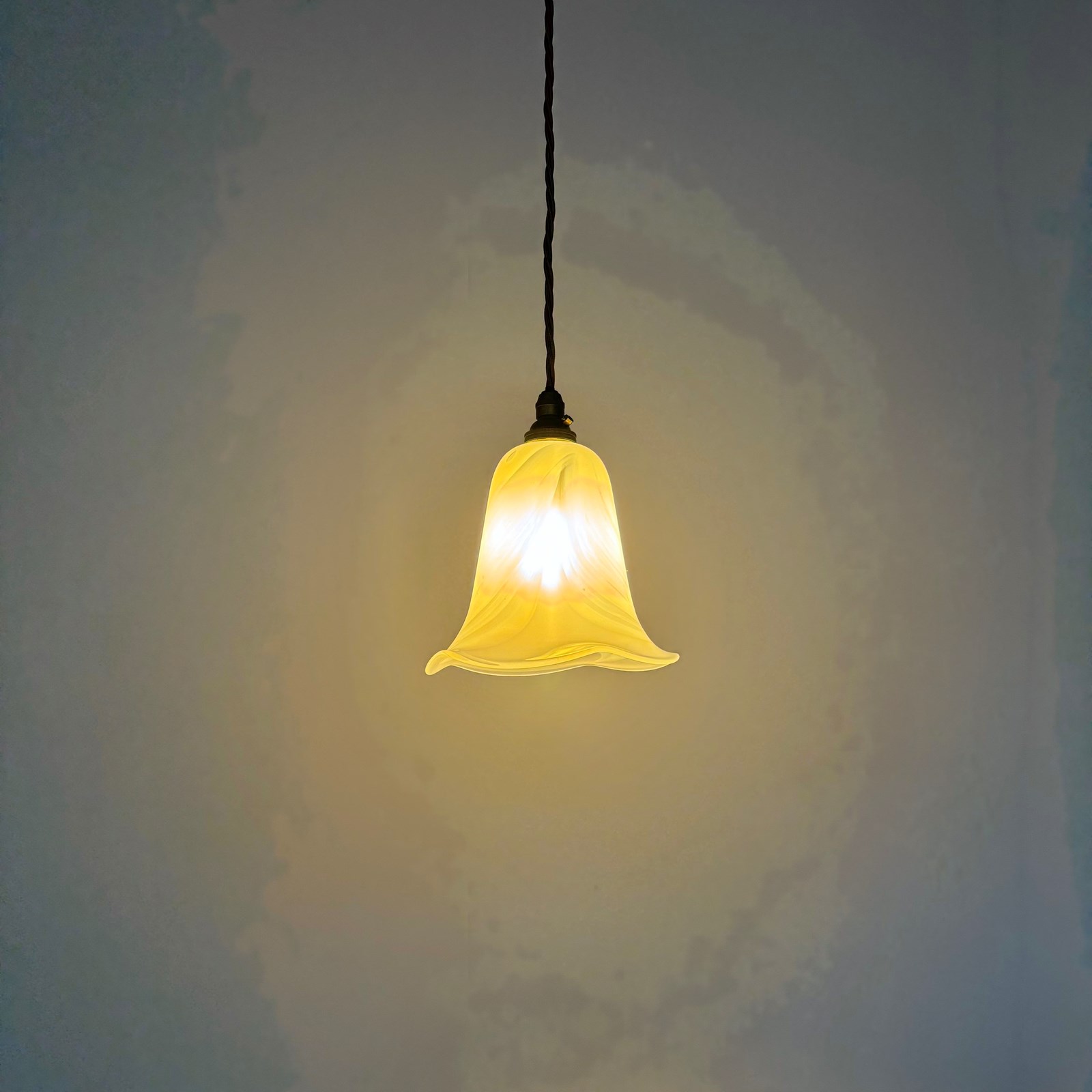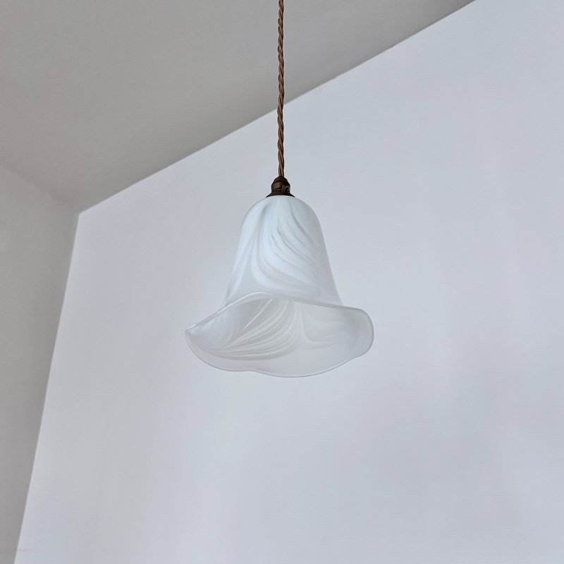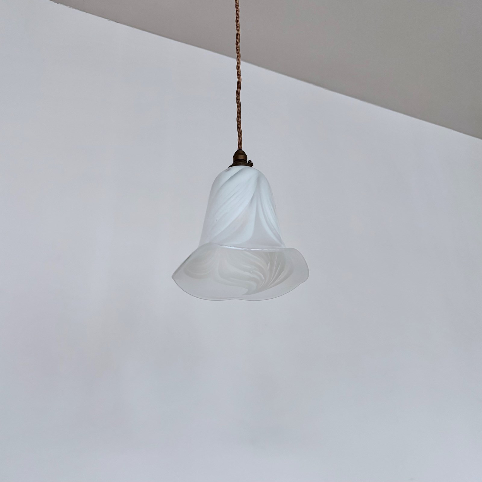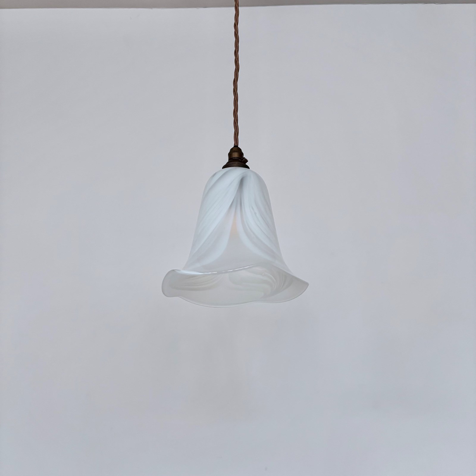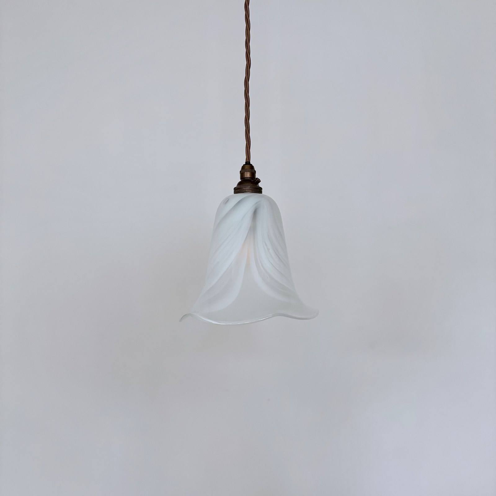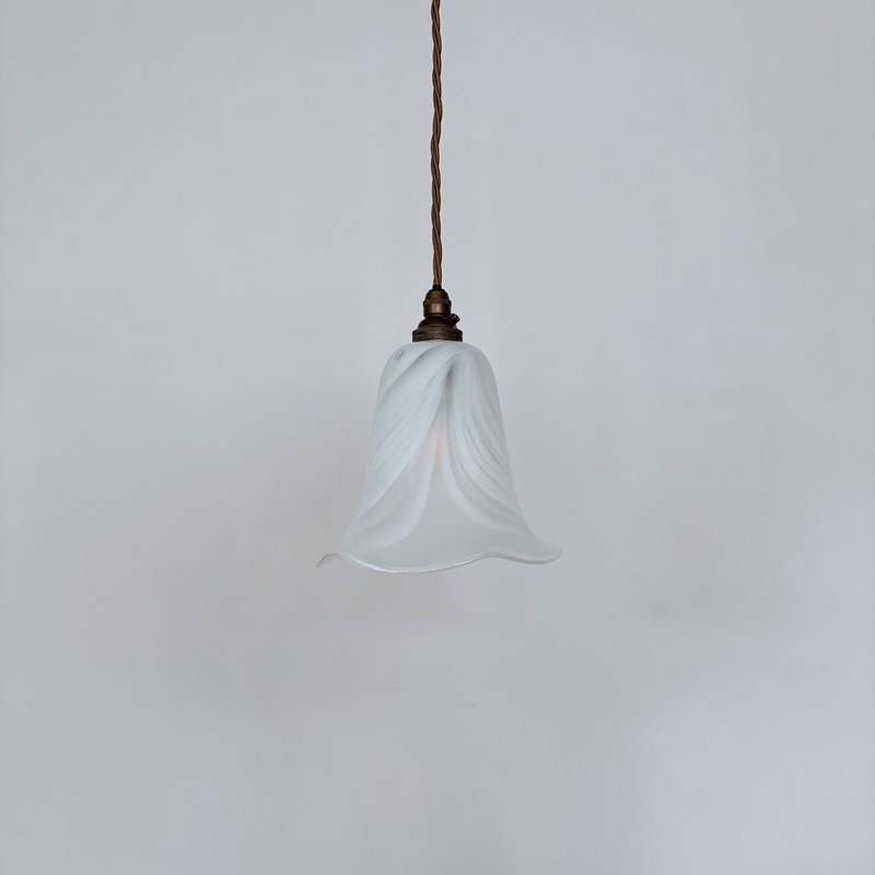 Tulip shape swirled white and clear glass shade. Rewired with an antique brass fitting and dark brown flex. This shade requires one B22 lamp. The coloured braided flexcan be changed to your preference and a matching ceiling fitting is supplied.