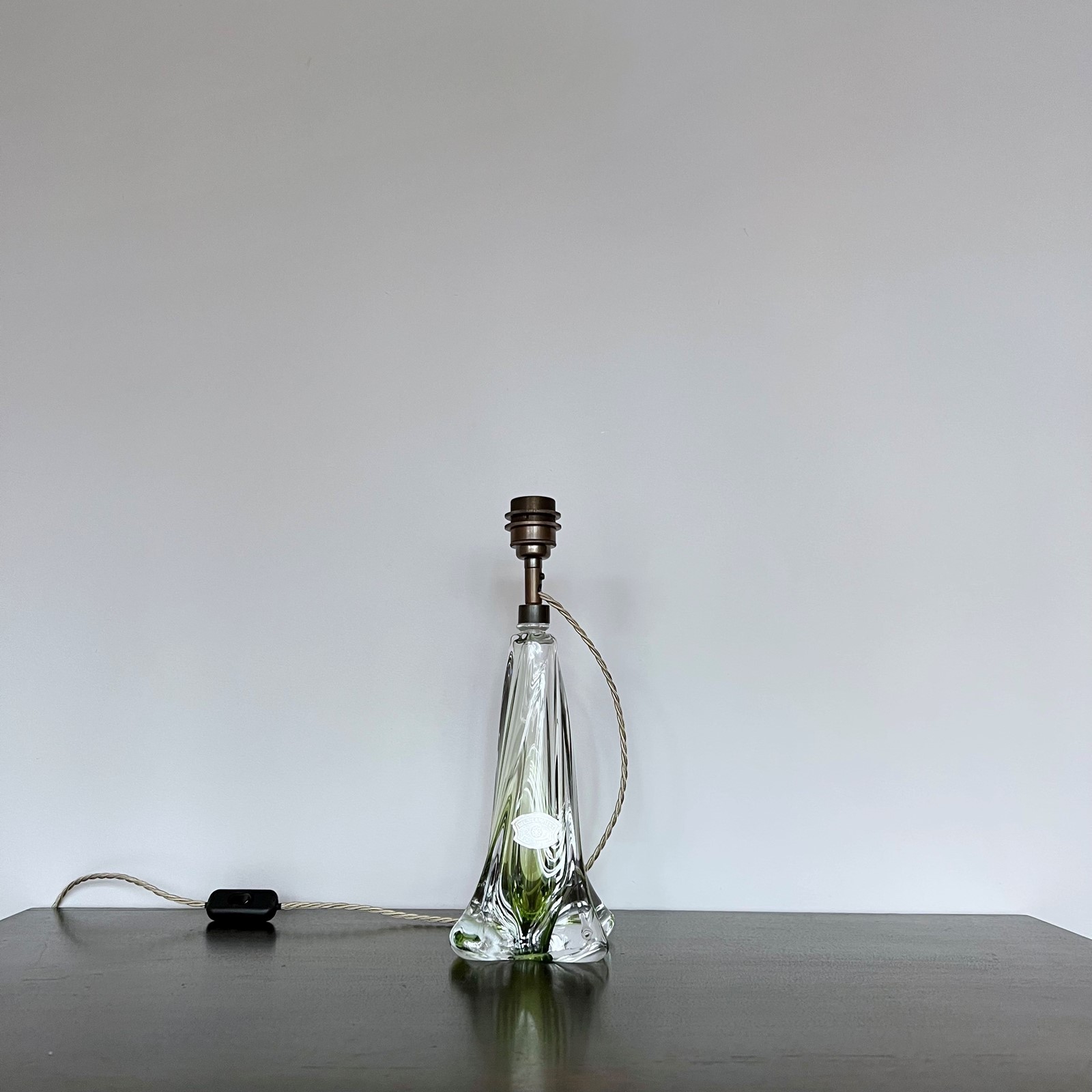 Vintage Belgian Val St Lambert Crystal lamp with lime green and clear glass. Made in the first half of the 20th Century it is a classic elegant piece. Rewired with an antique brass finish E27 lamp holder, beige braided flex with an inline switch and a black three pin plug. Shade not included. (Shade H: 14cm W: 20cm) This lamp has been fully restored and rewired here, in Stockport, near Manchester by our small team of experts and is now ready for it’s new home. We recommend that this piece is cleaned by dusting the metal components regularly with a soft cloth or brush. The glass can be wiped with a glass wipe or a cloth that has been sprayed with glass cleaner. A final wipe with a paper towel will give a polished finish.