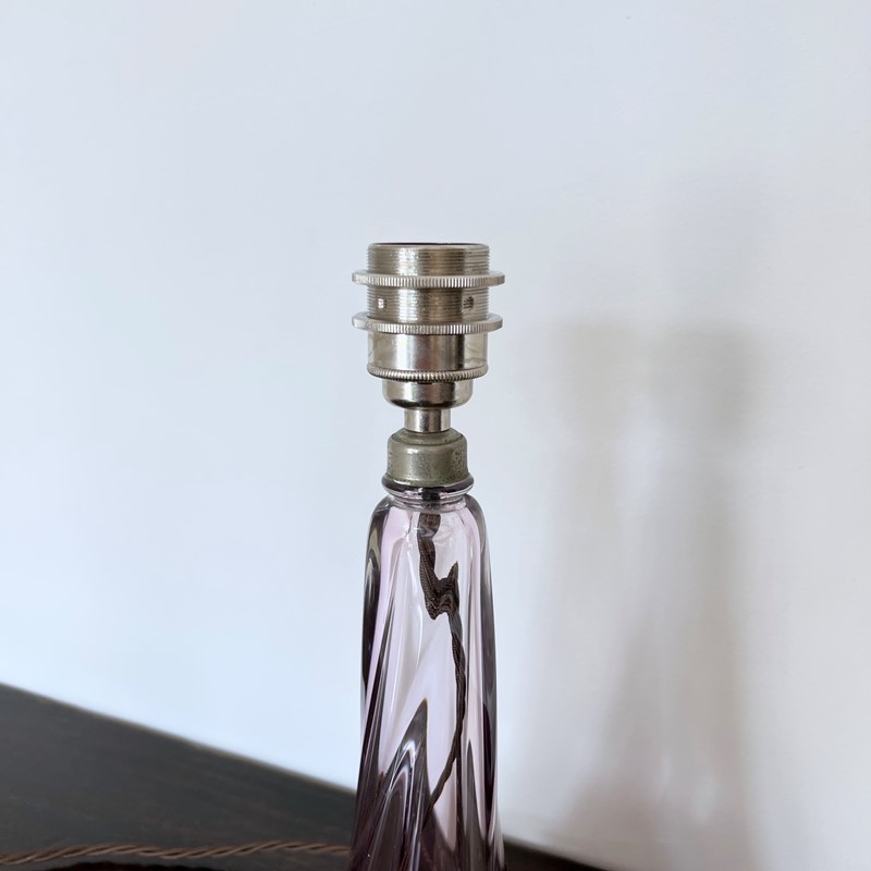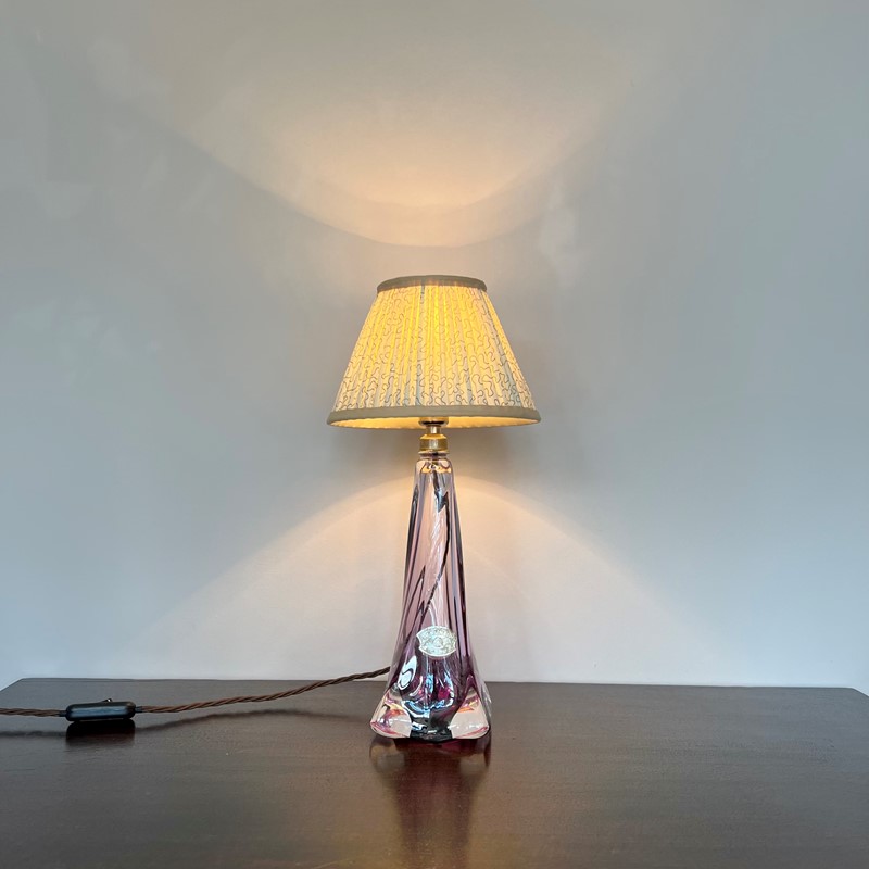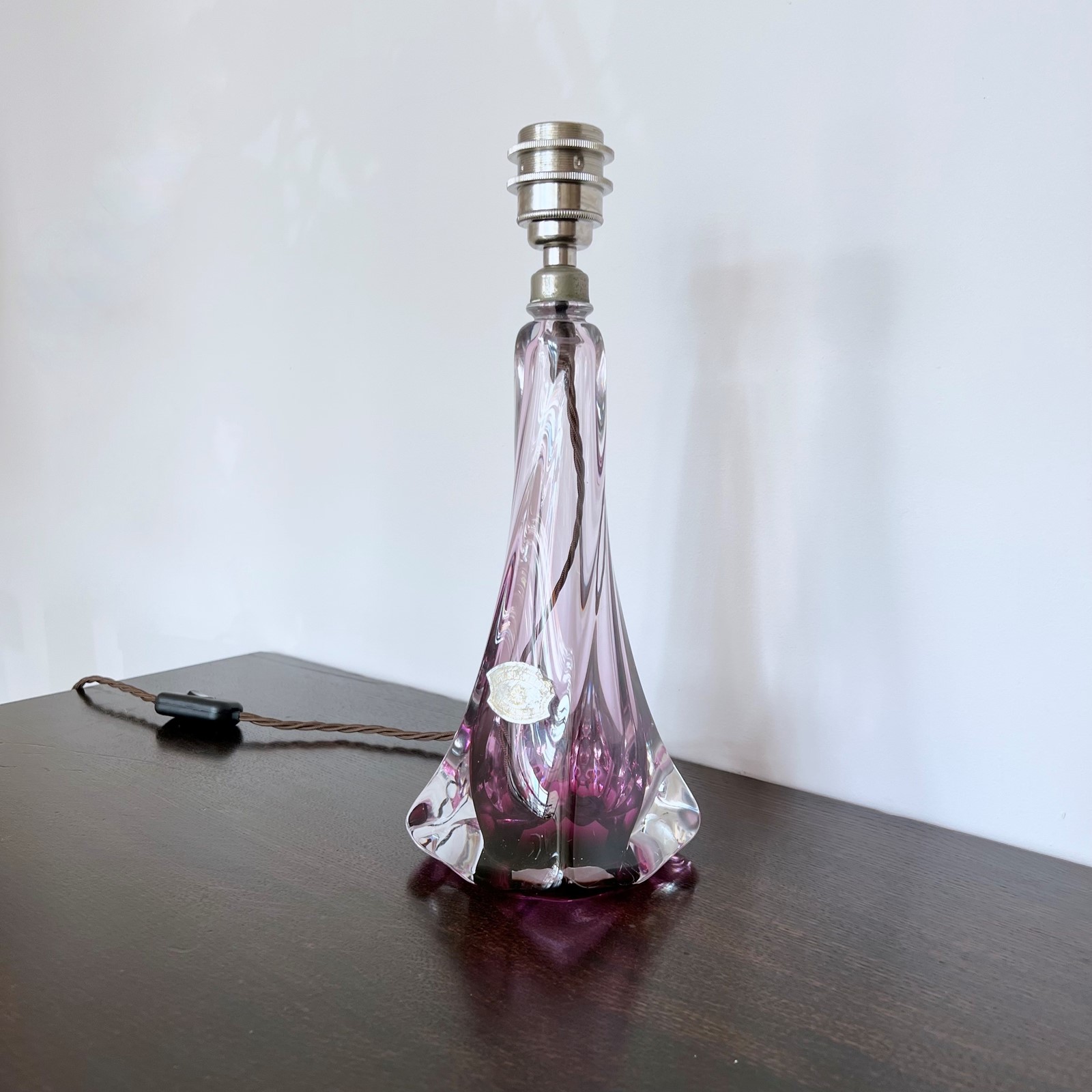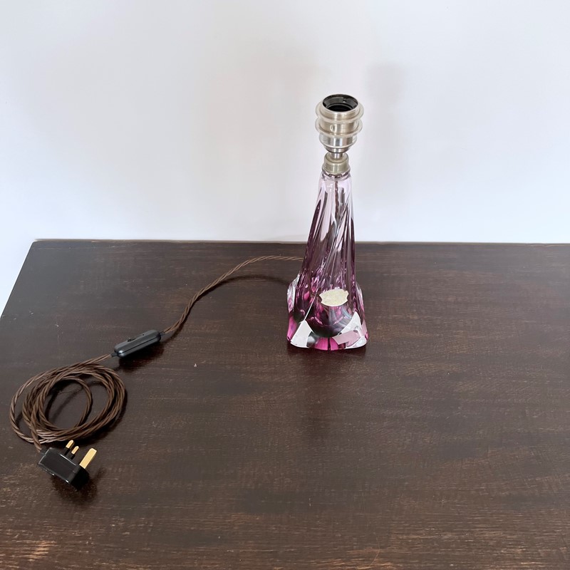 Vintage Belgian Val St Lambert Crystal lamp with purple and clear glass. Made in the first half of the 20th Century it is a classic elegant piece. Rewired with a nickel plated E27 lamp holder, brown braided flex with an inline switch and a black three pin plug. Shade not included. (Shade H: 14cm W: 20cm) This lamp has been fully restored and rewired here, in Stockport, near Manchester by our small team of experts and is now ready for it’s new home. We recommend that this piece is cleaned by dusting the metal components regularly with a soft cloth or brush. The glass can be wiped with a glass wipe or a cloth that has been sprayed with glass cleaner. A final wipe with a paper towel will give a polished finish.