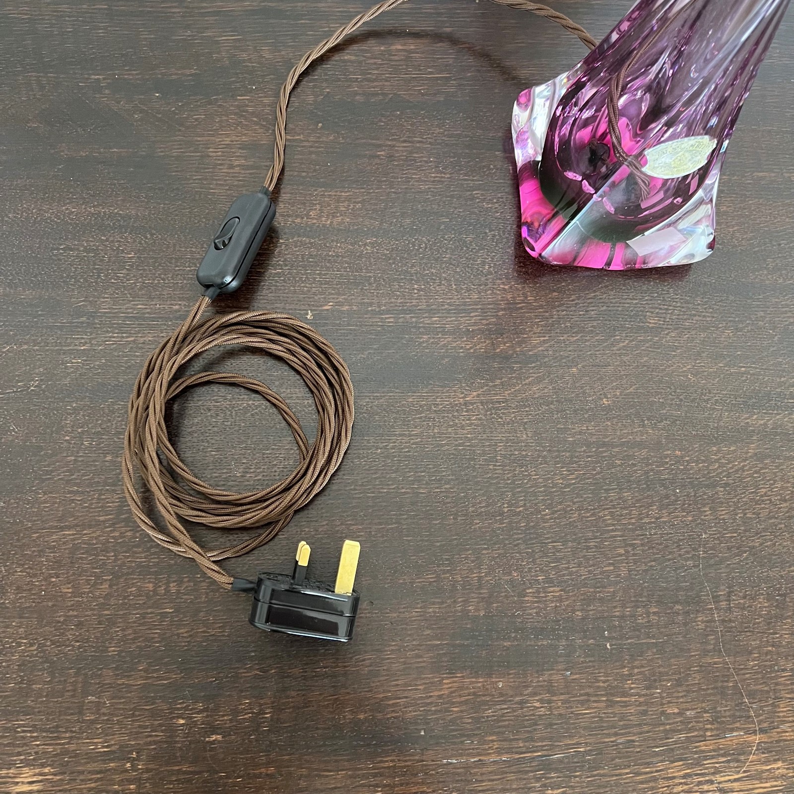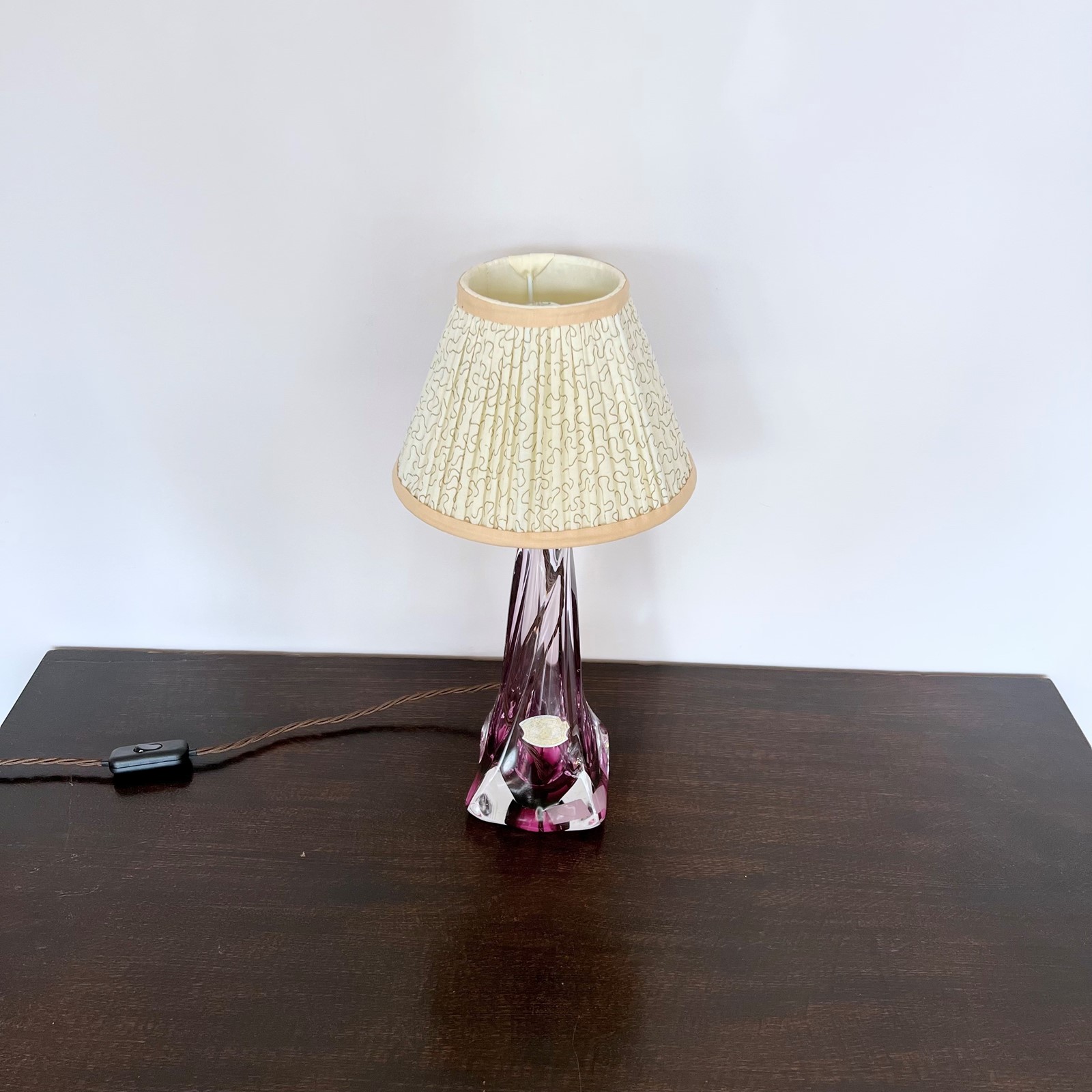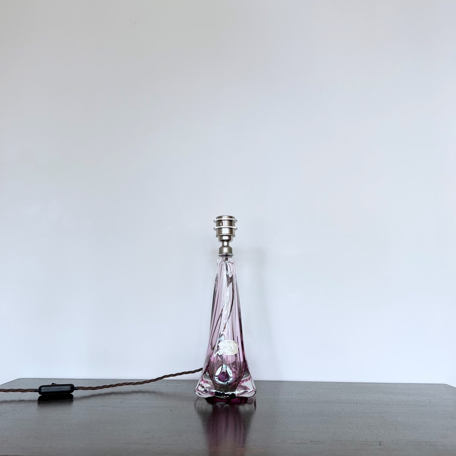 Vintage Belgian Val St Lambert Crystal lamp with purple and clear glass. Made in the first half of the 20th Century it is a classic elegant piece. Rewired with a nickel plated E27 lamp holder, brown braided flex with an inline switch and a black three pin plug. Shade not included. (Shade H: 14cm W: 20cm) This lamp has been fully restored and rewired here, in Stockport, near Manchester by our small team of experts and is now ready for it’s new home. We recommend that this piece is cleaned by dusting the metal components regularly with a soft cloth or brush. The glass can be wiped with a glass wipe or a cloth that has been sprayed with glass cleaner. A final wipe with a paper towel will give a polished finish.