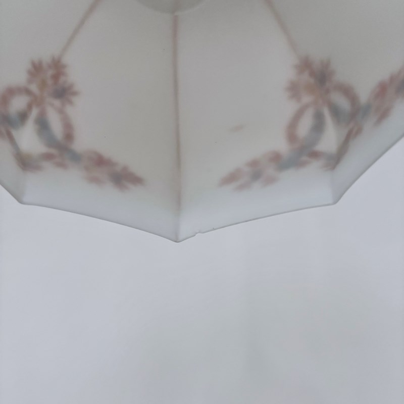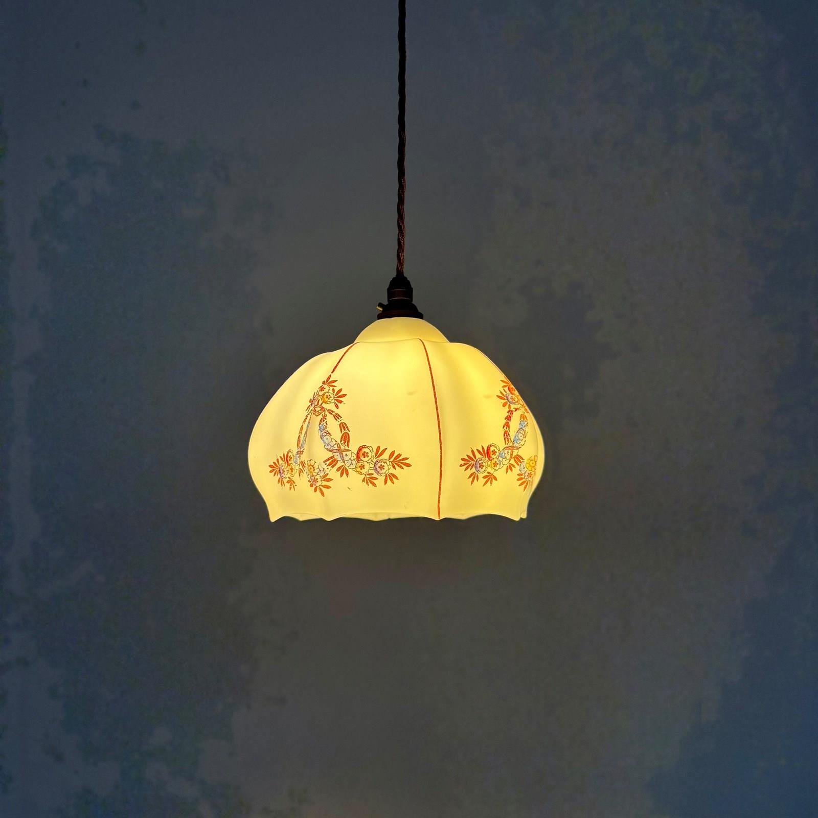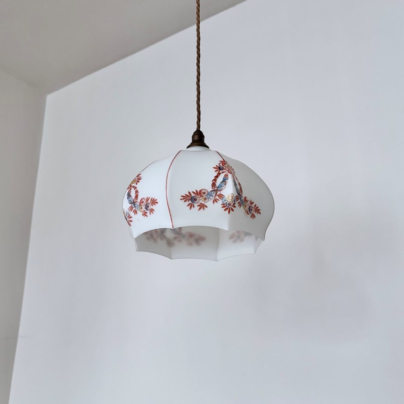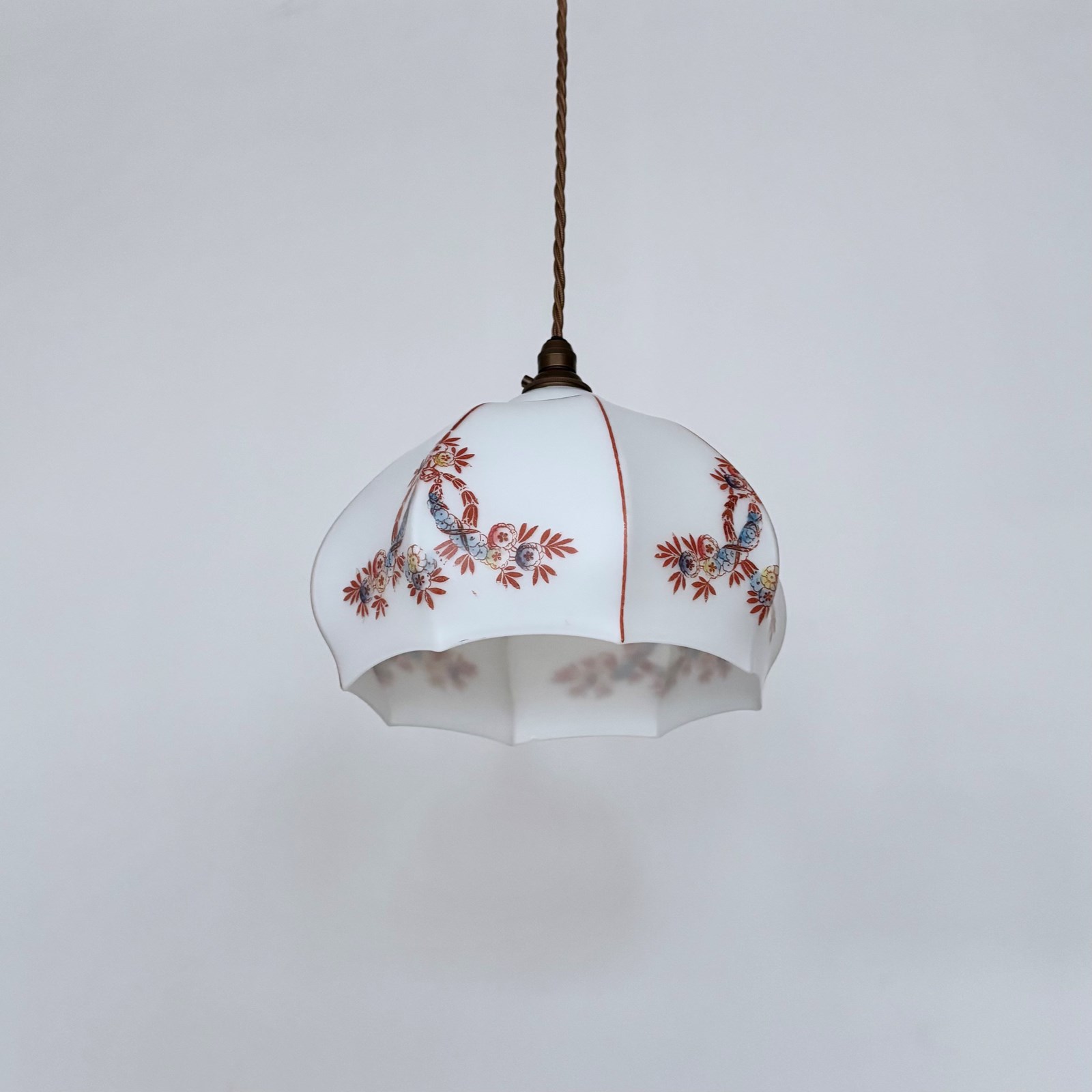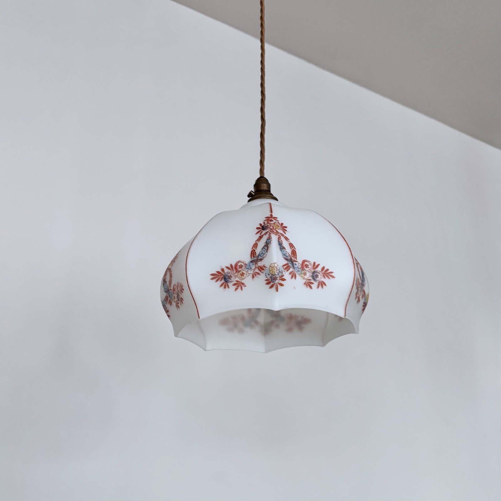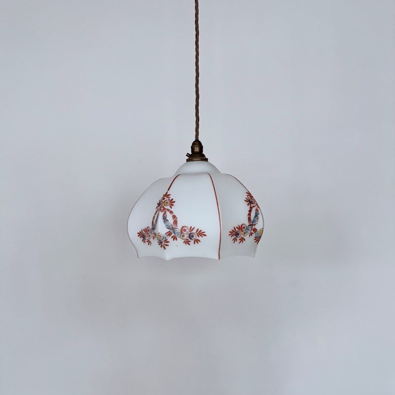 White glass shade with red, yellow and blue floral details. Rewired with an antique brass fitting and light brown braided flex. This piece has a small chip in the rim. Please see photos. This shade requires one B22 lamp. The coloured braided flex can be changed to your preference and a matching ceiling fitting is supplied.