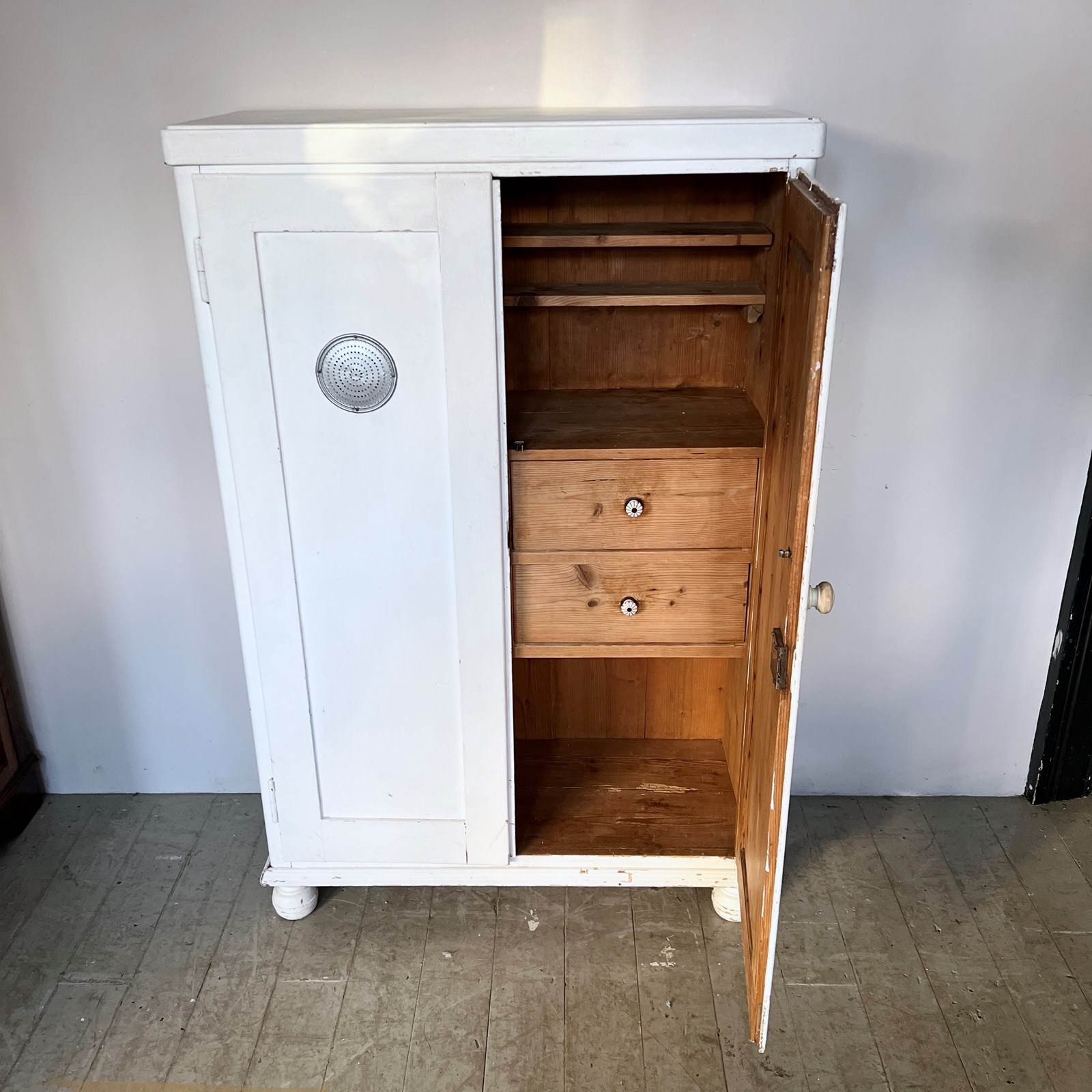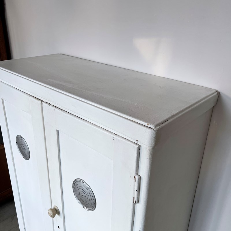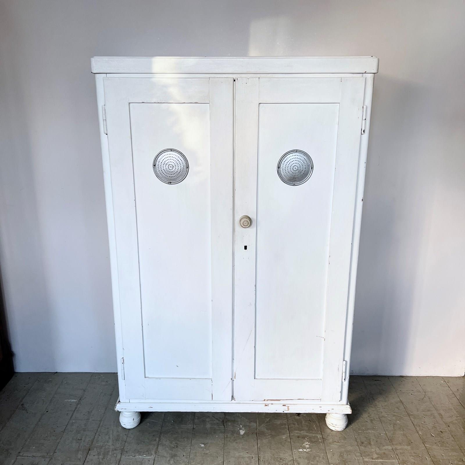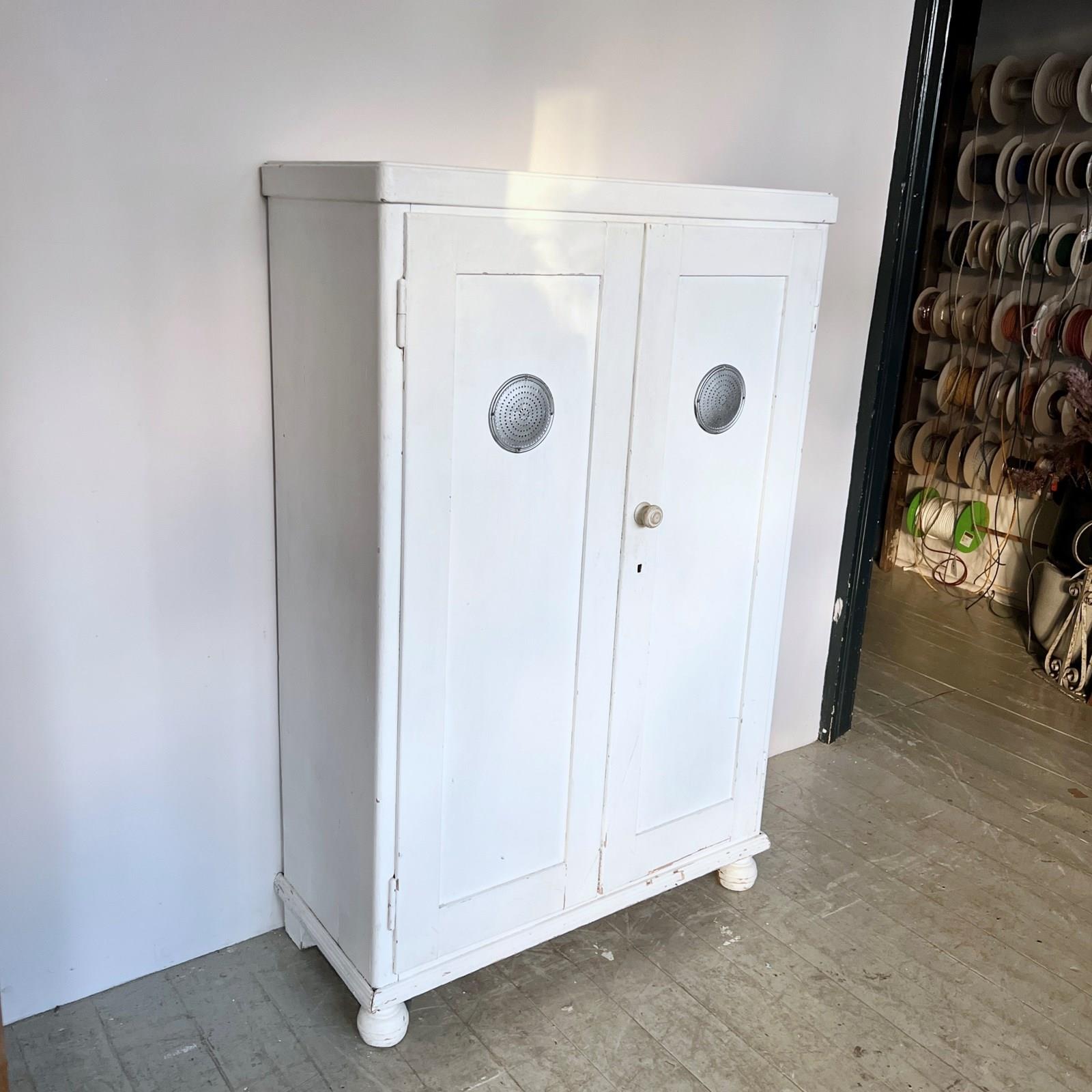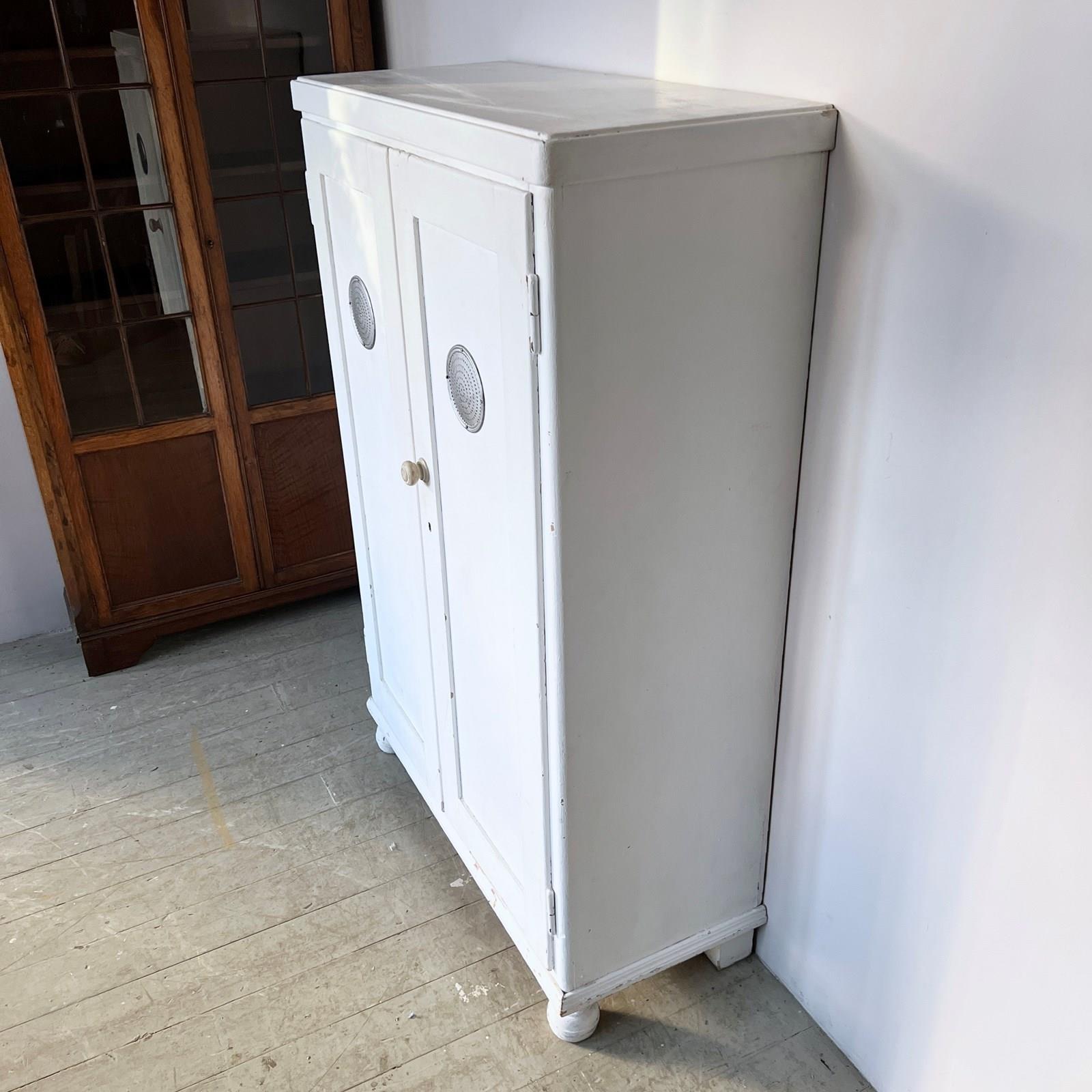 Victorian vented larder cupboard. The cupboard stands on square back legs and round turned front bun feet supporting the main section. The doors have two tall thin panels with metal vents to the top. Behind the door there are two shelves to the top, a bank of four middle drawers and cupboard space below. The top has a standard graduated cornice. The exterior of the piece has been previously painted in a white chalk paint. This could be repainted or stripped back at an additional cost.
