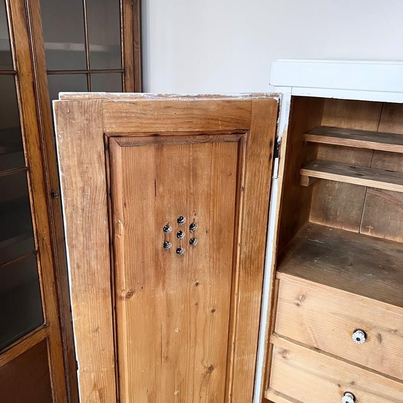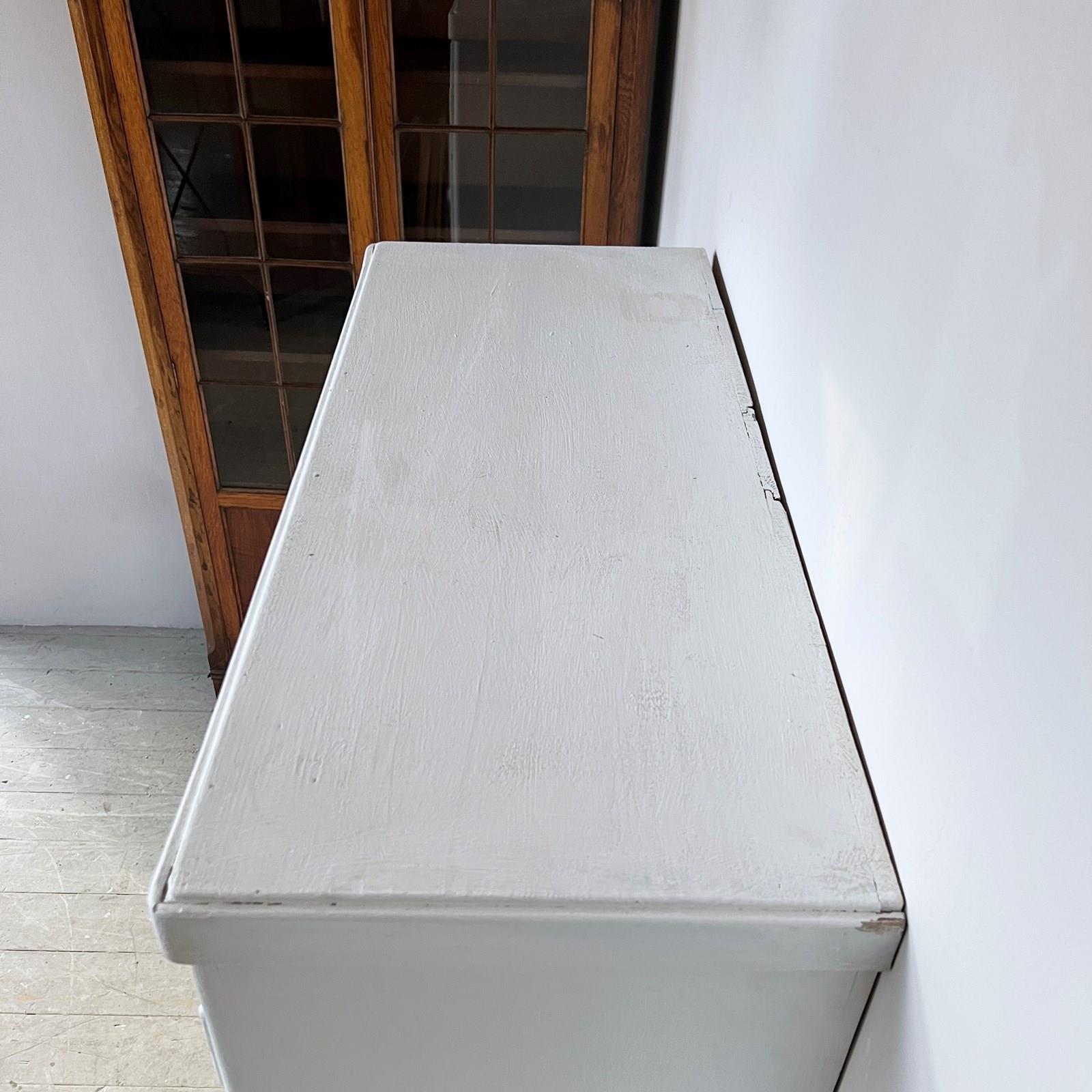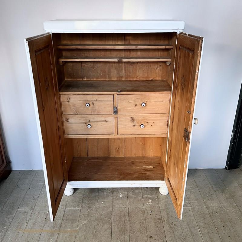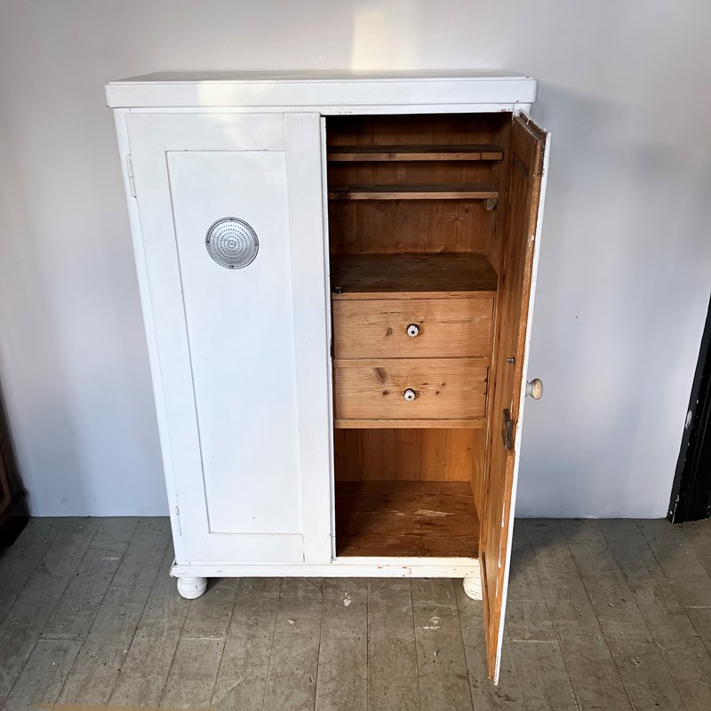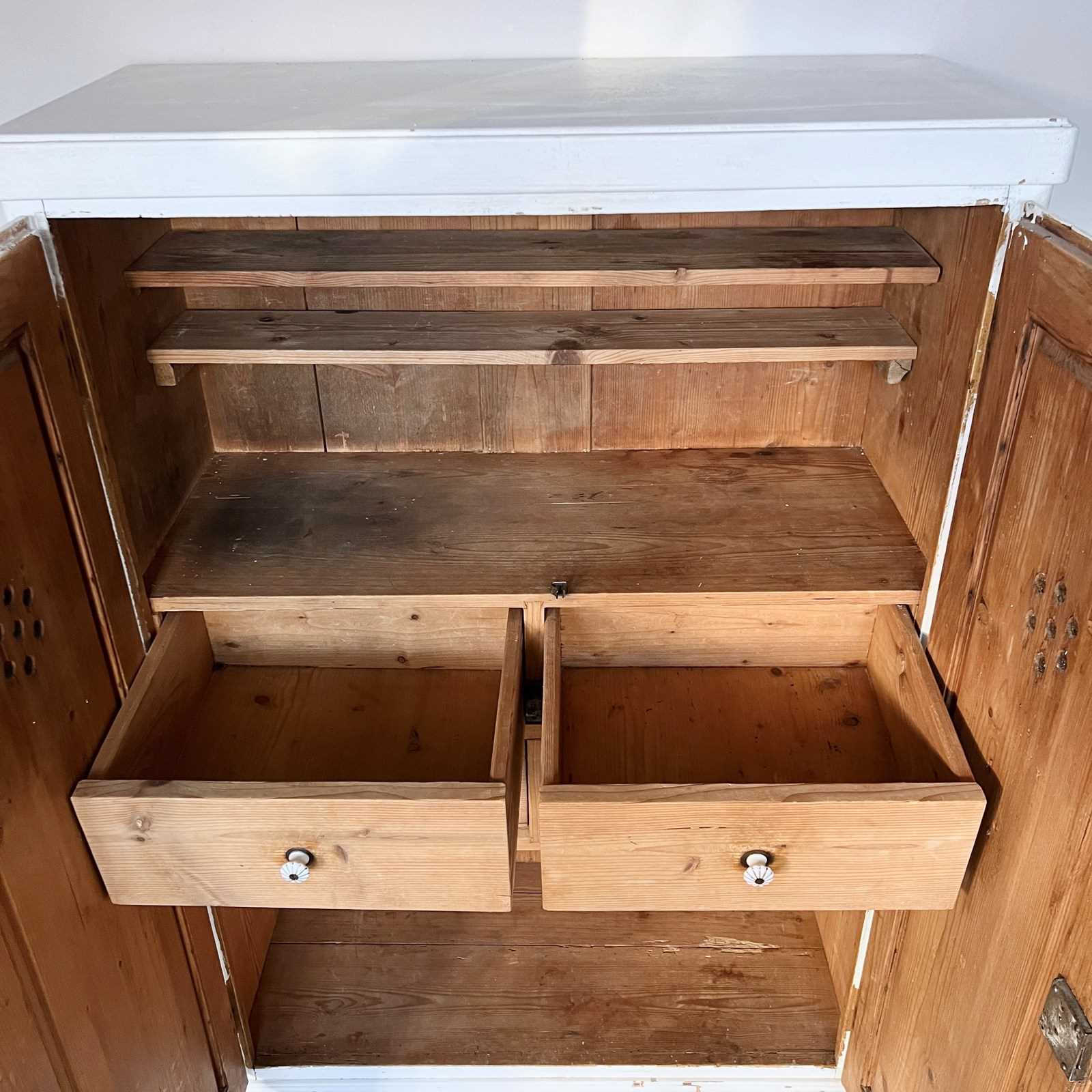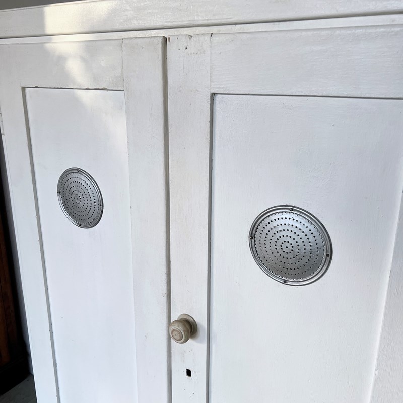 Victorian vented larder cupboard. The cupboard stands on square back legs and round turned front bun feet supporting the main section. The doors have two tall thin panels with metal vents to the top. Behind the door there are two shelves to the top, a bank of four middle drawers and cupboard space below. The top has a standard graduated cornice. The exterior of the piece has been previously painted in a white chalk paint. This could be repainted or stripped back at an additional cost.