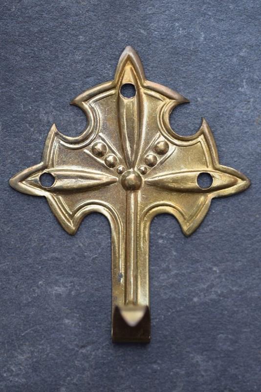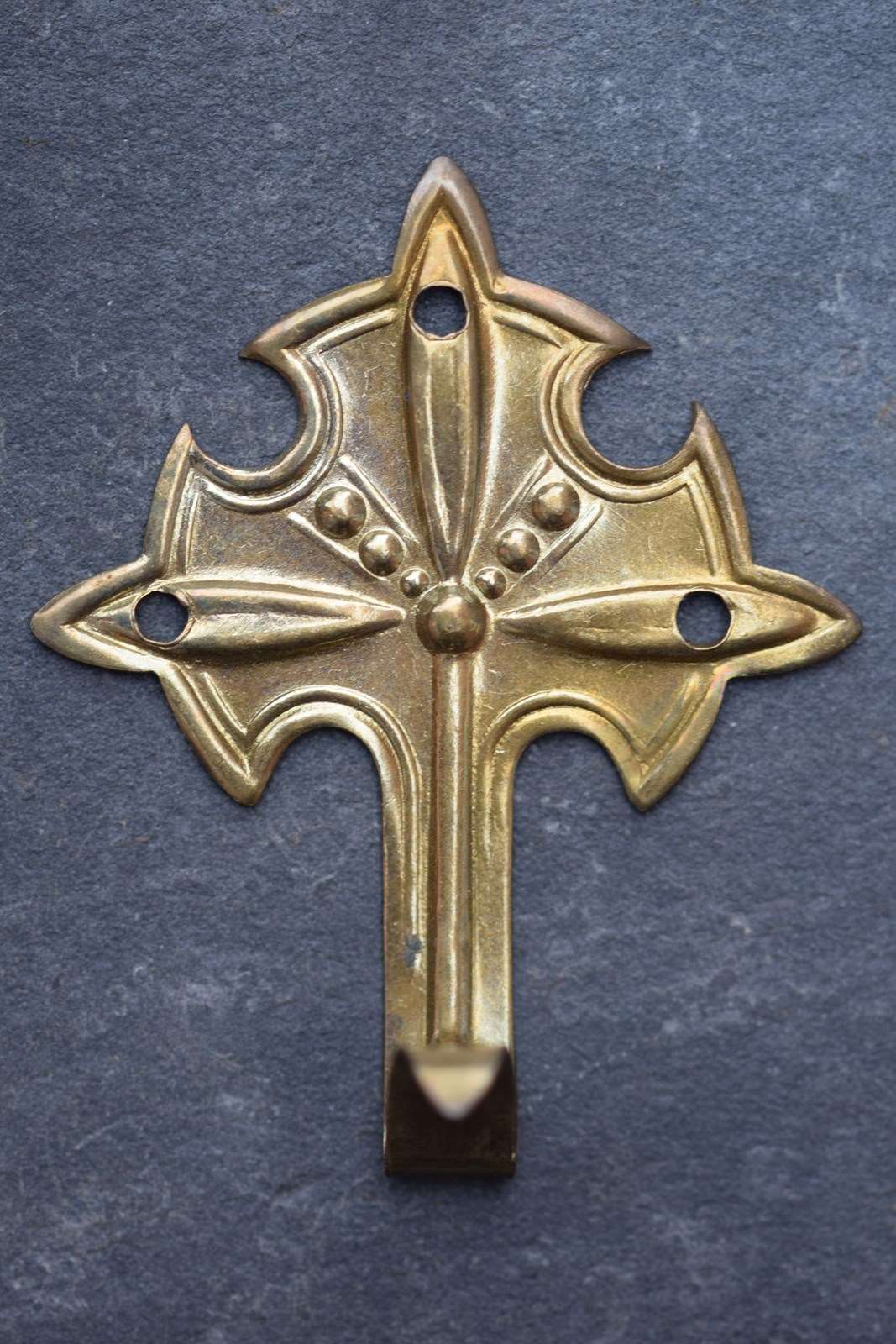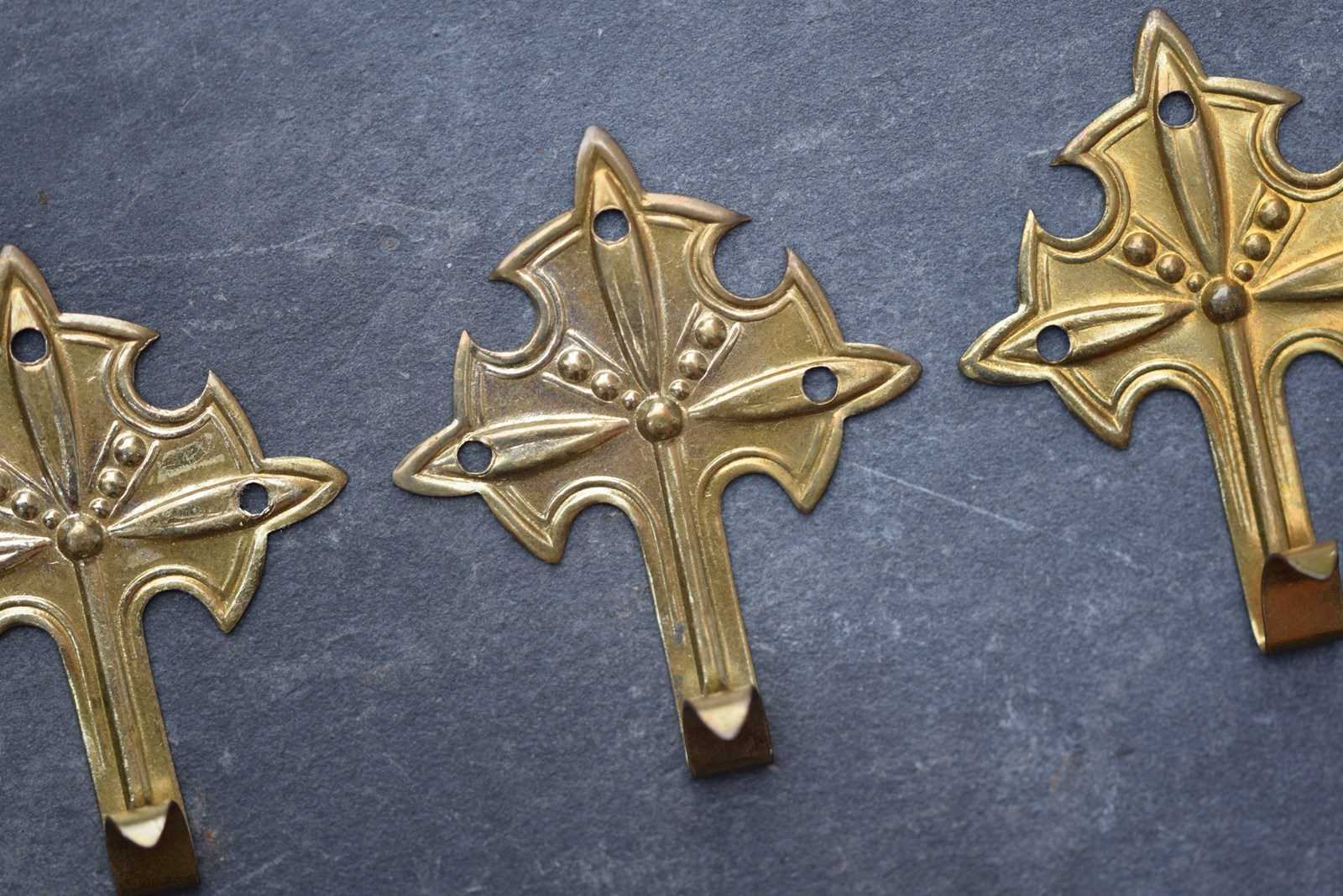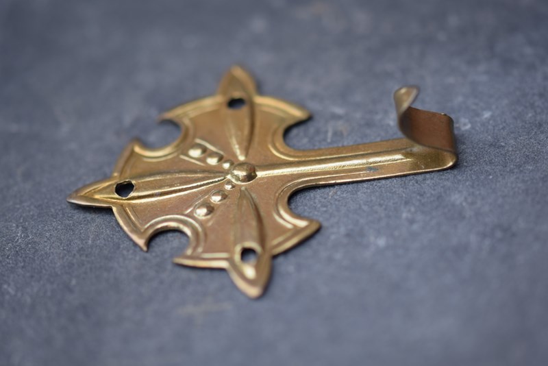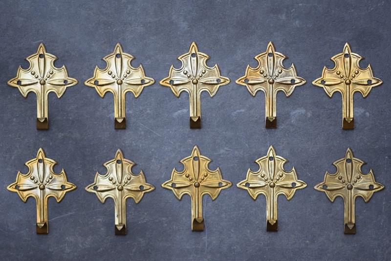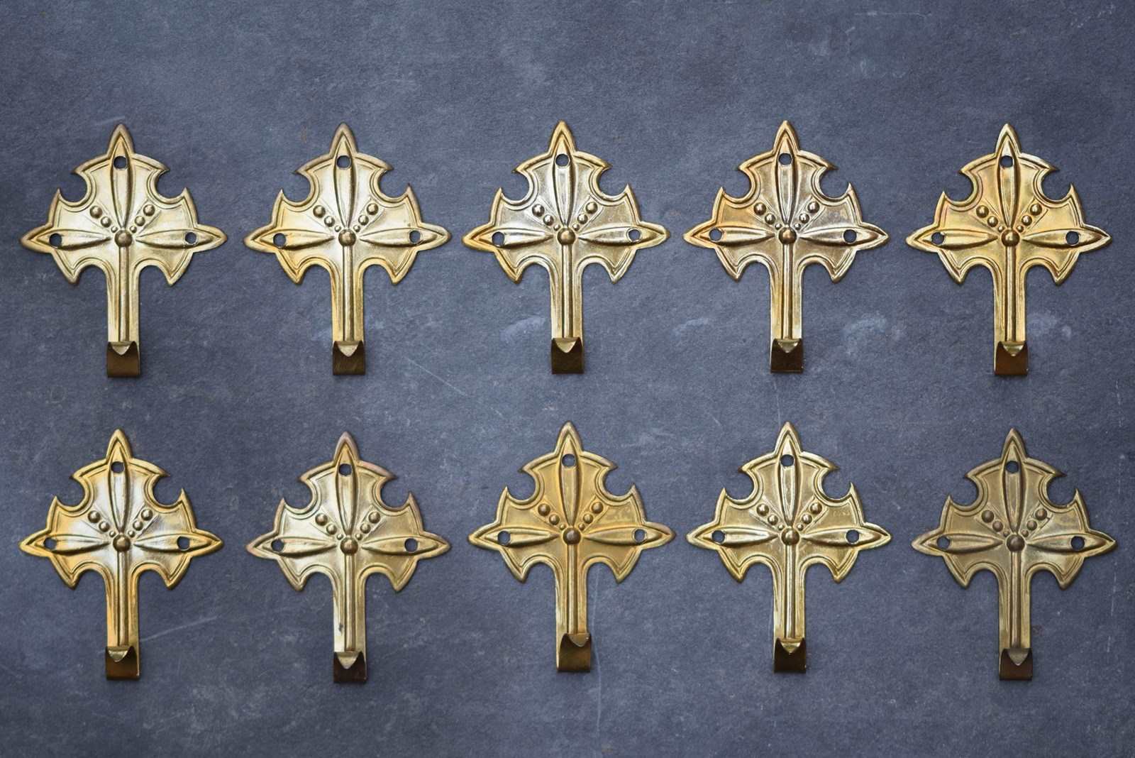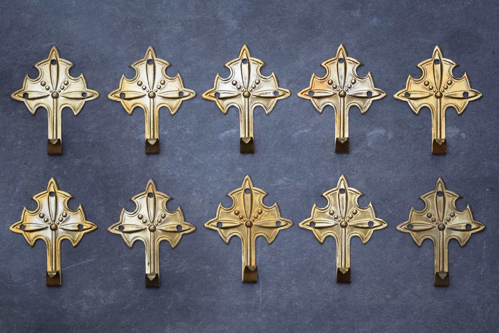Set of ten early 1900s pressed brass wall mounted picture hanging hooks, appear unused. Each approximately 2" x 1.75". In very good condition. Rare to see a good matching set such as these. UK inland tracked delivery £7. Worldwide tracked delivery is available for £22.00. Prompt dispatch, returns are happily accepted.
