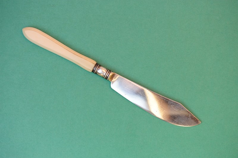 Circa 1873 English Sterling Silver Butter Knife. Hilliard & Thomason, Birmingham. Ivorine handle. Overall length 7.25 inches. Overall weight 27g. Clean. Good useable condition. Sale includes UK delivery.