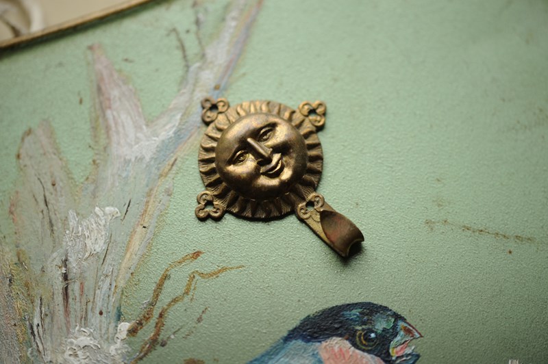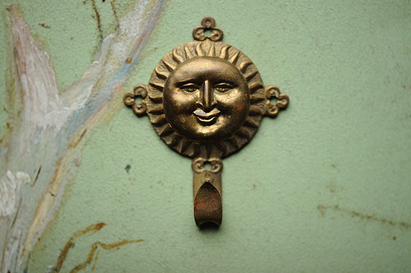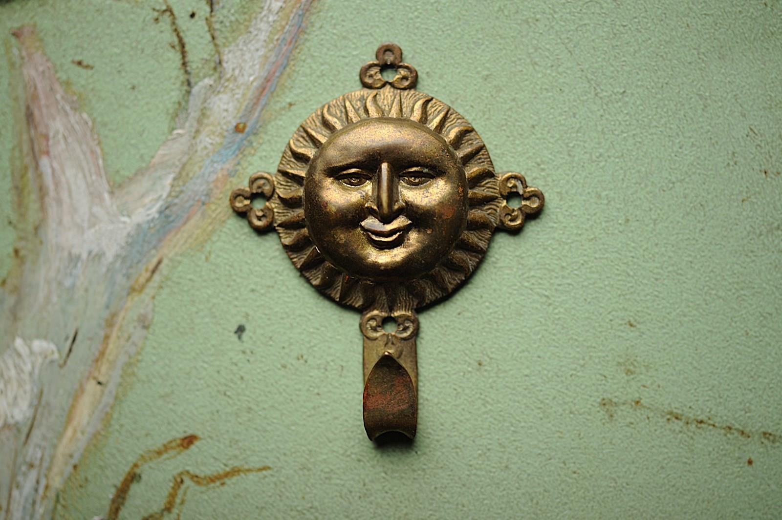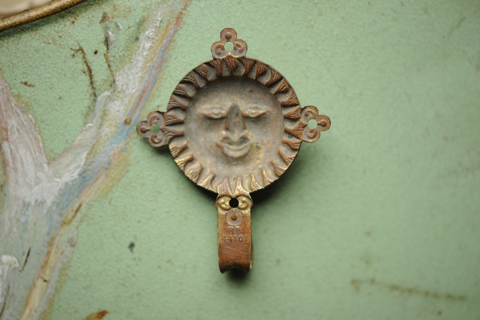 An ornate English c1886 brass wall mounted picture hook depicting the Sun.