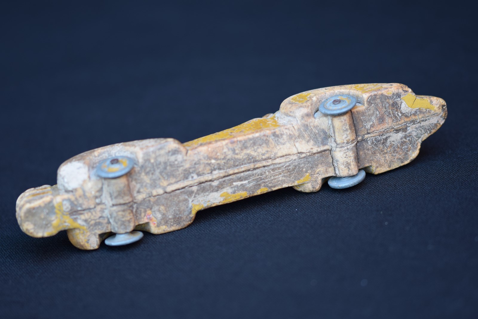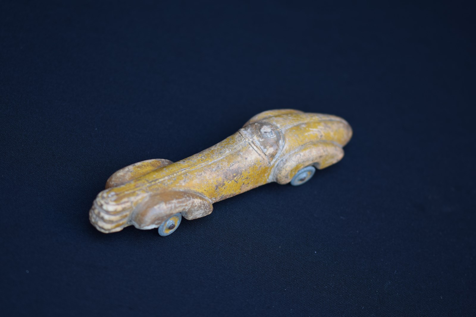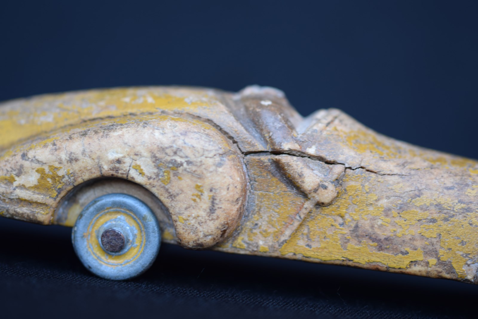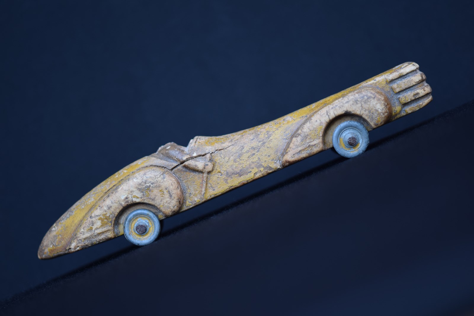 An extremely rare French c1930 Platre et Farine Model Land Speed Car. Length 7 inches or 18 cm. Original untouched condition. Drivers head missing, which was probably almost inevitable considering the construction material. It maybe possible the drivers head could be remodelled? Displays well, rare find. Sale includes UK inland tracked delivery. It will be packed well.
