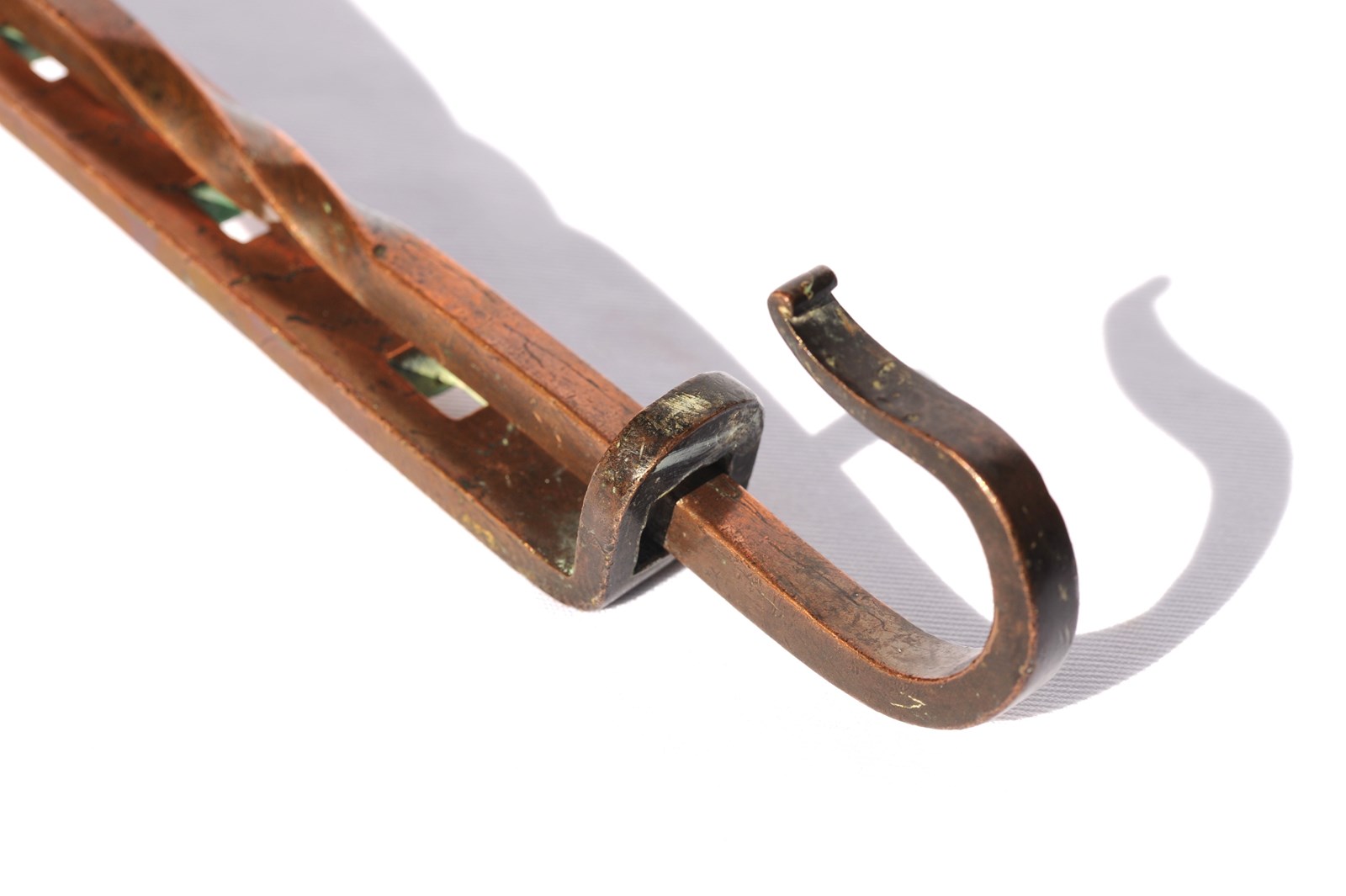 An English mid 19th century extending country kitchen copper hook & bracket. Shortest height 11.5 inches, fully extended is 17.75 inches. Five adjustable settings between these two measurements. High quality piece with heavy gauge copper, weighs well over half a kilo. Good overall original condition. Sale includes UK inland tracked delivery.