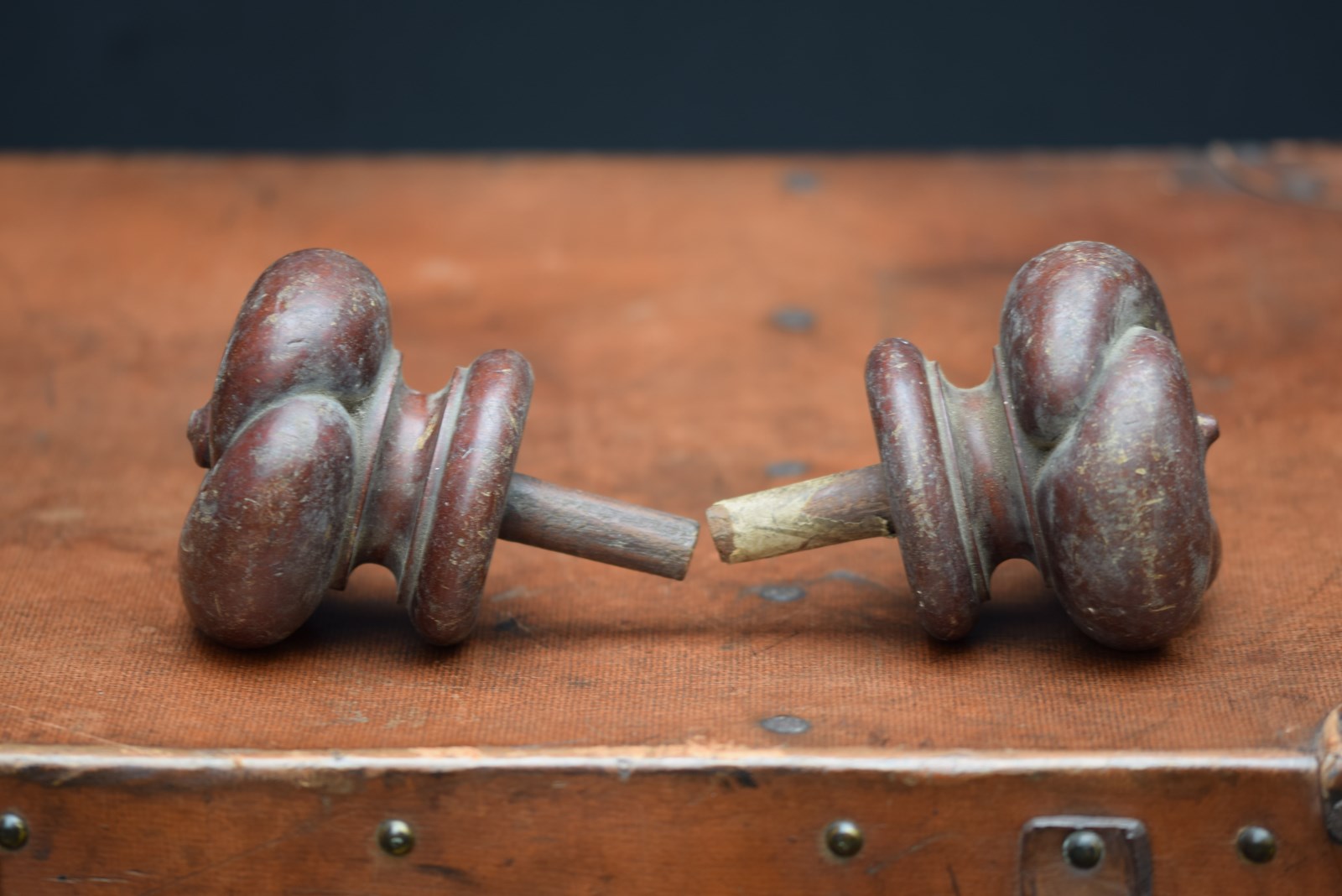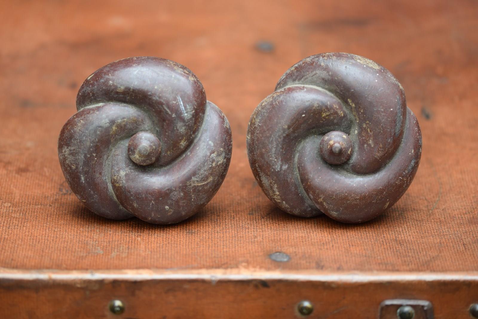 A pair of English late 19th century hand carved Mahogany curtain pole finials in old untouched good overall condition. Approximately 4 inches in diameter (10 cm) with a fitted projection of 3 inches (8 cm). Free UK inland tracked delivery. Returns are happily accepted.