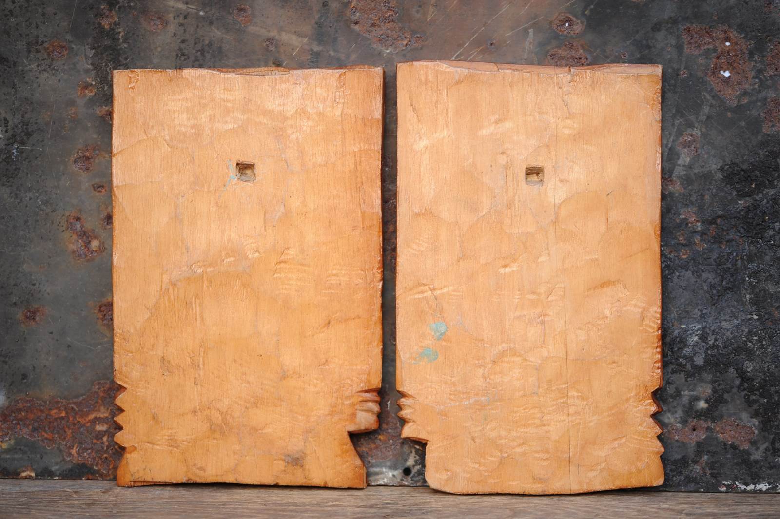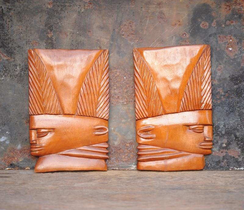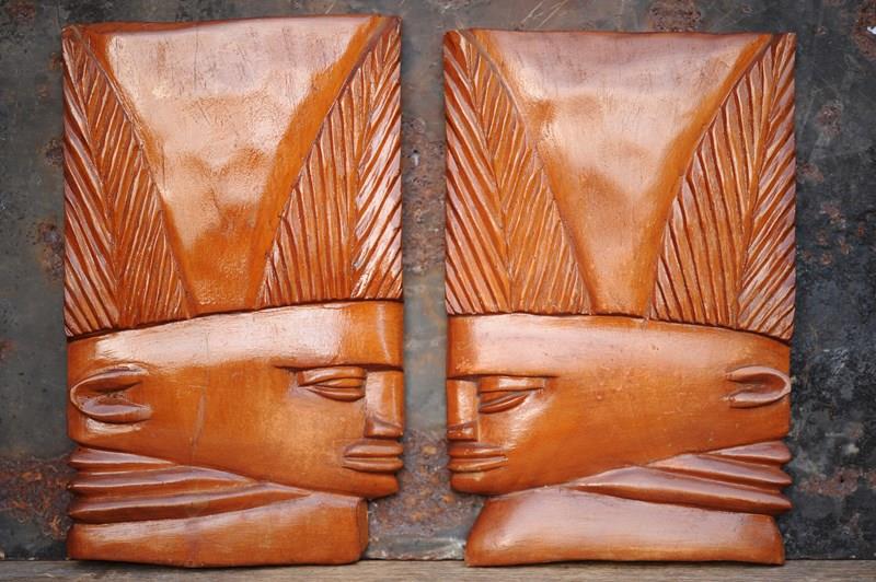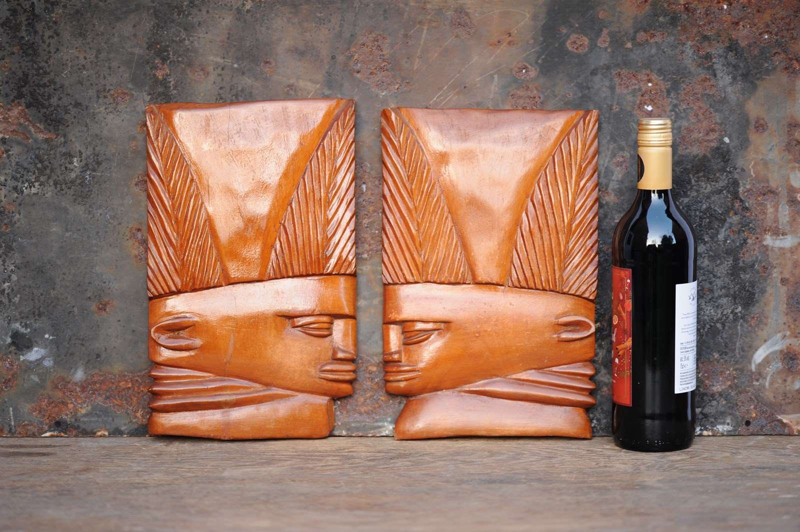 A striking pair of mid 20th-century hand carved African geometric wall mounted wooden plaques. Ideal for positioning either side of a doorway. Each measure approximately 12" x 7.5" x 1". Some age related marks, wear & losses. Display beautifully. Sale is for the pair & includes delivery within the United Kingdom. Any questions please do not hesitate to ask.