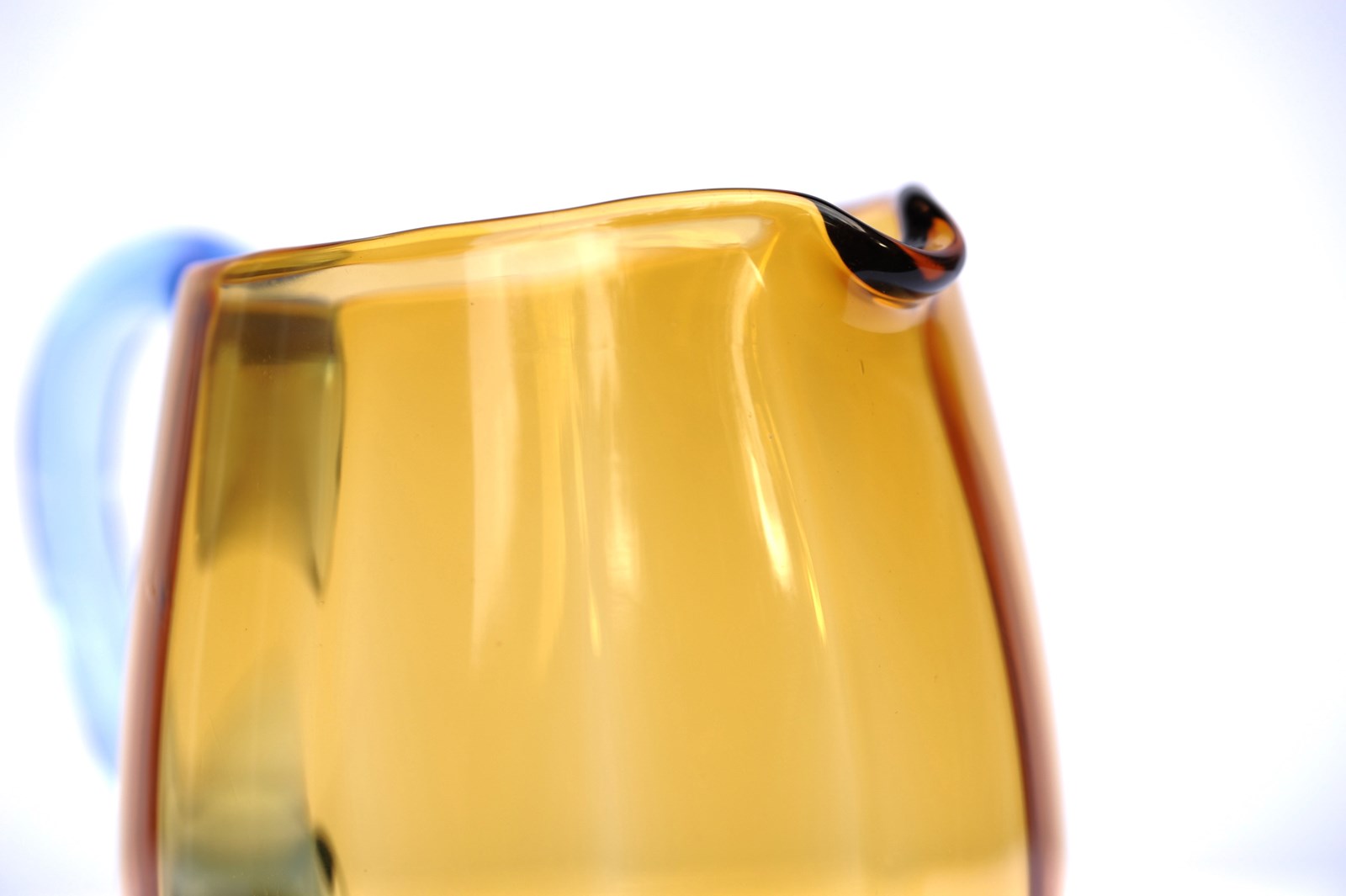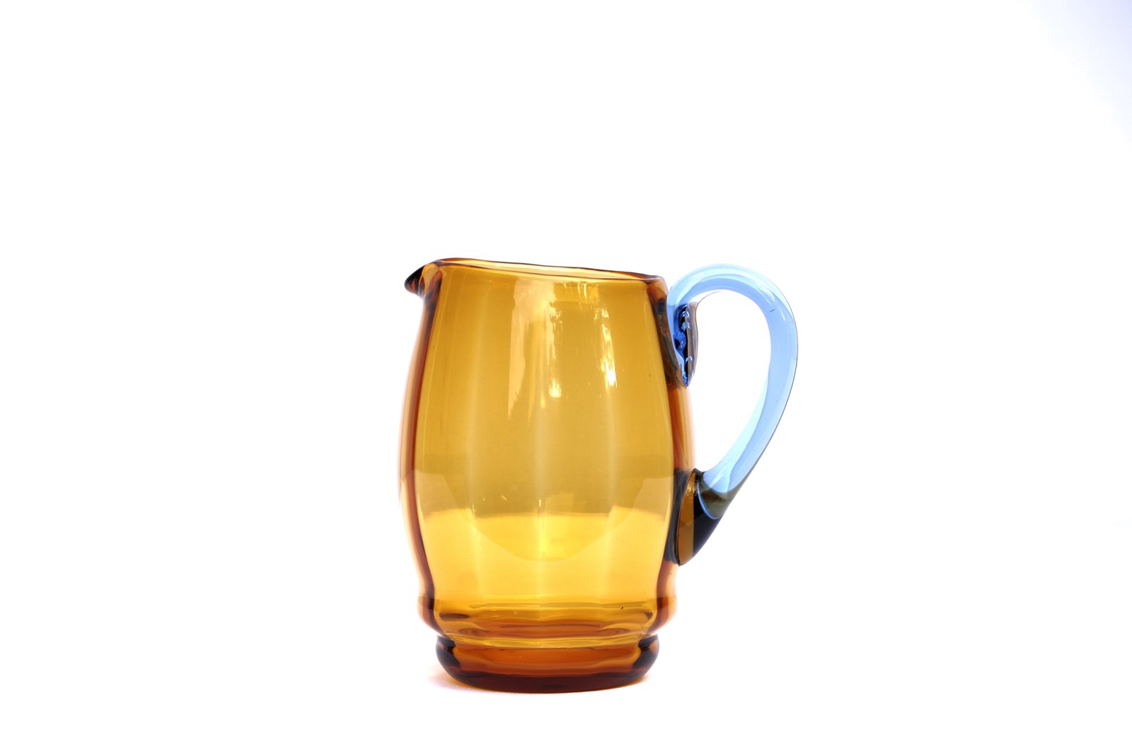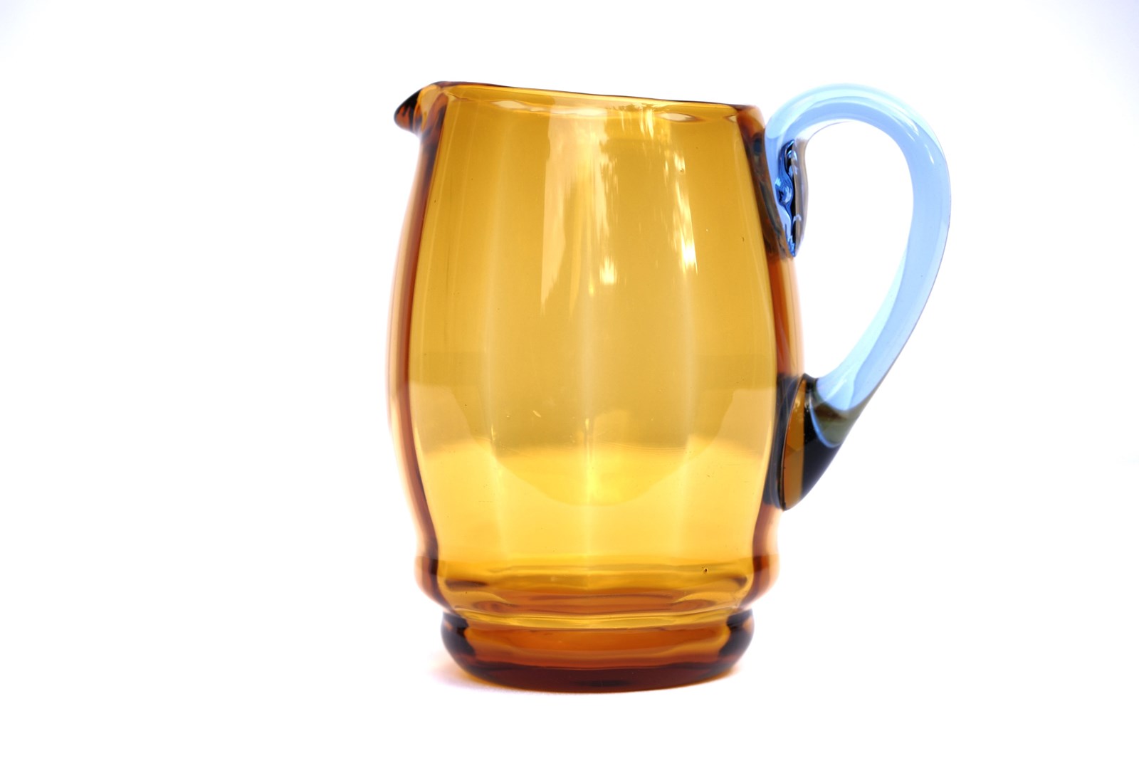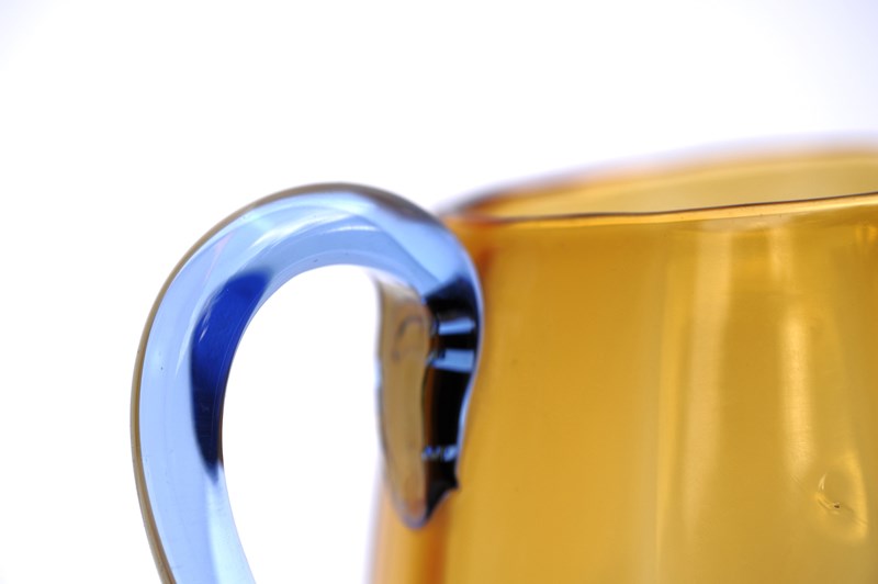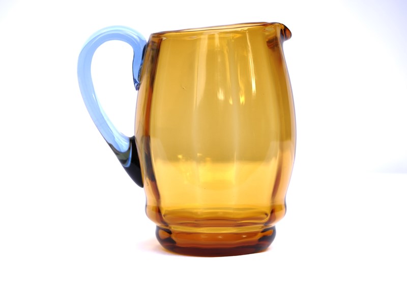Unique Amber & Blue handled Glass Jug. Circa 1920-30. Height 7.5 inches. Will hold 3 pints. No chips around the rim or base, light surface use marks & natural imperfections in the glass. Good overall condition, it has clearly been looked after. Extremely pleasing to look at, quite tactile with its ribbed like interior. Highly skilled maker no doubt. Sale includes UK inland tracked delivery.