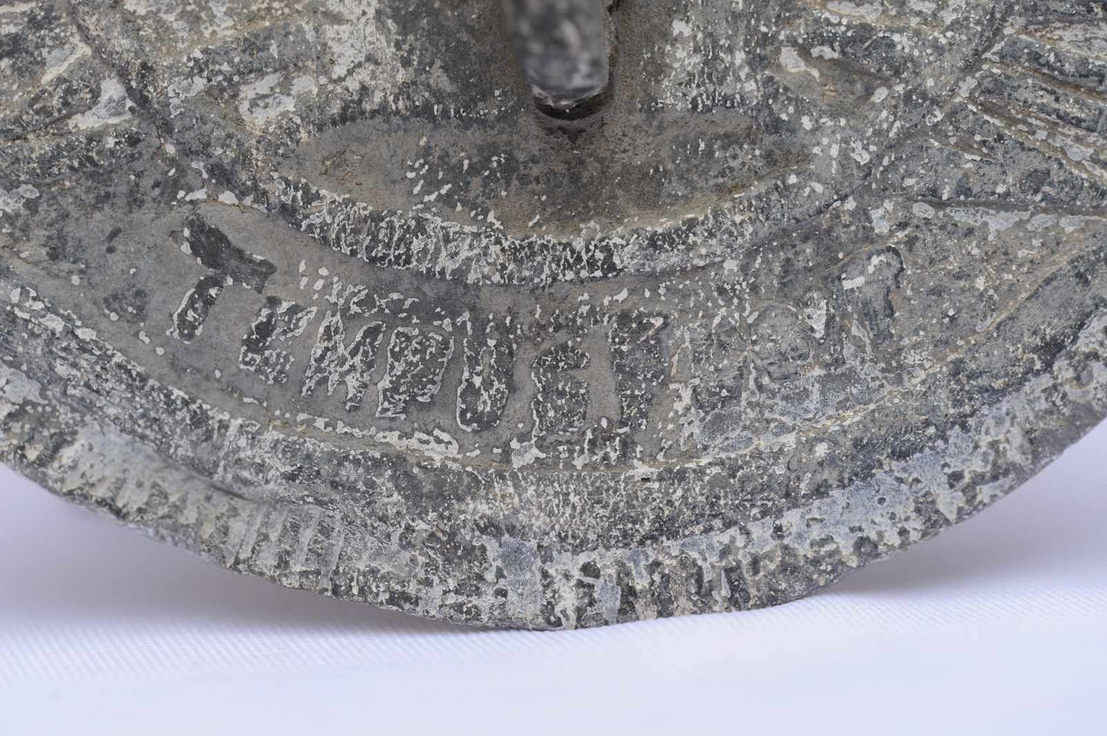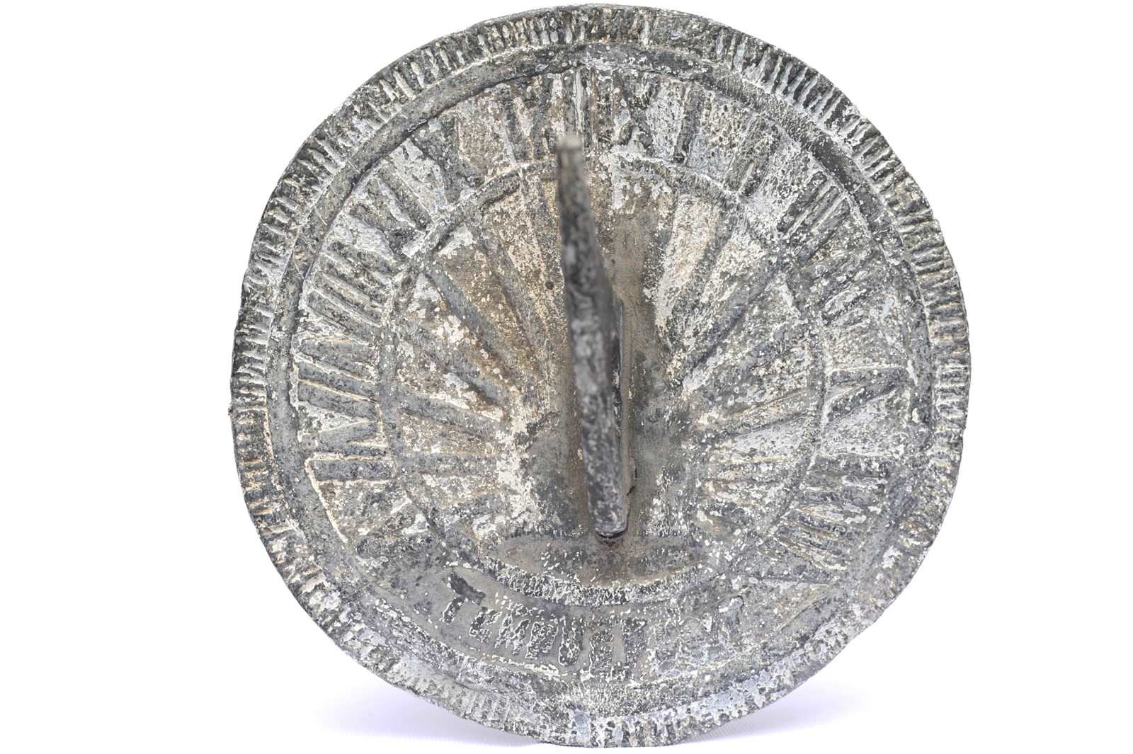Antique 19th century round Lead Garden Sundial. The diameter is six & half inches and it weighs around one kilogram. There are marks, knocks, weathering & wear etc all consistent with its age and outside garden use. Roman numerals around the edge, faintly across the bottom reads Tempus Fugit (time flies). If you require any additional images or information please do not hesitate to get in touch. The listed price includes UK inland tracked delivery.