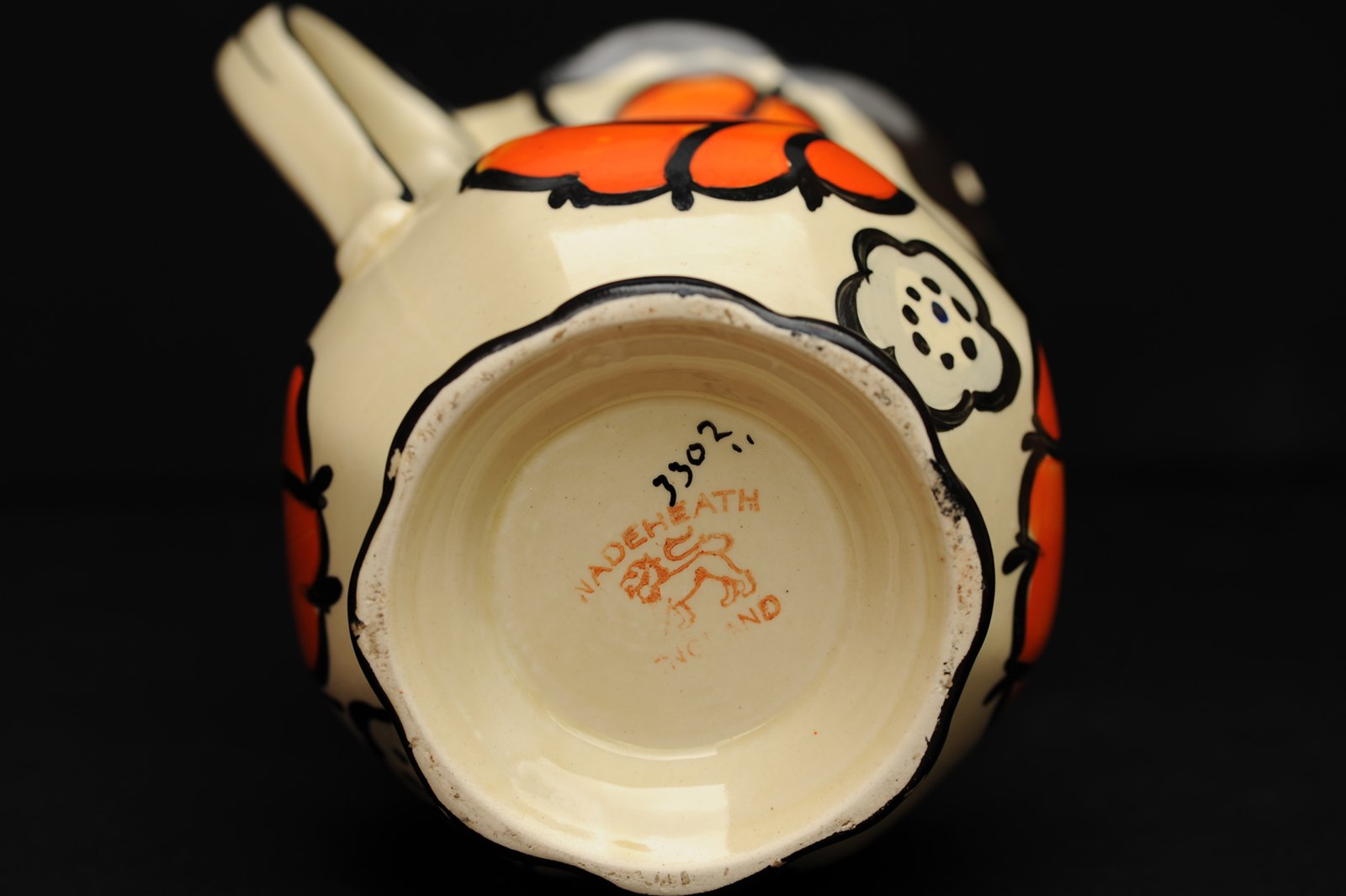 A striking Art Deco period hand painted pottery hop jug. Wade Heath circa 1930. Approximately 8 inches in height. Some historic paint loss around the rim. Good overall condition, no chips, no cracks, no repairs. Free UK delivery.