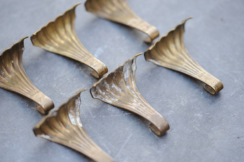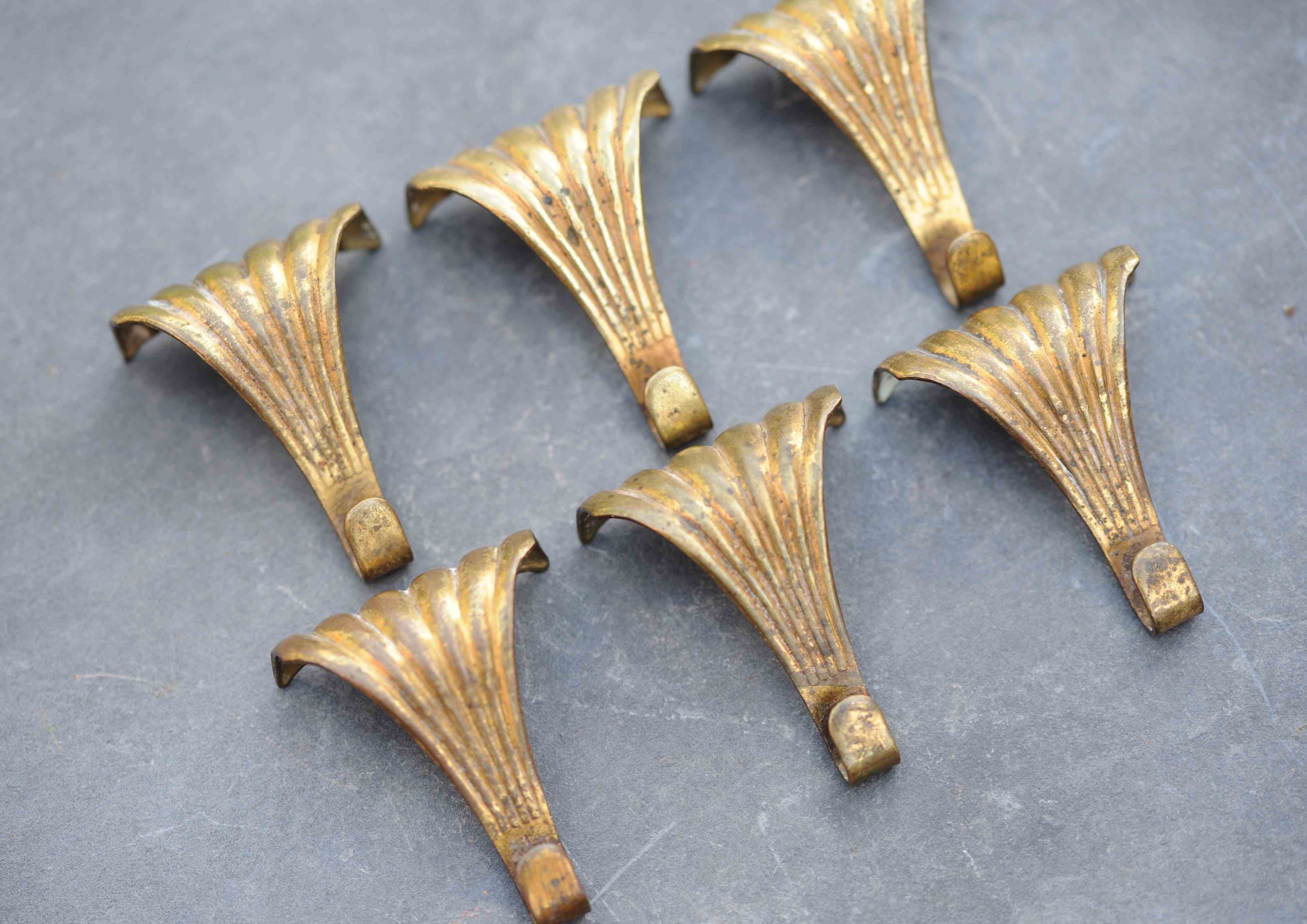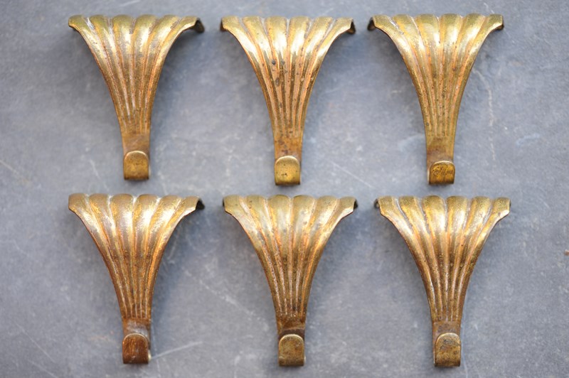 A matching set of six brass Art Nouveau period c1890 picture rail hooks. Each 50 mm x 40 mm top width. Good original untouched condition, strong hooks.