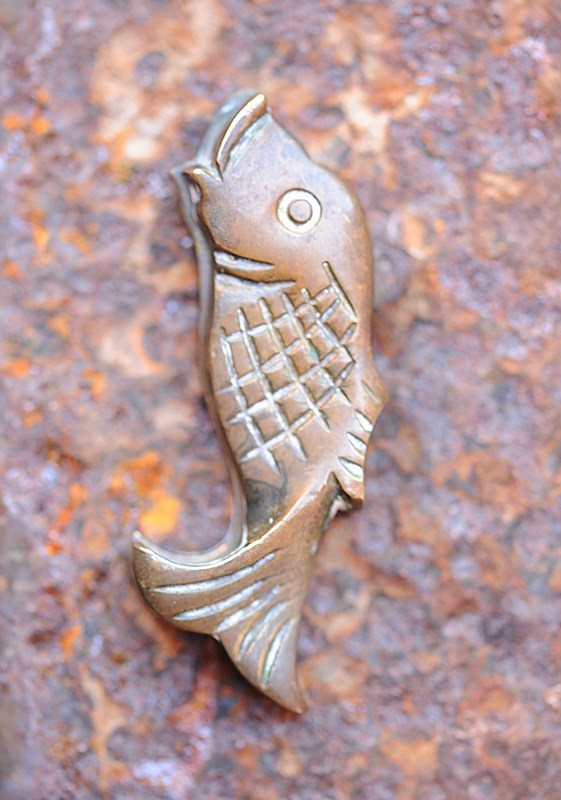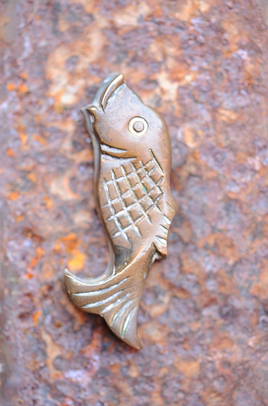 An superb & very unique English Arts & Crafts period hand made brass door escutcheon in the shape of a jumping fish. Overall height 63 mm, key access 20 mm height, distance between screw hole centres 35 mm. Extremely well made with fine detailing & now carrying a rich warm beautiful time aged patina. You could of course polish to a high shine with very little effort. Sale includes delivery within the United Kingdom. Returns are happily accepted within 5 days of arrival. We are happy to post overseas please enquire.