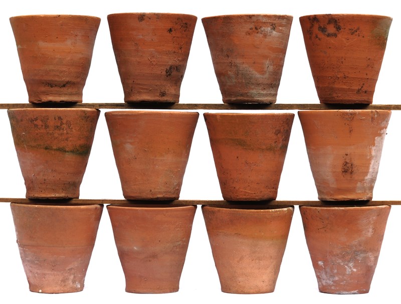 Timeless collection of twelve late 19th century English hand thrown terracotta Auricula planting pots. Approximately 4 inches in height & much the same in top diameter. Good overall cared for English garden weathered condition. A joy to use year after year. Sale includes delivery within the United Kingdom.