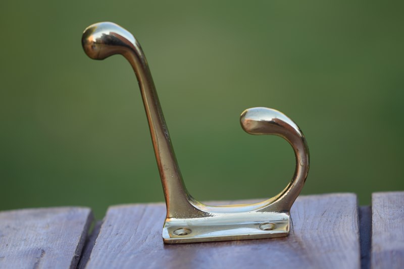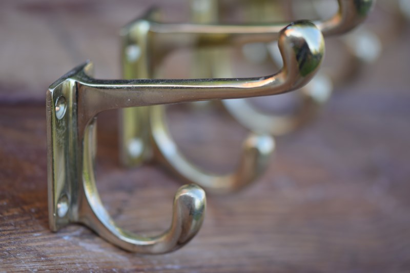Reclaimed Edwardian style solid brass coat hooks. Twenty two hooks are currently available, priced per hook. A flat UK inland delivery rate of £8.99 no matter how many hooks you purchase. Extremely well made & of very high quality. Each hook is approximately 85 mm in height with a fitted projection of 86 mm, the back plates are 50 mm x 35 mm. Good weight per hook at around 125 grams. Good overall used clean reclaimed condition, no screws are supplied. Returns are happily accepted. When getting in touch, please advise quantity of coat hooks needed. A discount is available for purchases over ten hooks.