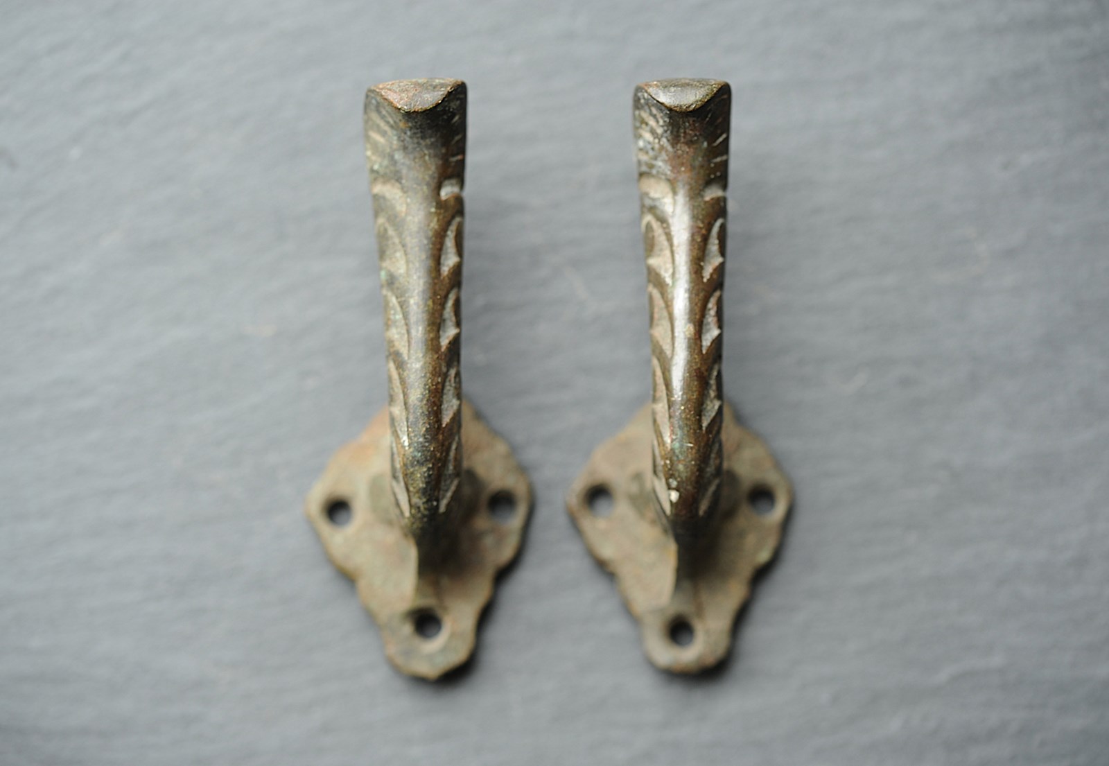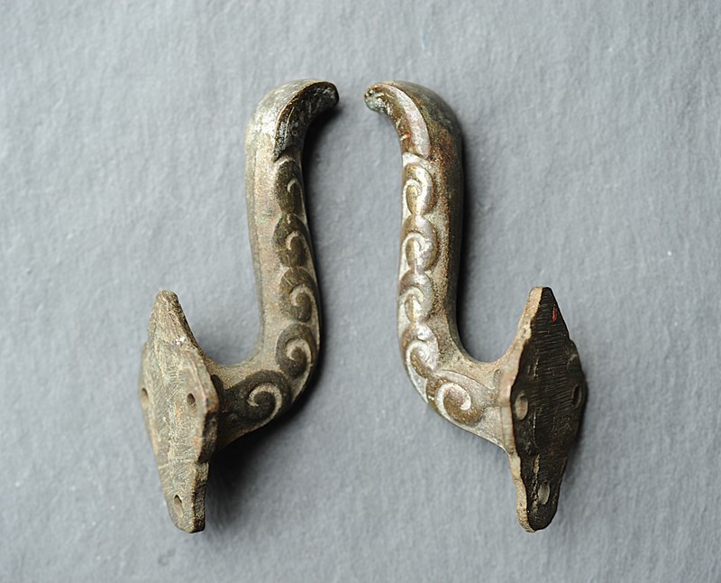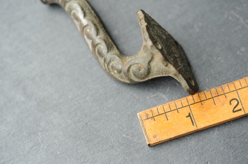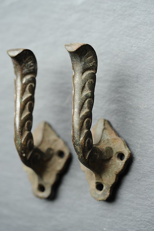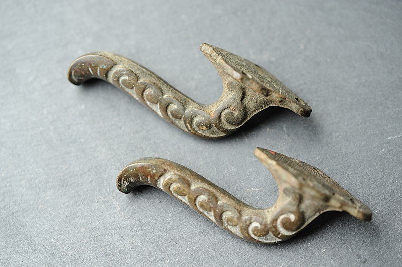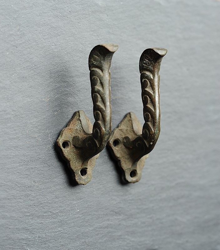 Exceptionally rare to find circa 1870 English Bronze Curtain Tie Back Hooks. Pair of. In totally original untouched condition, now carry the most superb natural time aged verdigris colour. Height just shy of 4 inches with a fitted projection of around 2 inches. Weighty at around a third of a kilo the pair. Sale is for the pair & includes delivery within the United Kingdom.
