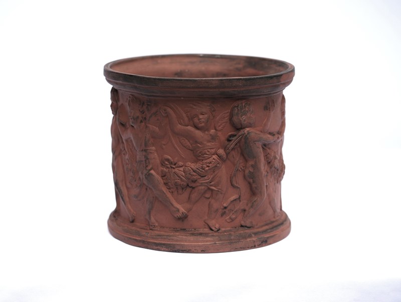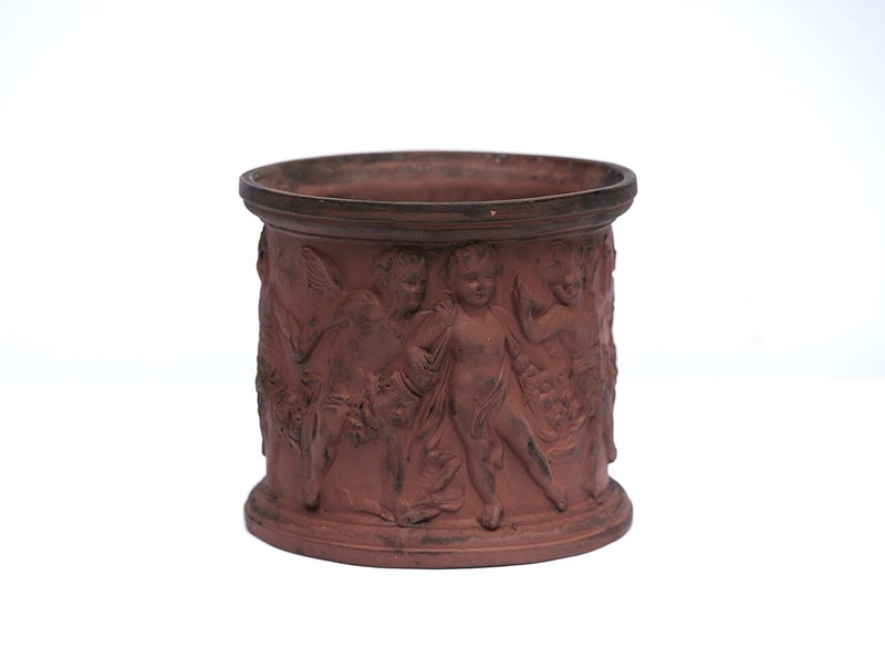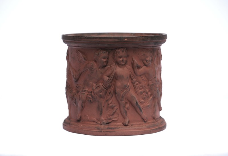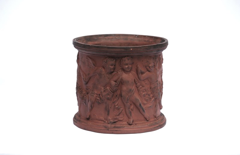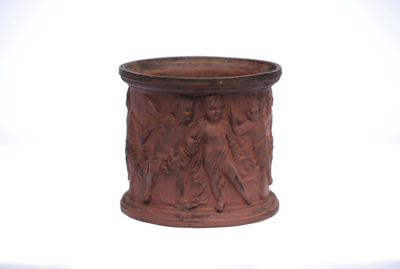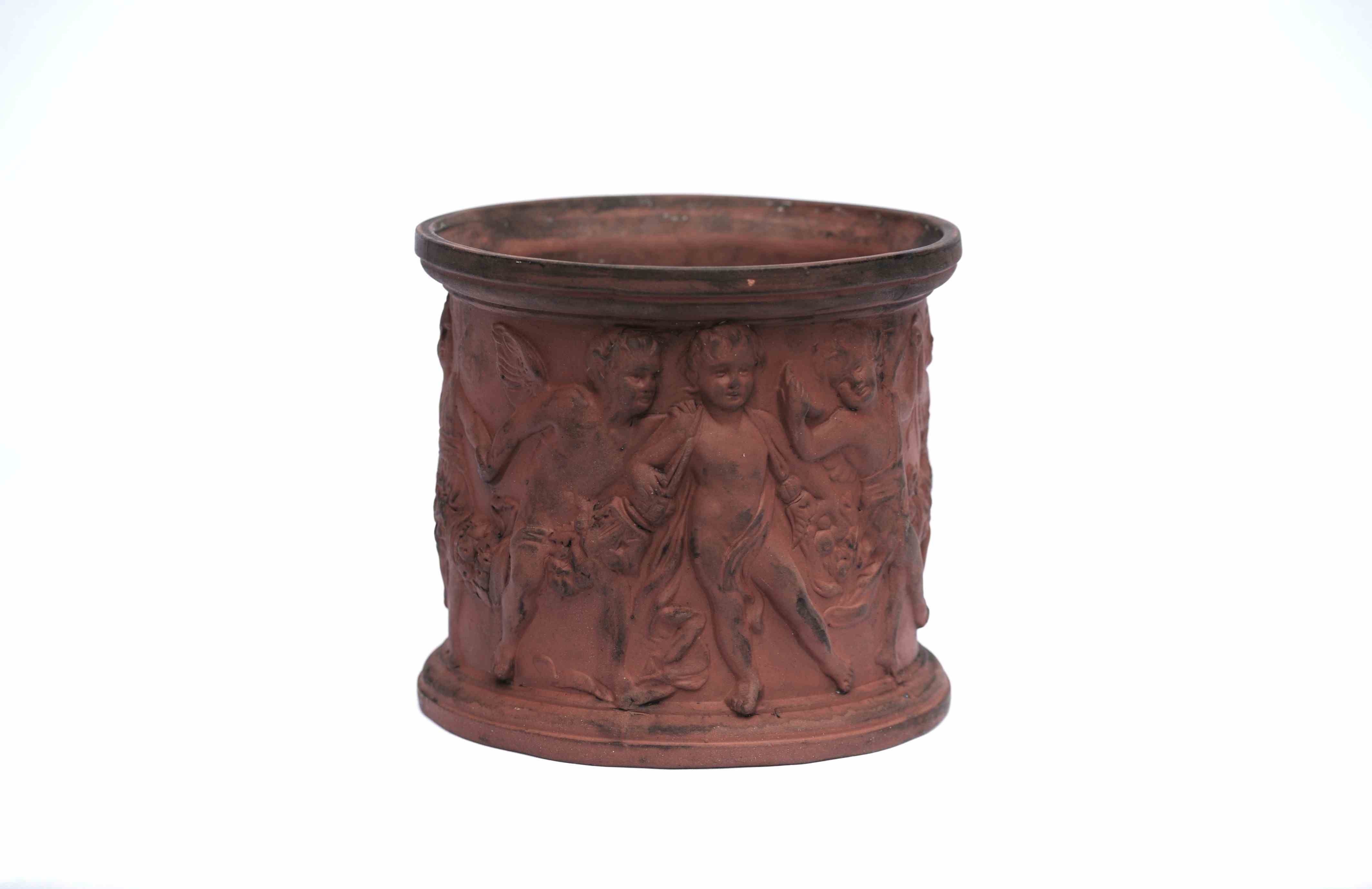 An outstanding Antique Art Pottery terracotta indoor cache pot with an ornate decoration of cherubs. English circa 1920. In superb condition, possibly unused, recently found in an old house loft in Cambridge. Height 8 inches. Width 9 inches. Sale includes delivery within the United Kingdom.