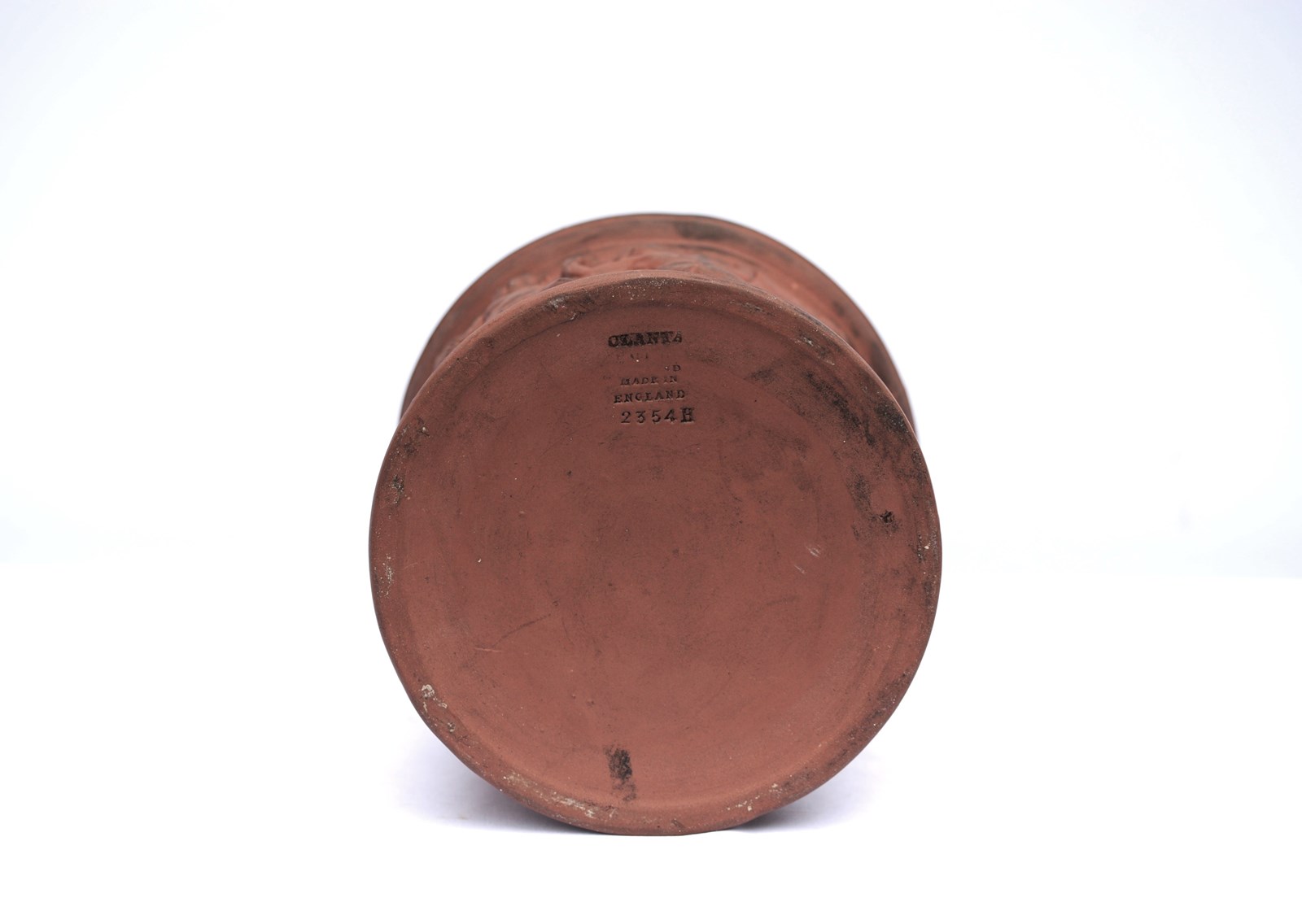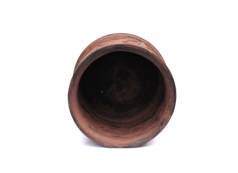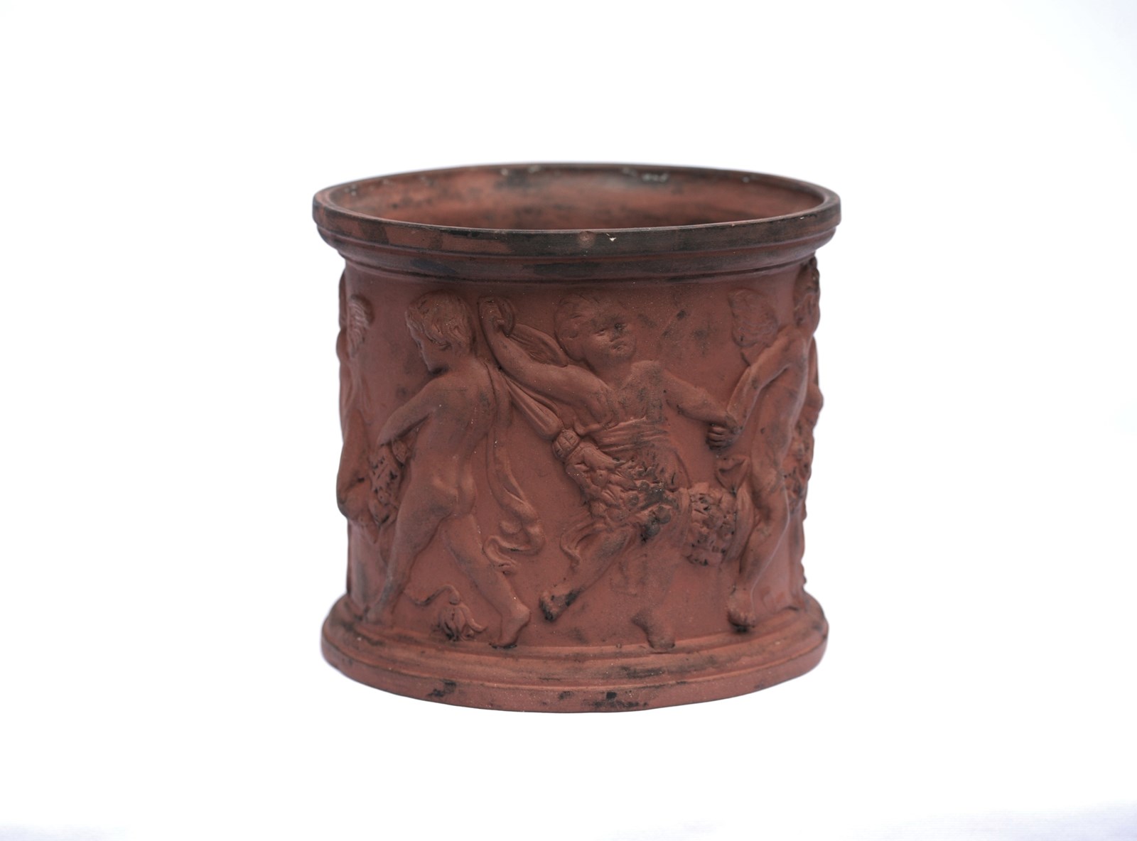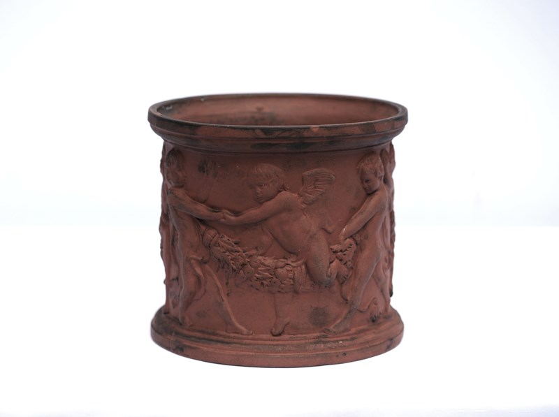 An outstanding Antique Art Pottery terracotta indoor cache pot with an ornate decoration of cherubs. English circa 1920. In superb condition, possibly unused, recently found in an old house loft in Cambridge. Height 8 inches. Width 9 inches. Sale includes delivery within the United Kingdom.