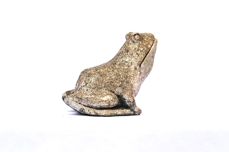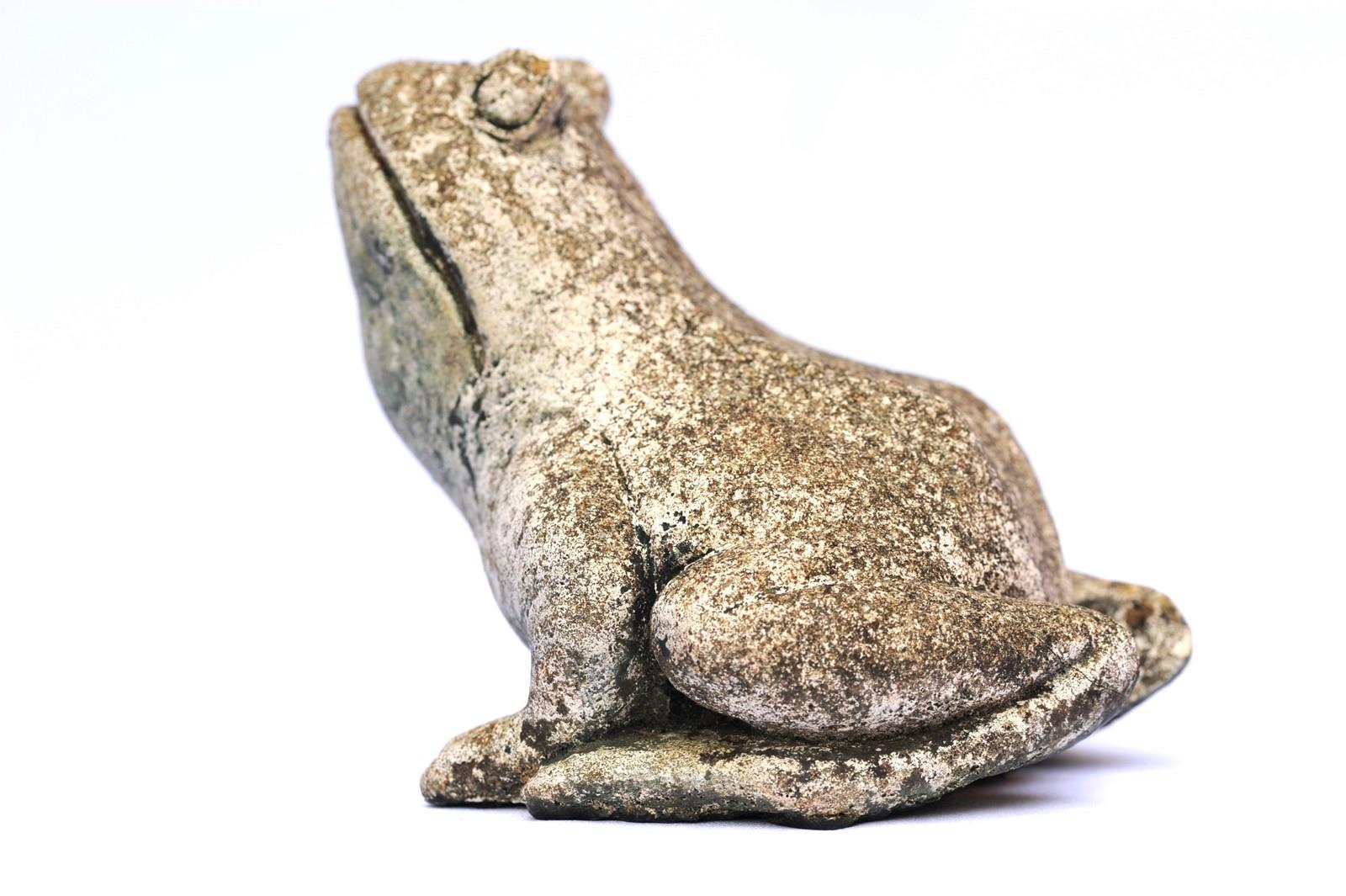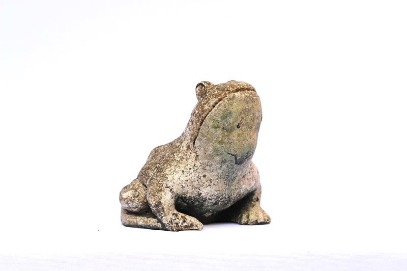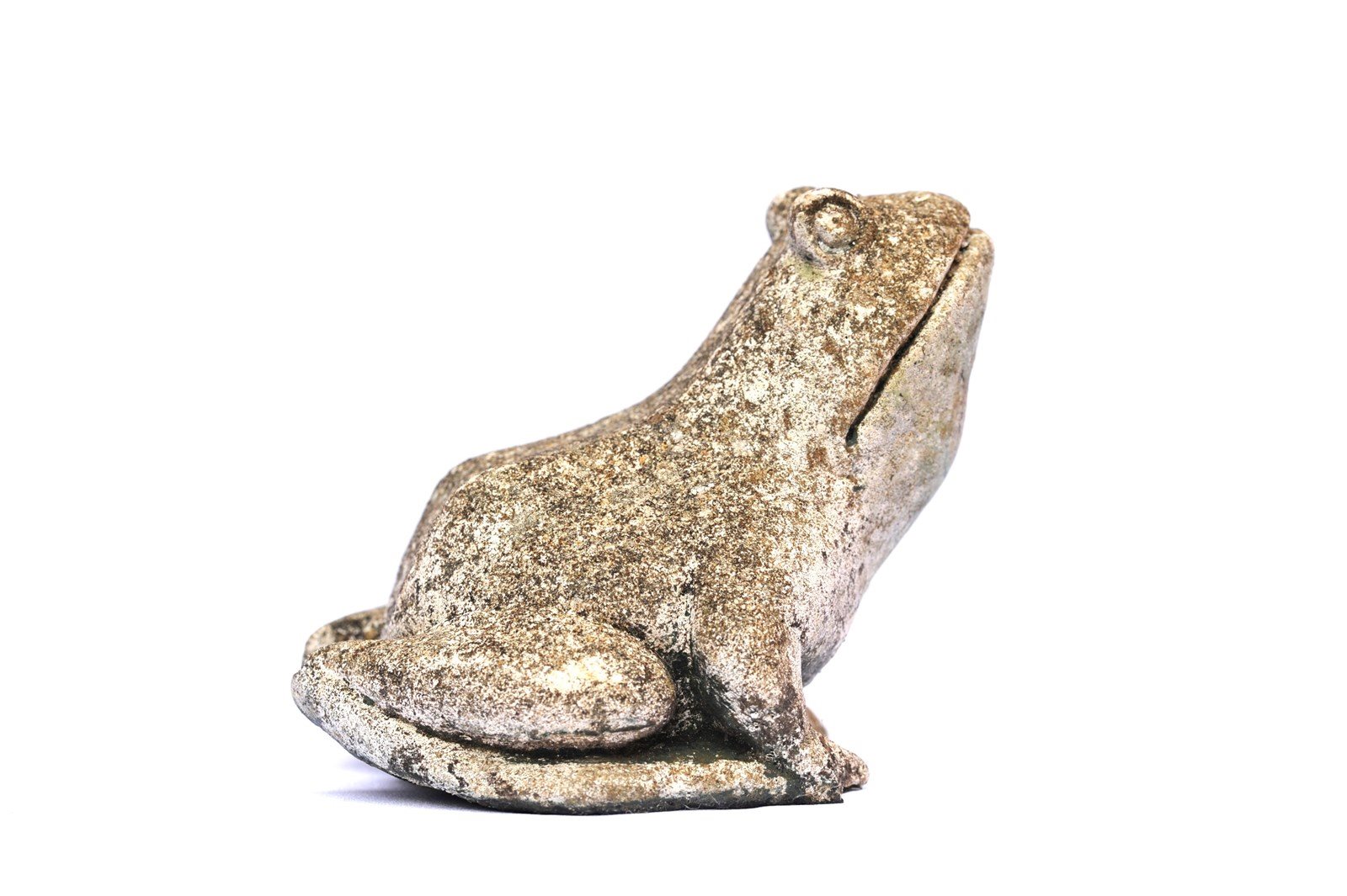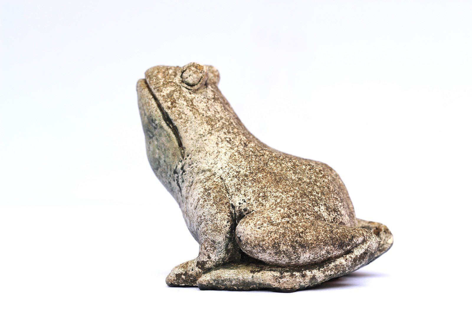 Vintage cast stone frog garden ornament. Weathered with historic knocks & wear. Height 5 inches. Weight: 1.5 kg. Free UK inland delivery.